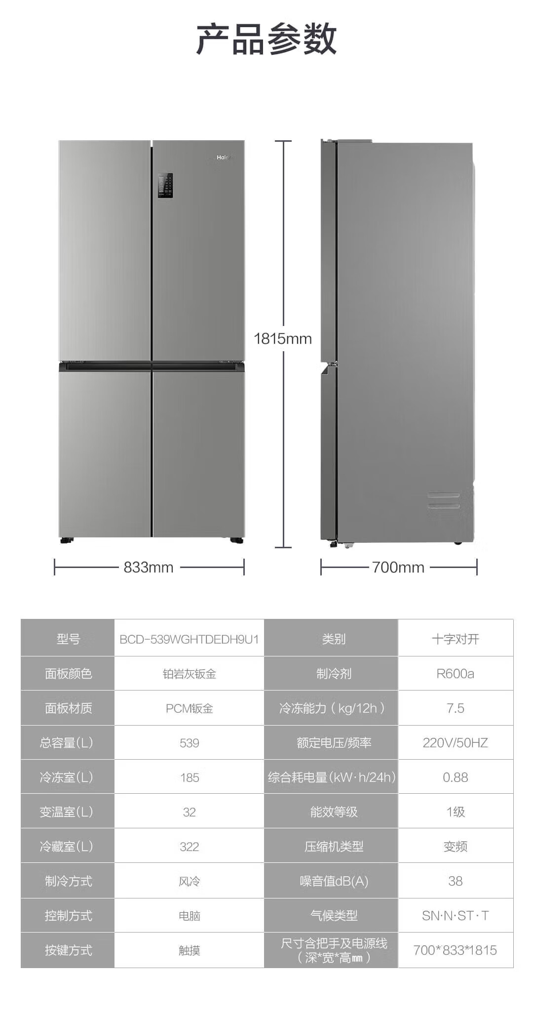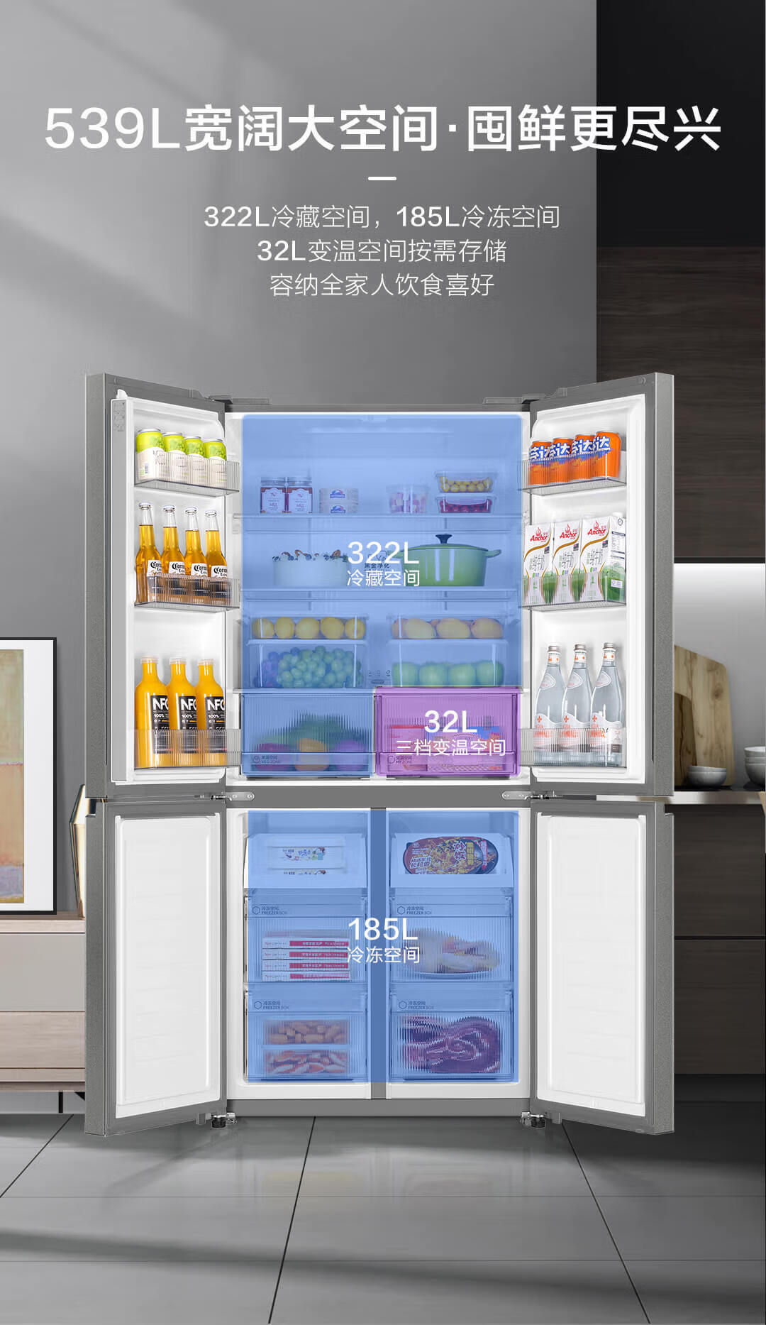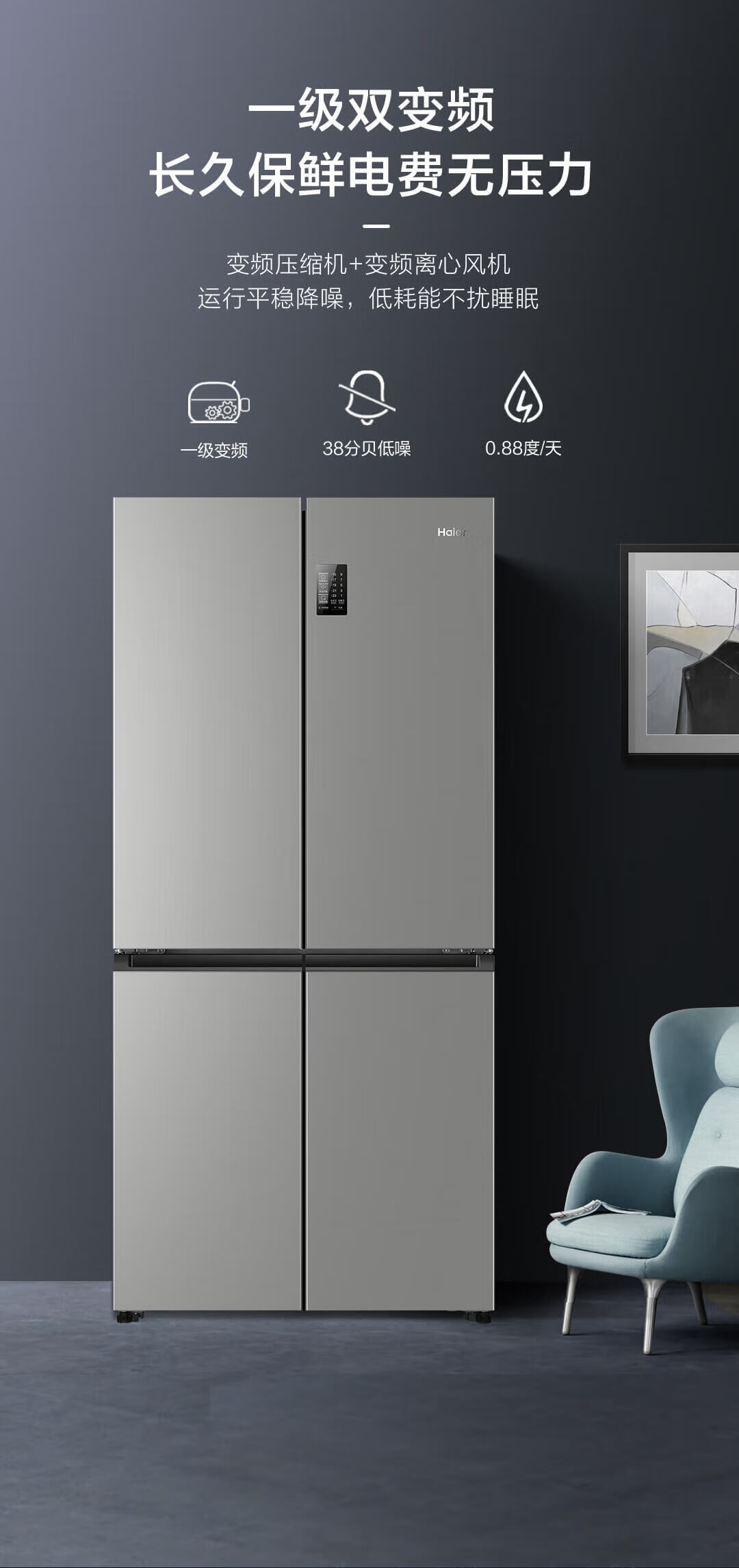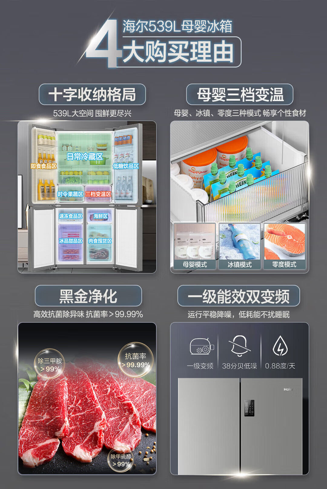 海尔(Haier)【新品】冰箱四开门539升风冷无霜一级能效双变频节能省电环超大容量双开门十字对开门超薄电冰箱 539升+母婴变温空间+黑金净化除菌+wifi智控