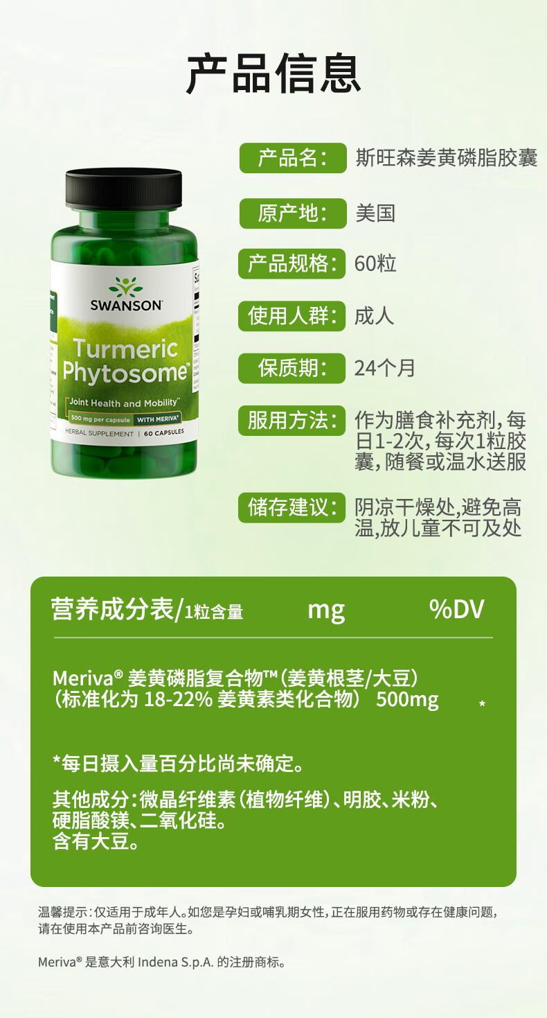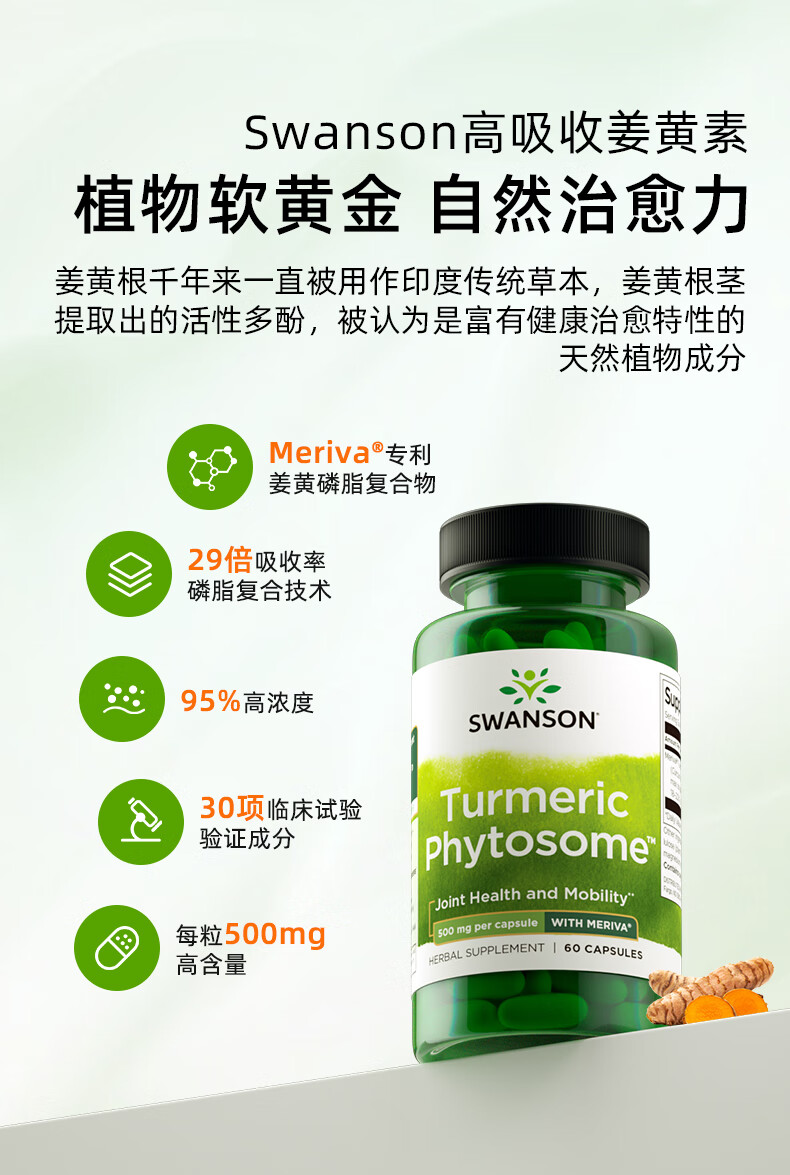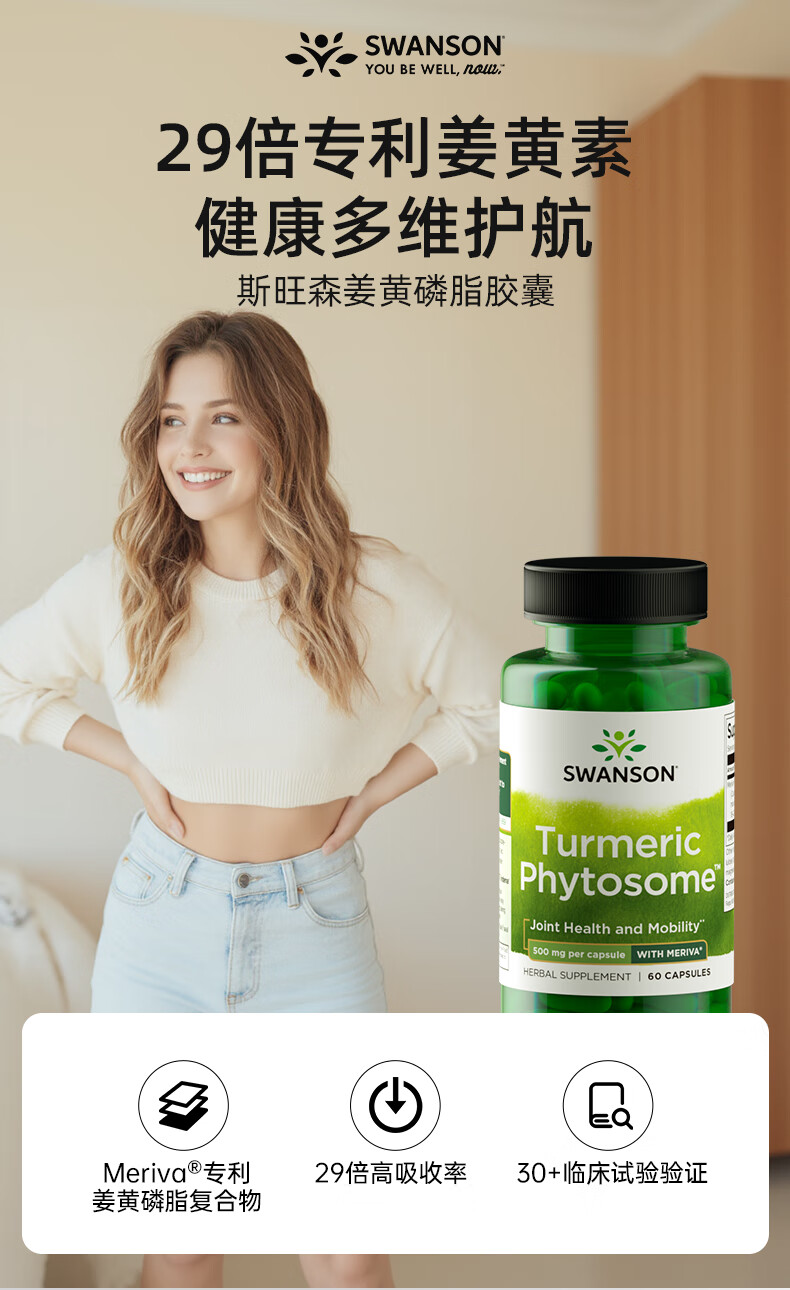 斯旺森美国Meriva专利 29倍高吸收护关节肝代谢 姜黄磷脂胶囊 60粒/瓶