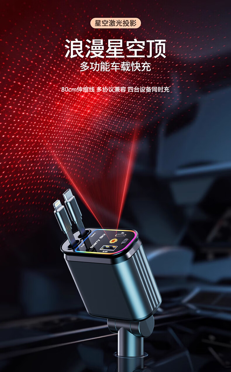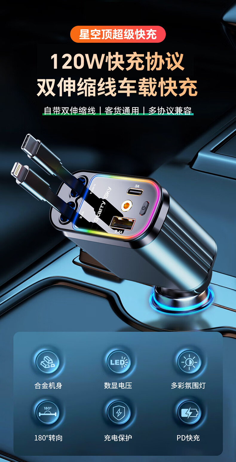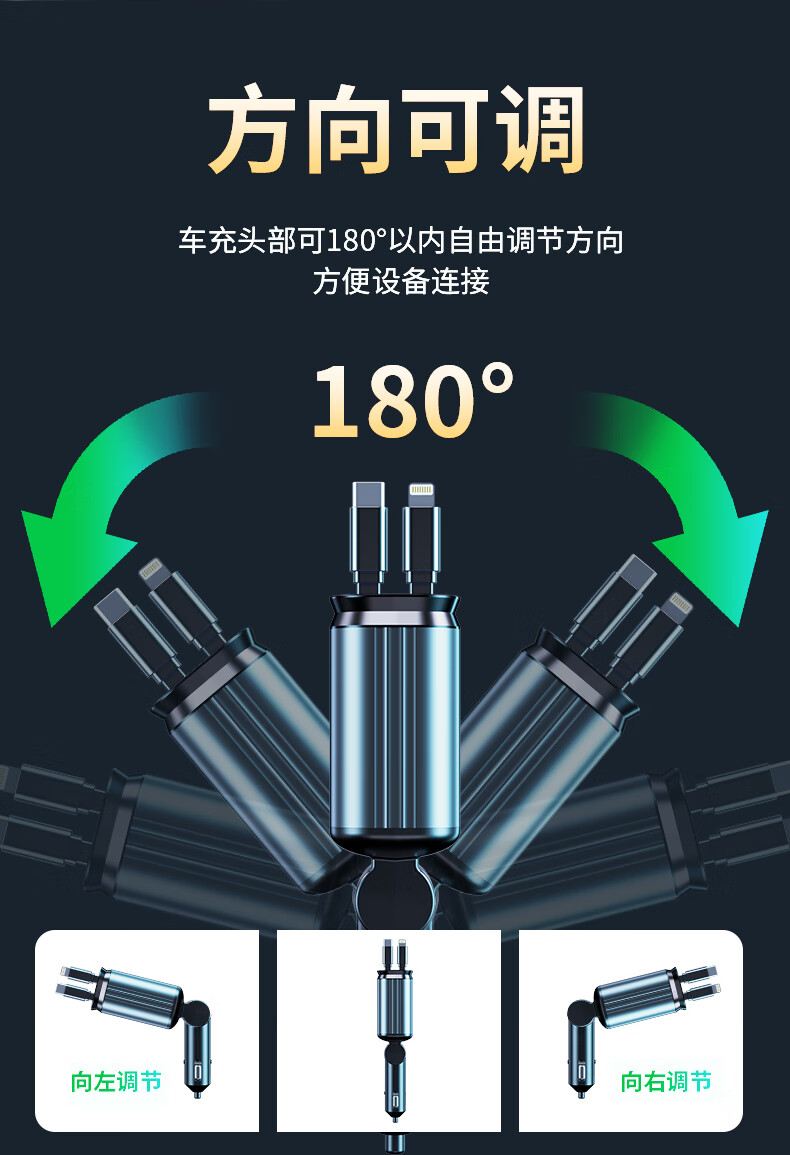 飒望德国车载充电器超级快充线一拖三可伸缩三头点烟器快充转换器苹果 【240W升级版】紫色星空顶 提速400%