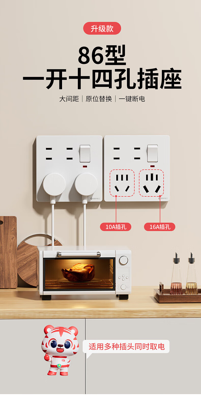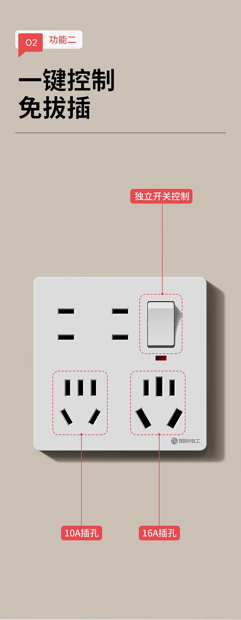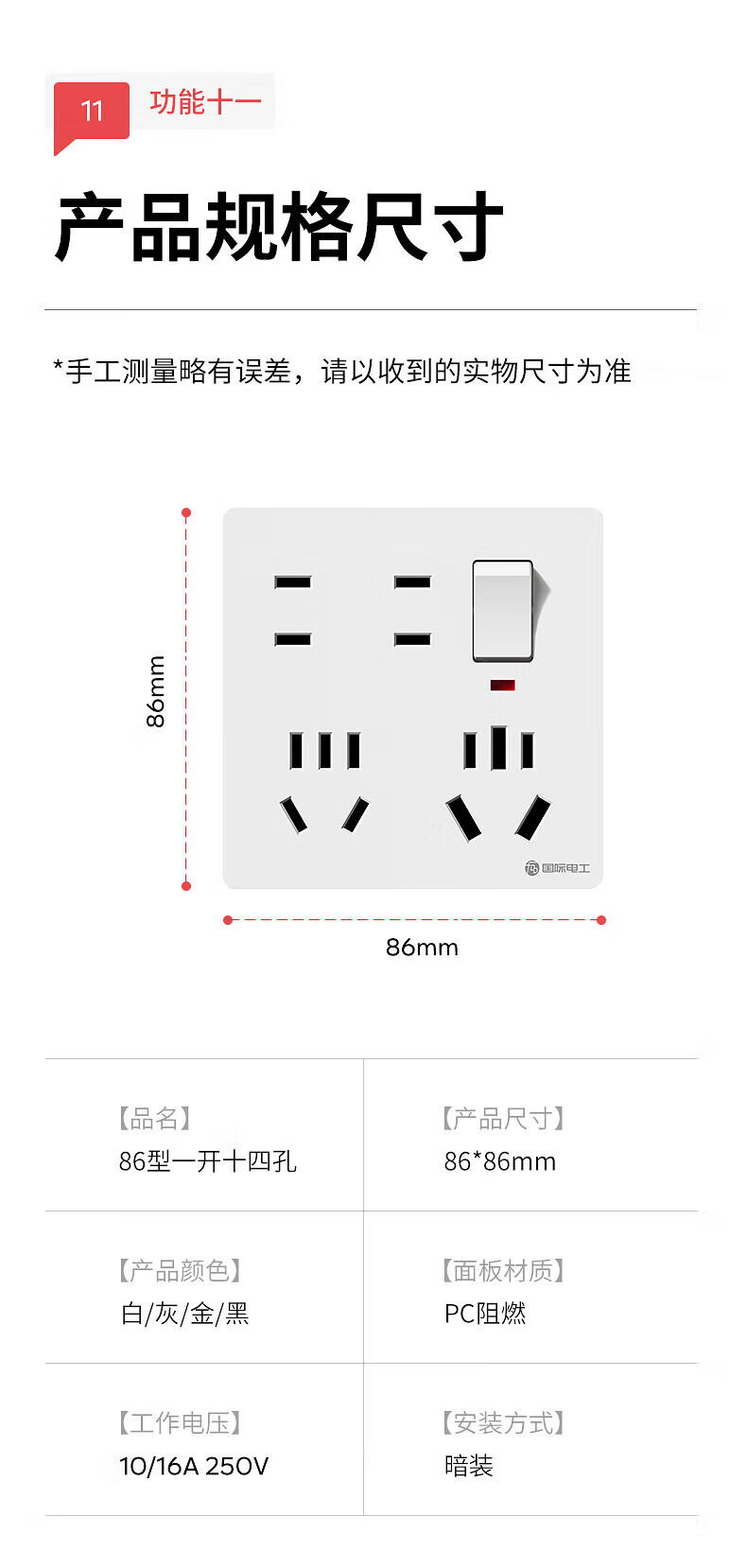 国际电工86型暗装一开十四孔10A电源厨房墙壁带开关多孔16A大功率开关插座 【10A+16A】白色一开十四孔