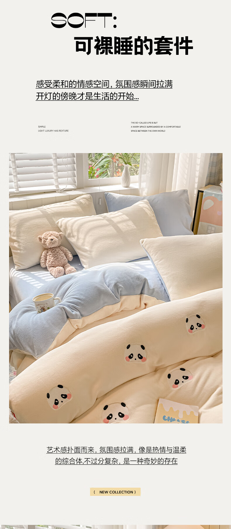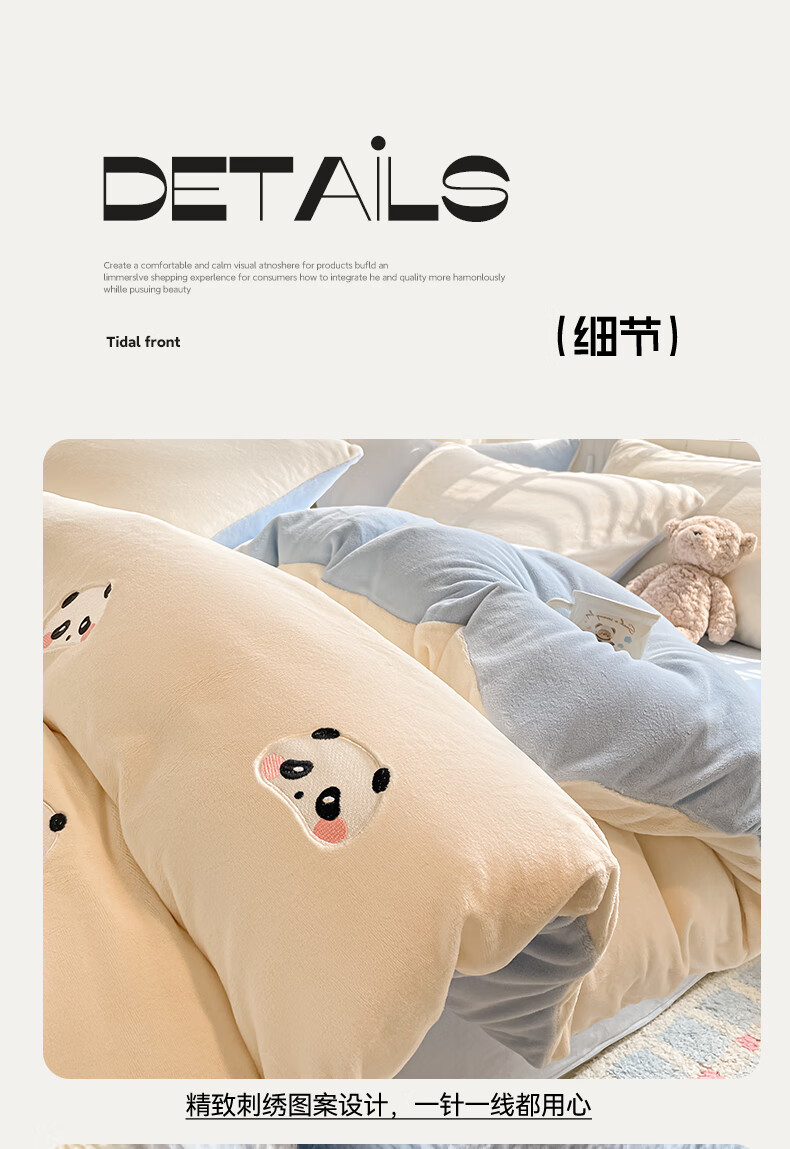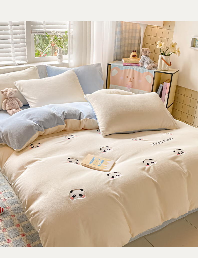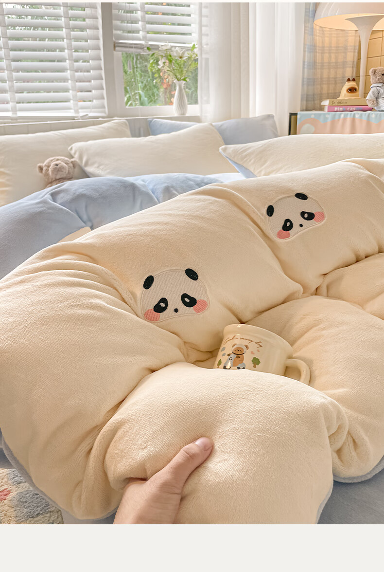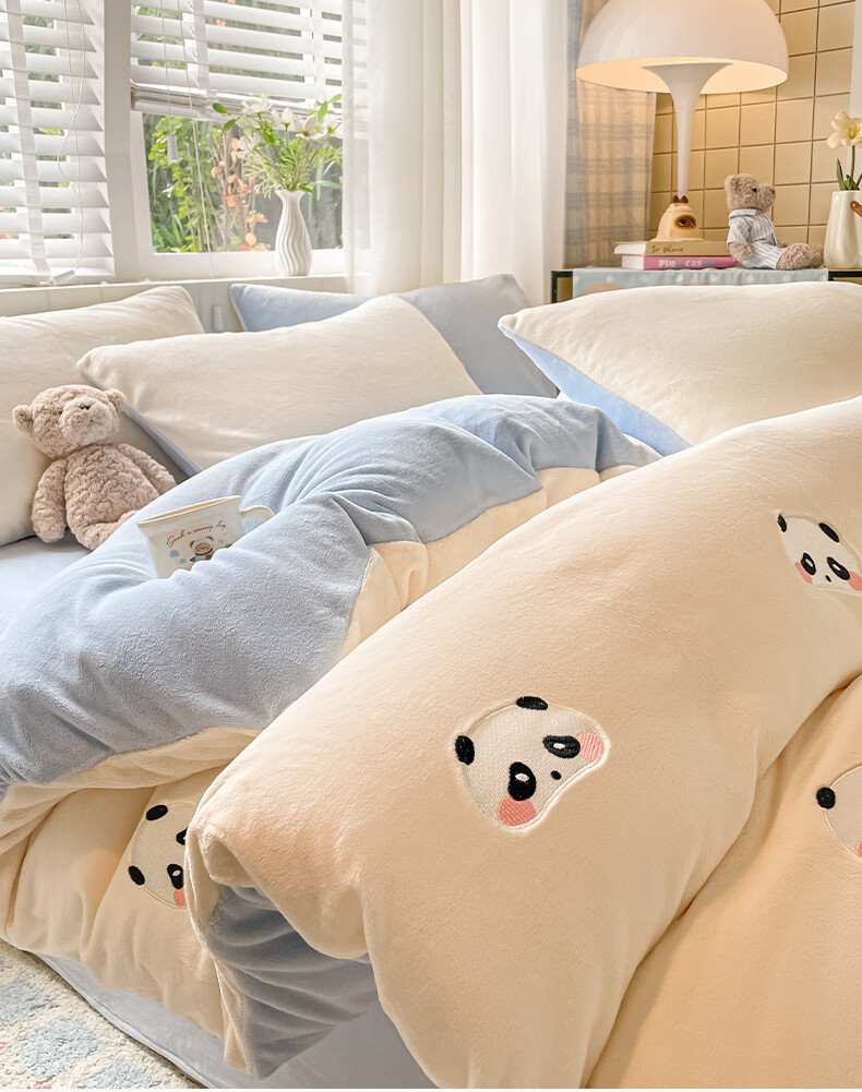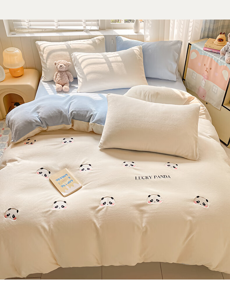 猫人(MiiOW)卡通刺绣牛奶绒床上四件套秋冬加厚保暖床单被套三件套宿舍床品 粉颊熊猫梦-蓝【厚实保暖】 1.8m 床笠款 四件套-200*230cm被套