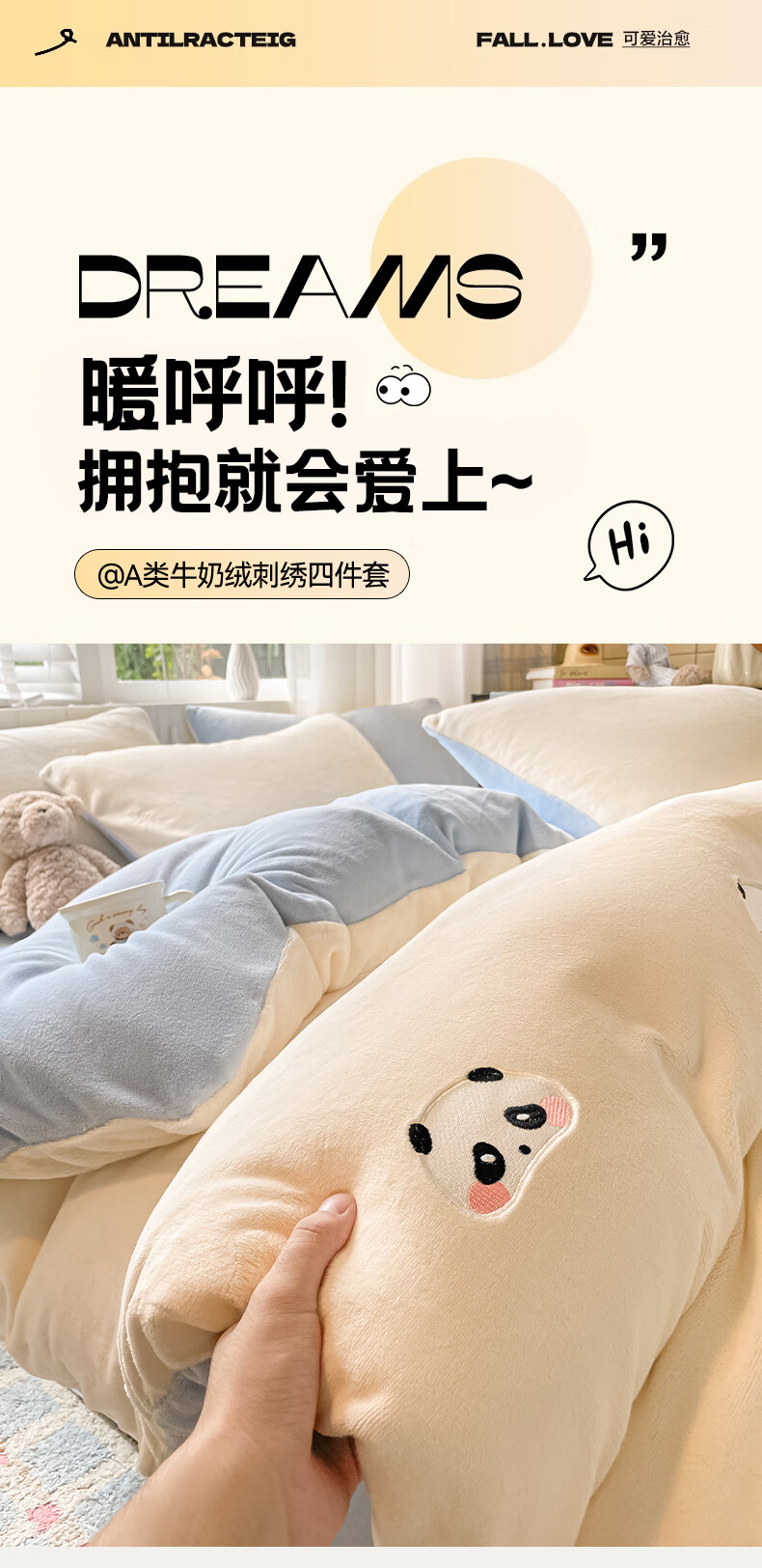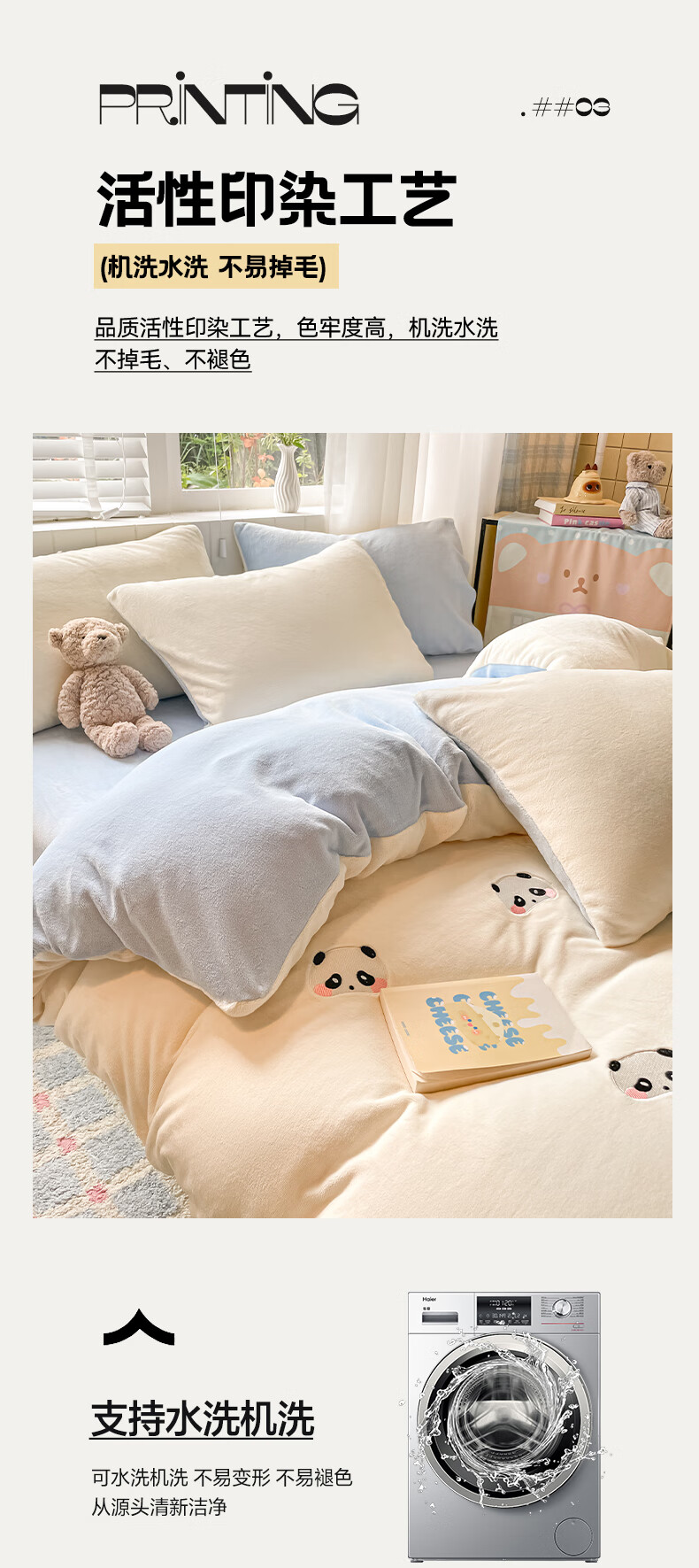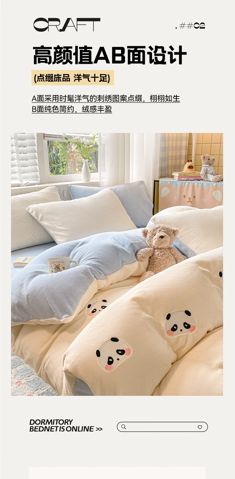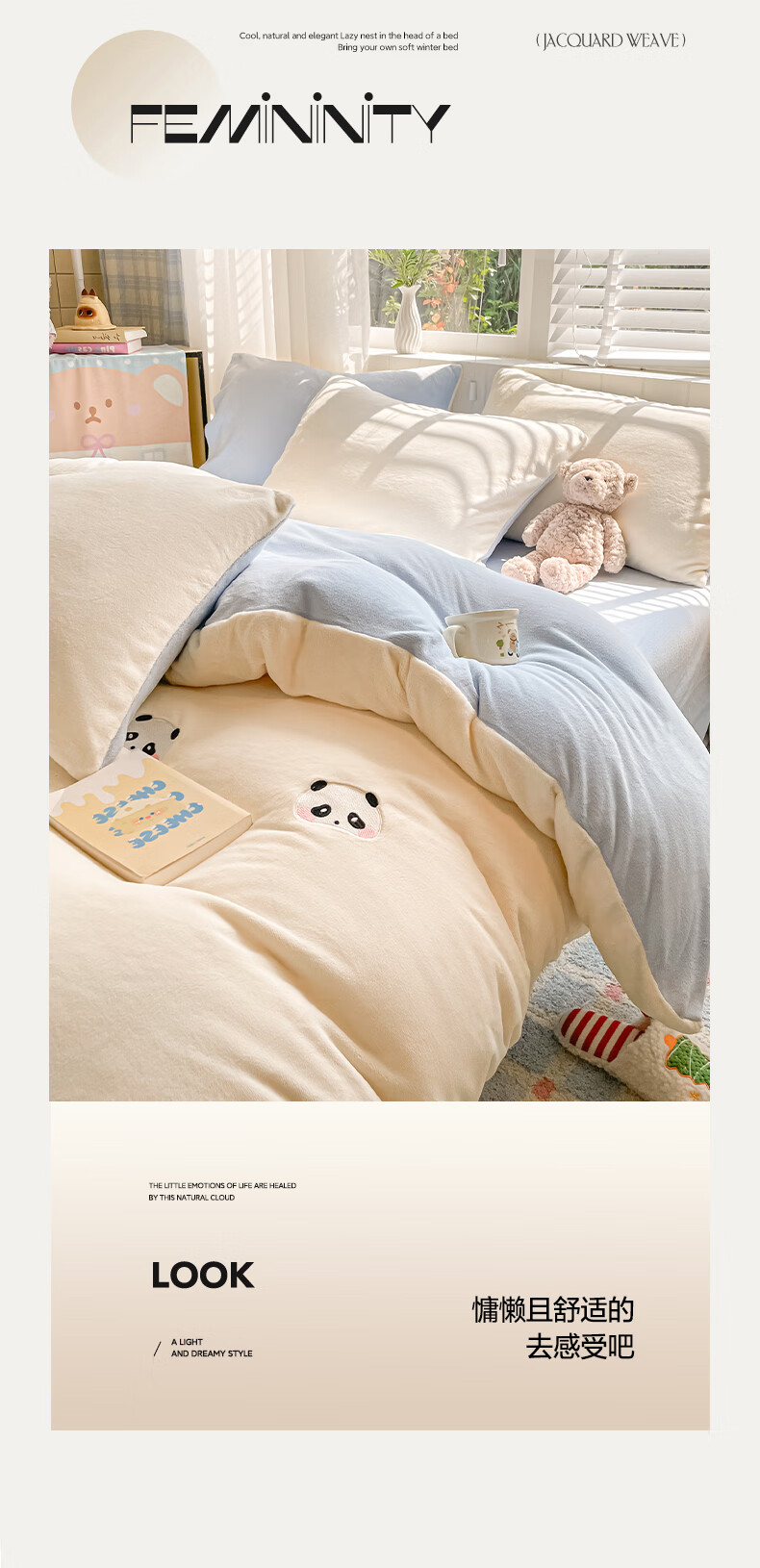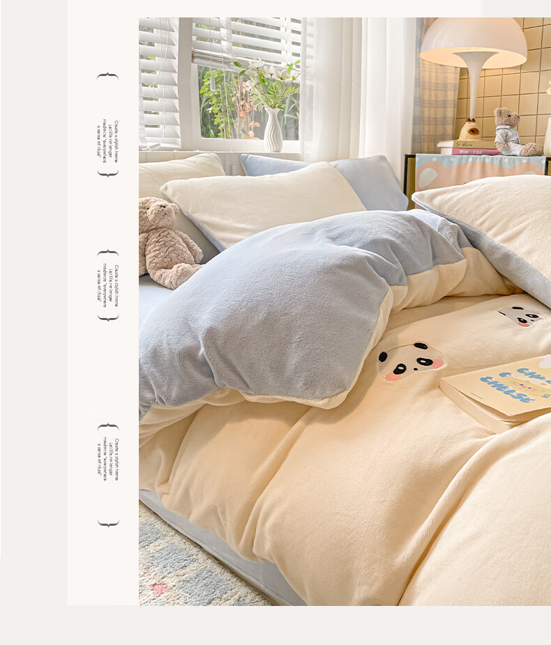 猫人(MiiOW)卡通刺绣牛奶绒床上四件套秋冬加厚保暖床单被套三件套宿舍床品 粉颊熊猫梦-蓝【厚实保暖】 1.8m 床笠款 四件套-200*230cm被套