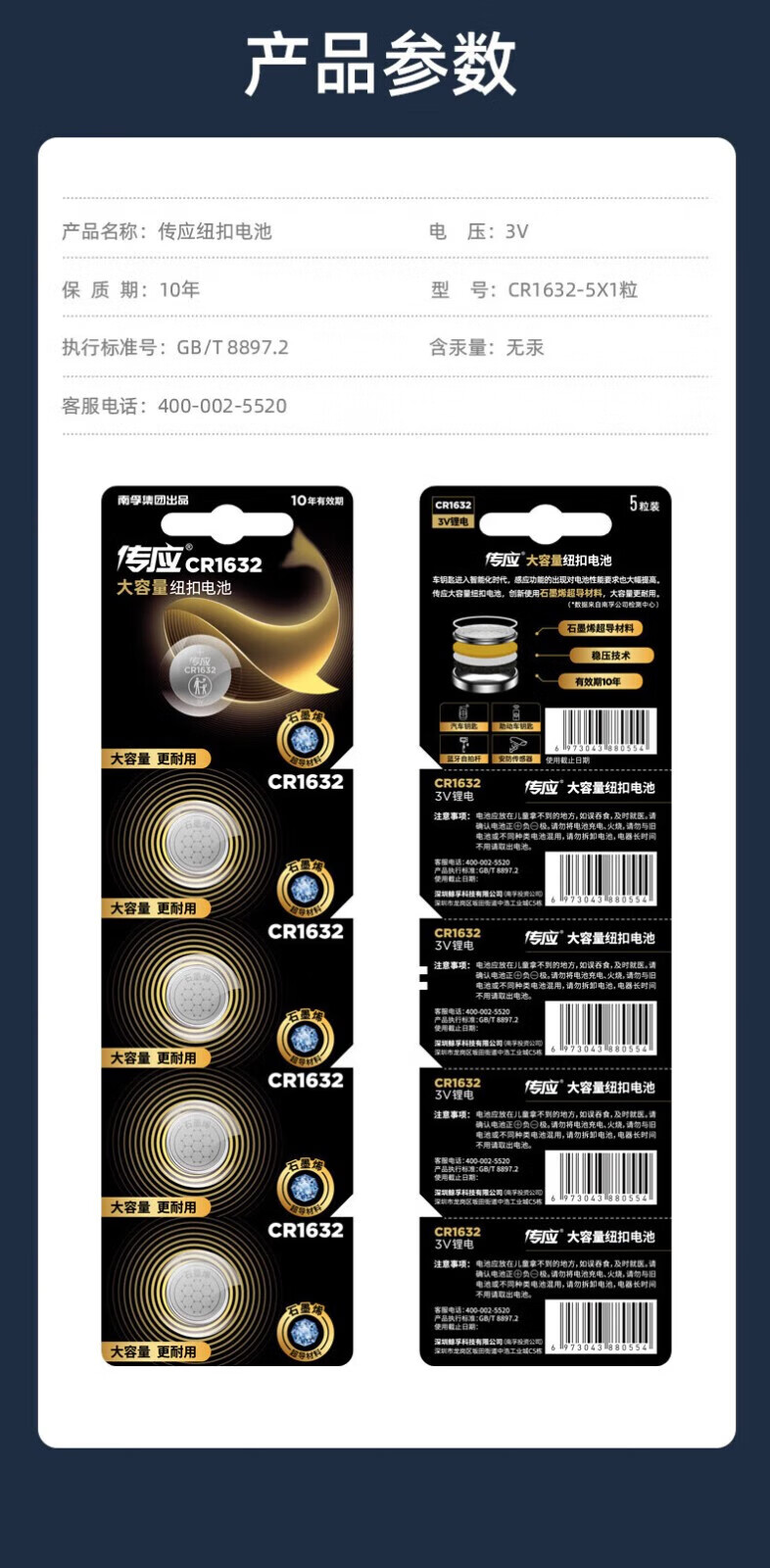 南孚【工厂直发】传应CR1632纽扣电池 3V锂电池 适用于比亚迪丰田凯美瑞汽车遥控器钥匙电子 2粒装 CR1632【5粒装】
