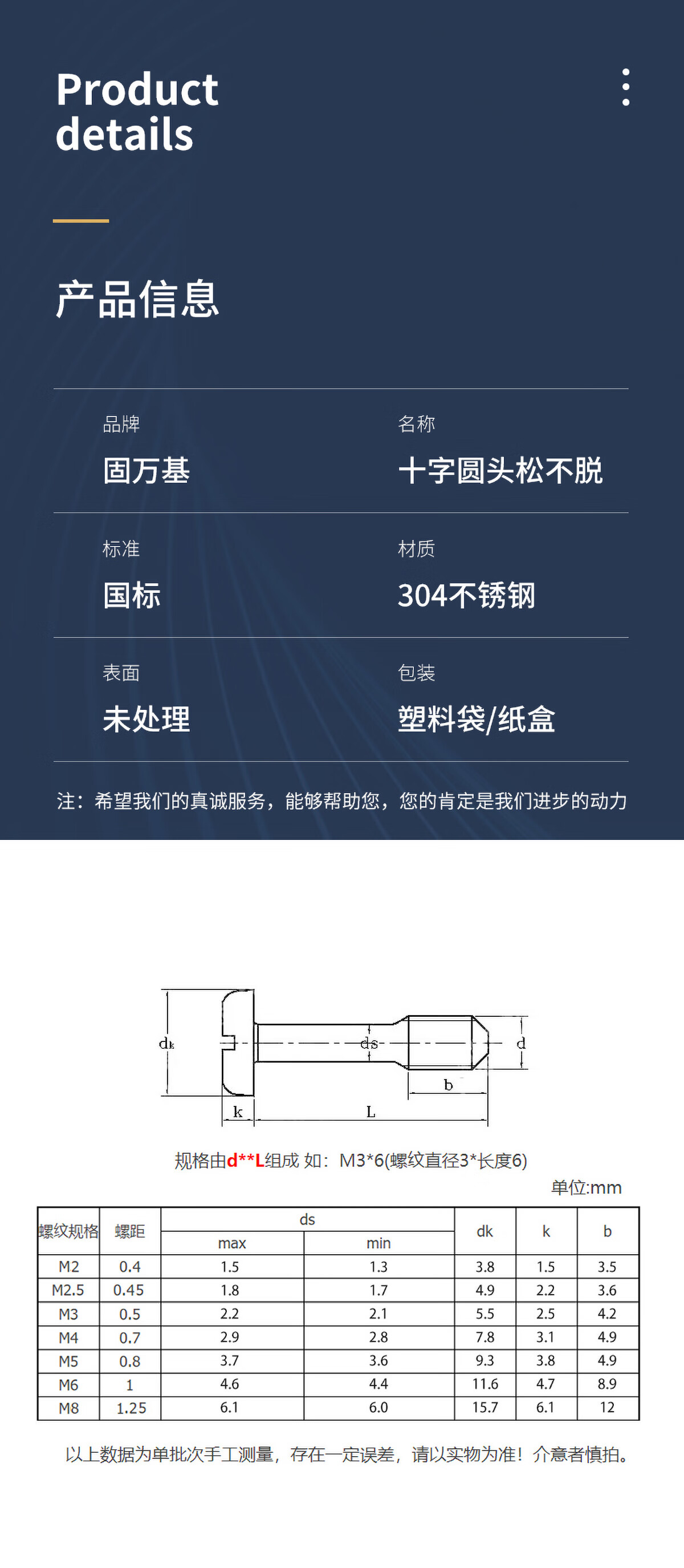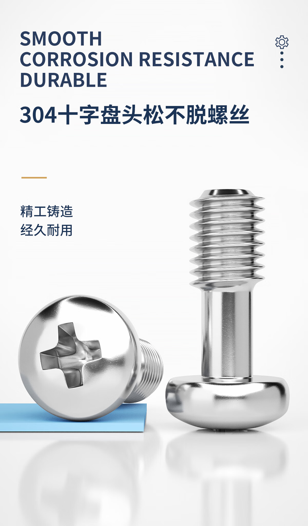 固万基(GUWANJI)304不锈钢十字盘头松不脱螺丝钉DIN7964圆头不脱出半牙螺栓M2-M8 M2*6(20个)