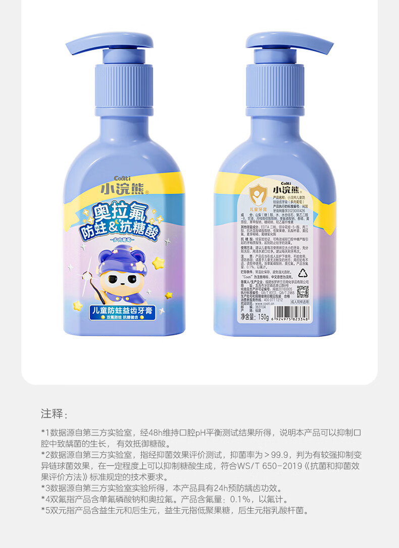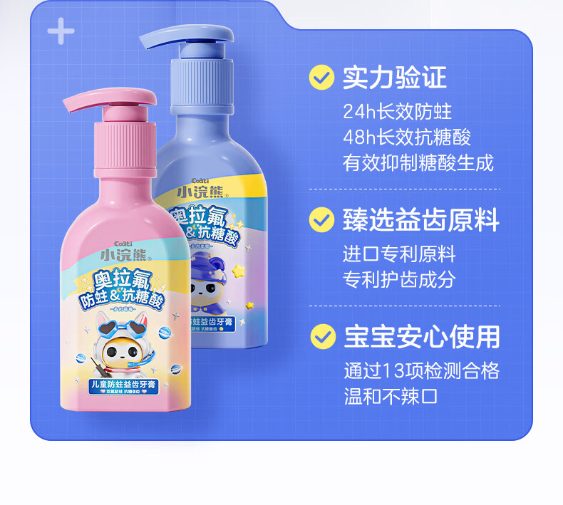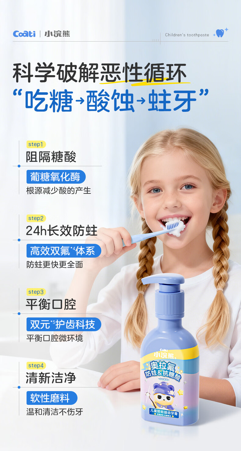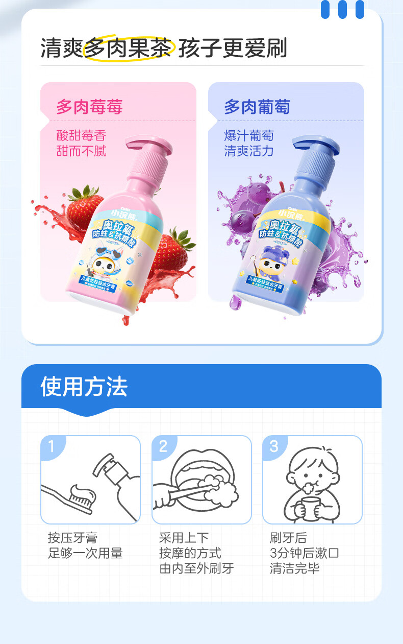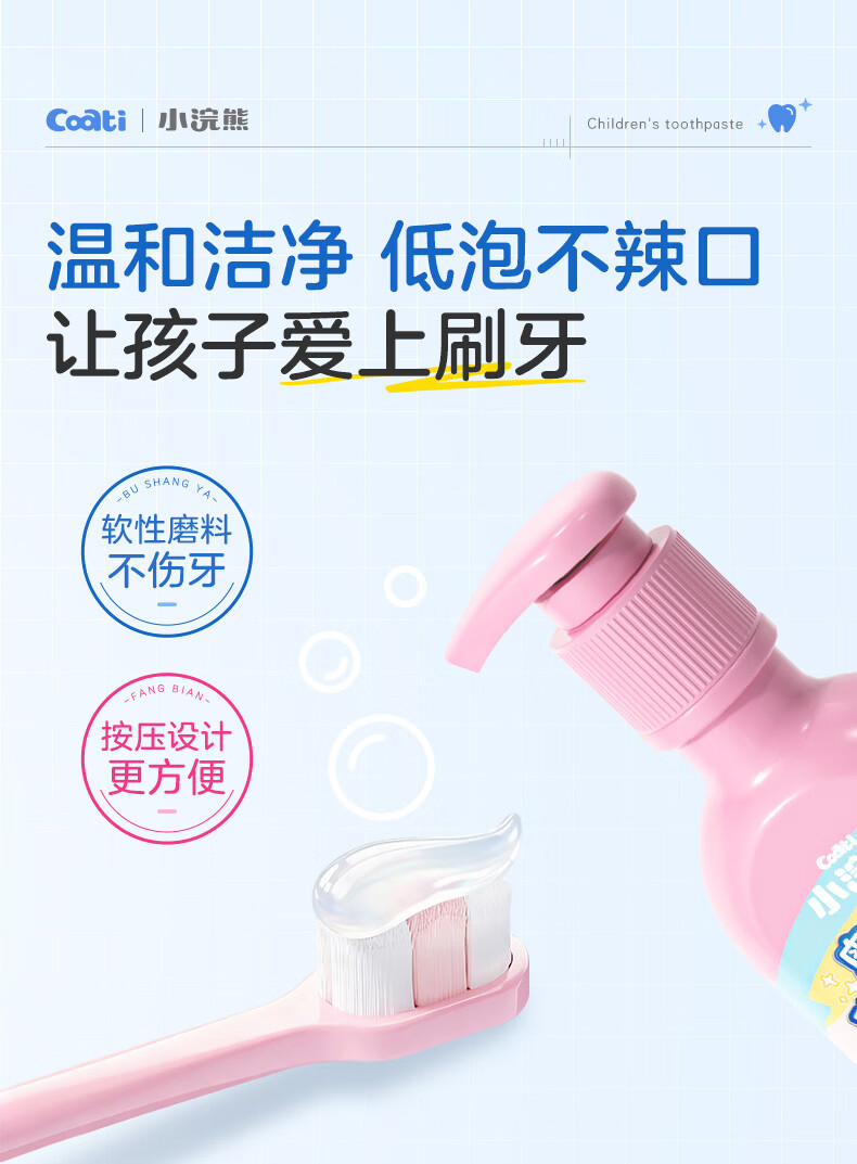 小浣熊儿童牙膏 宝宝抗糖酸牙膏 按压式3-6-12岁含氟防蛀健齿换牙期牙膏 (草莓+葡萄)防蛀益齿牙膏150g*2瓶