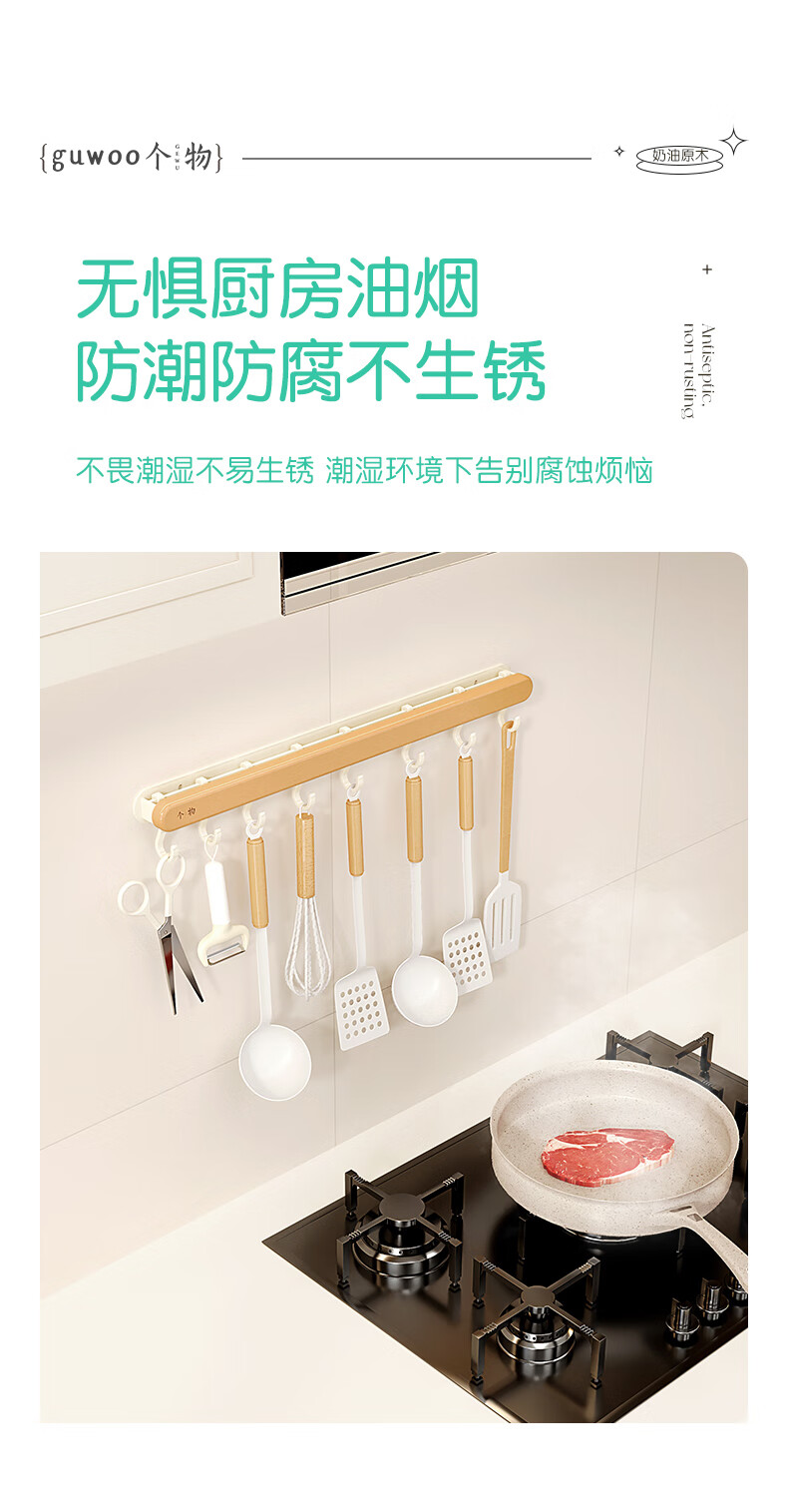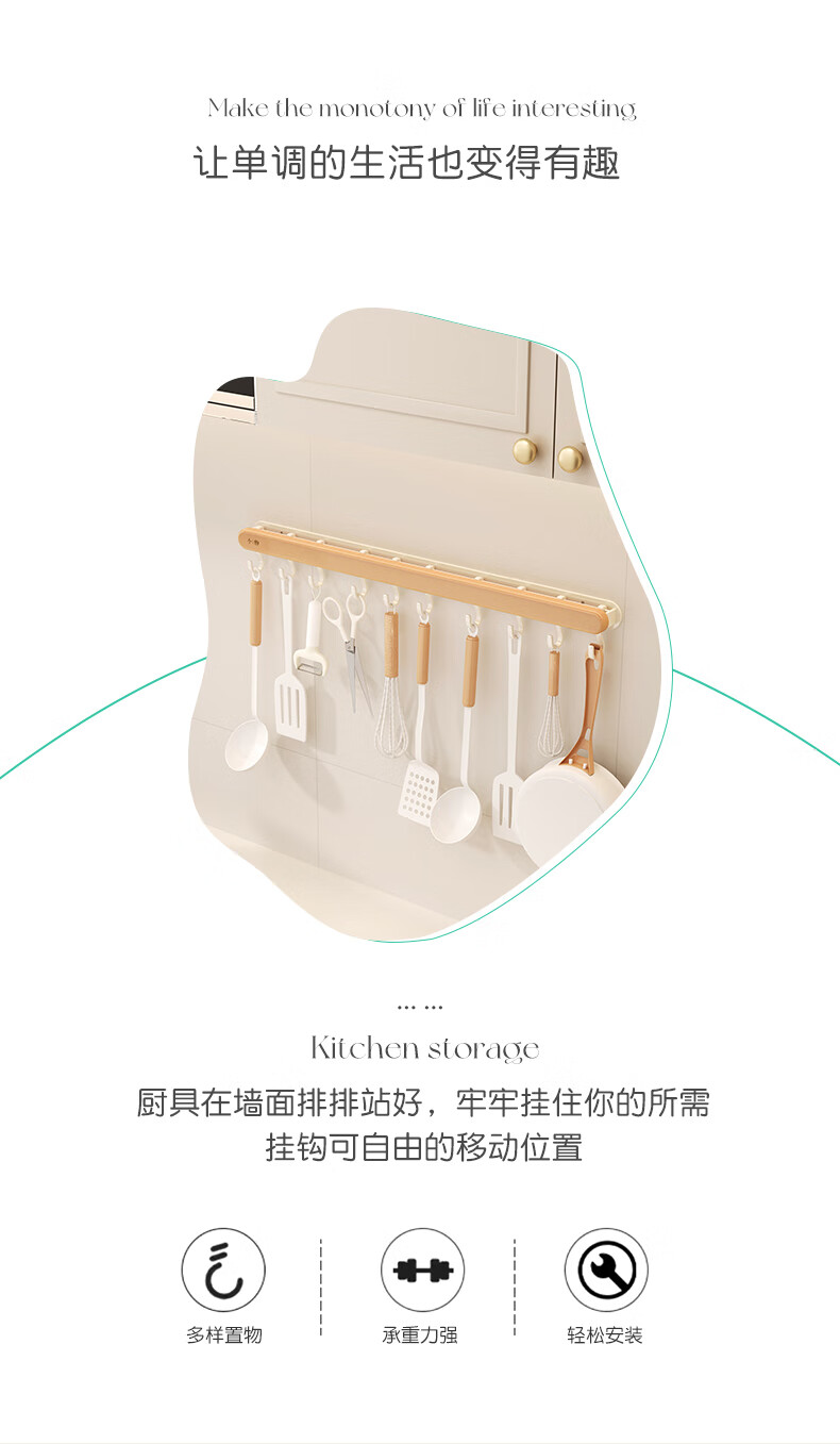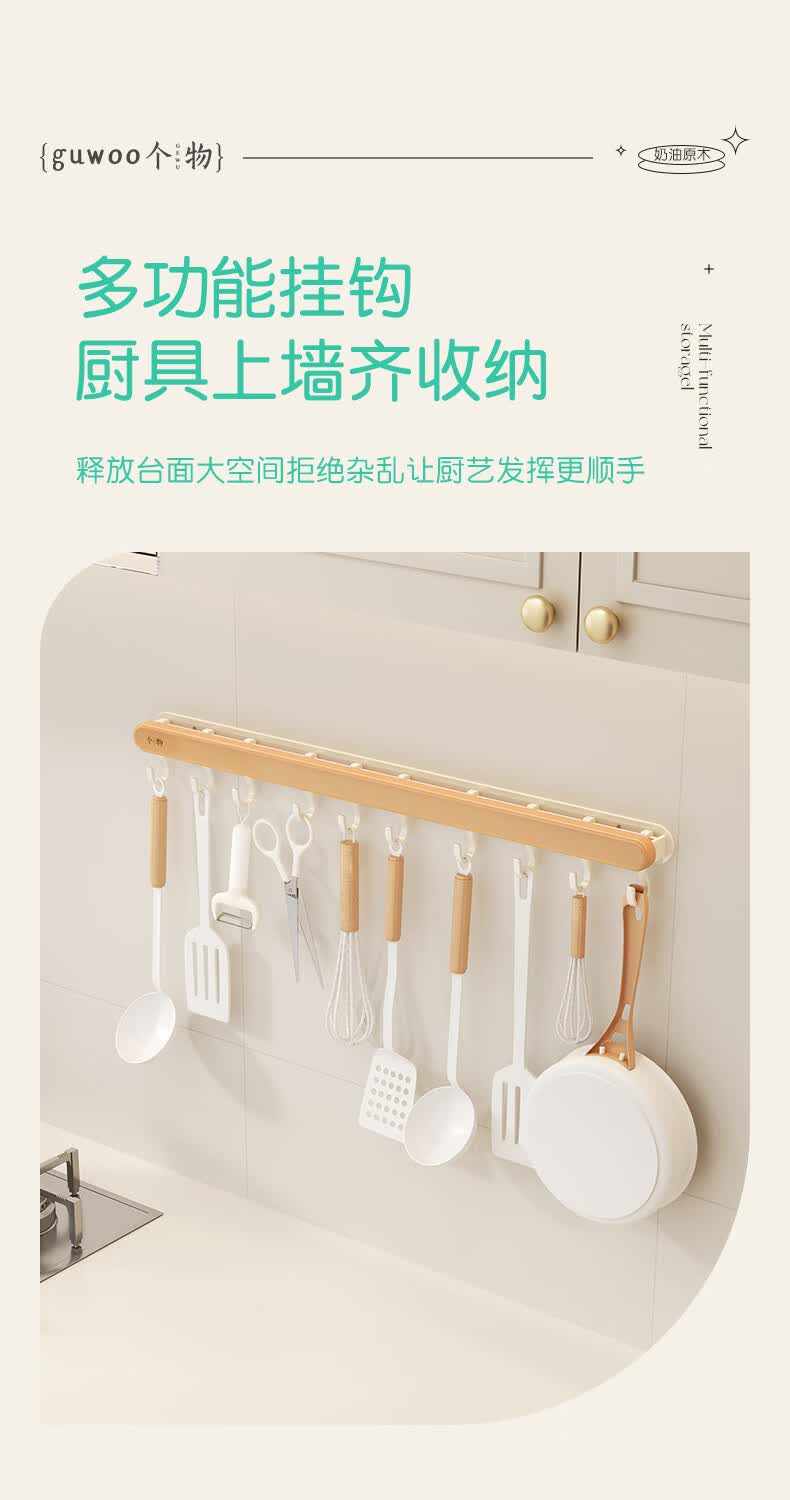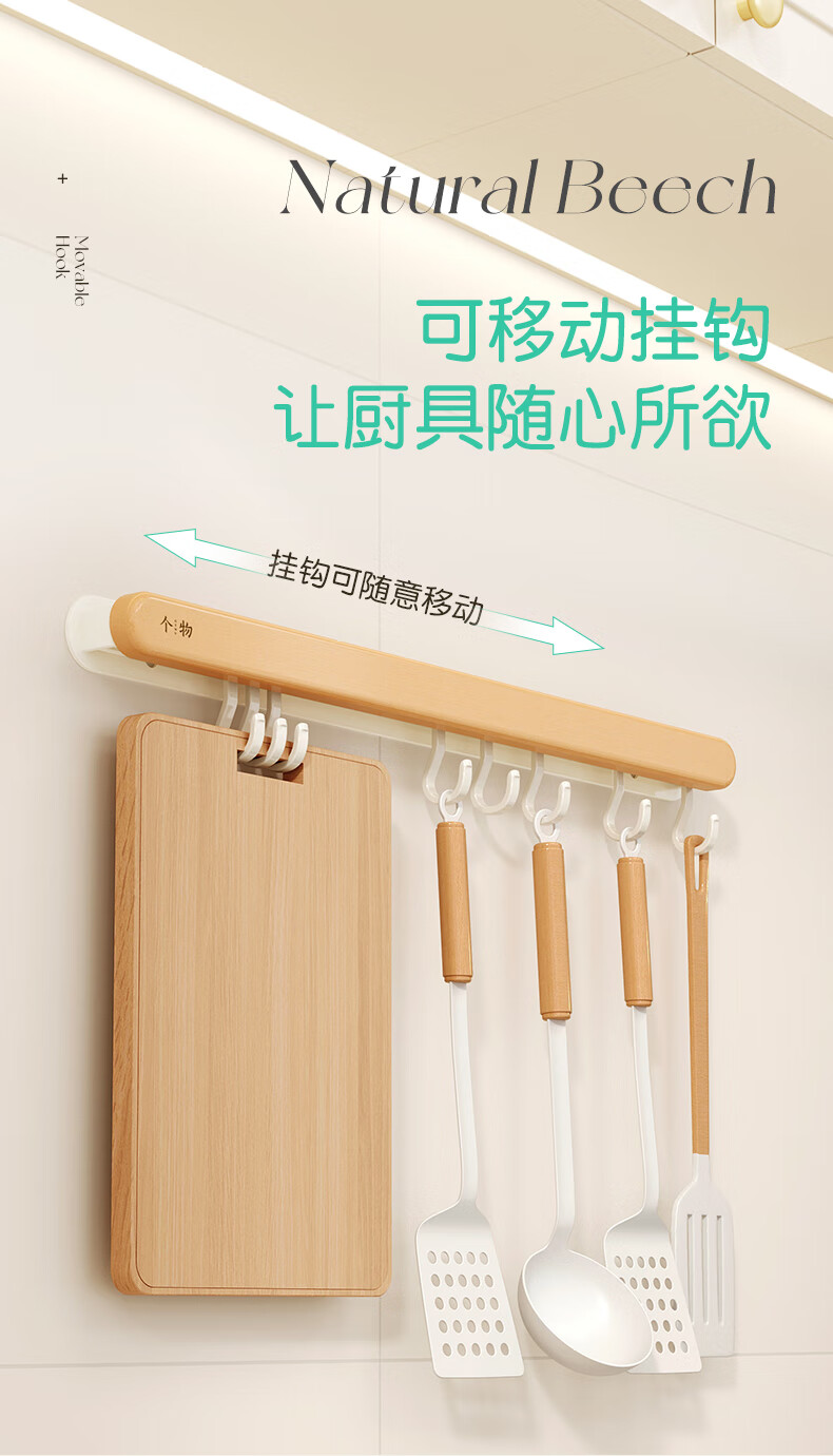 个物厨房锅铲挂钩勺子收纳架免打孔多功能壁挂排挂杆移动置物架原木风 锅铲勺子可移动挂钩40CM