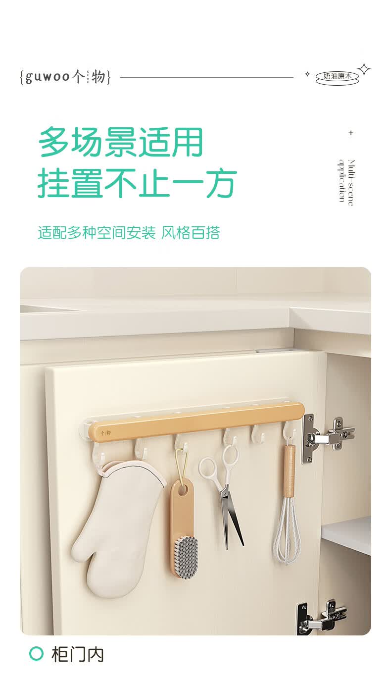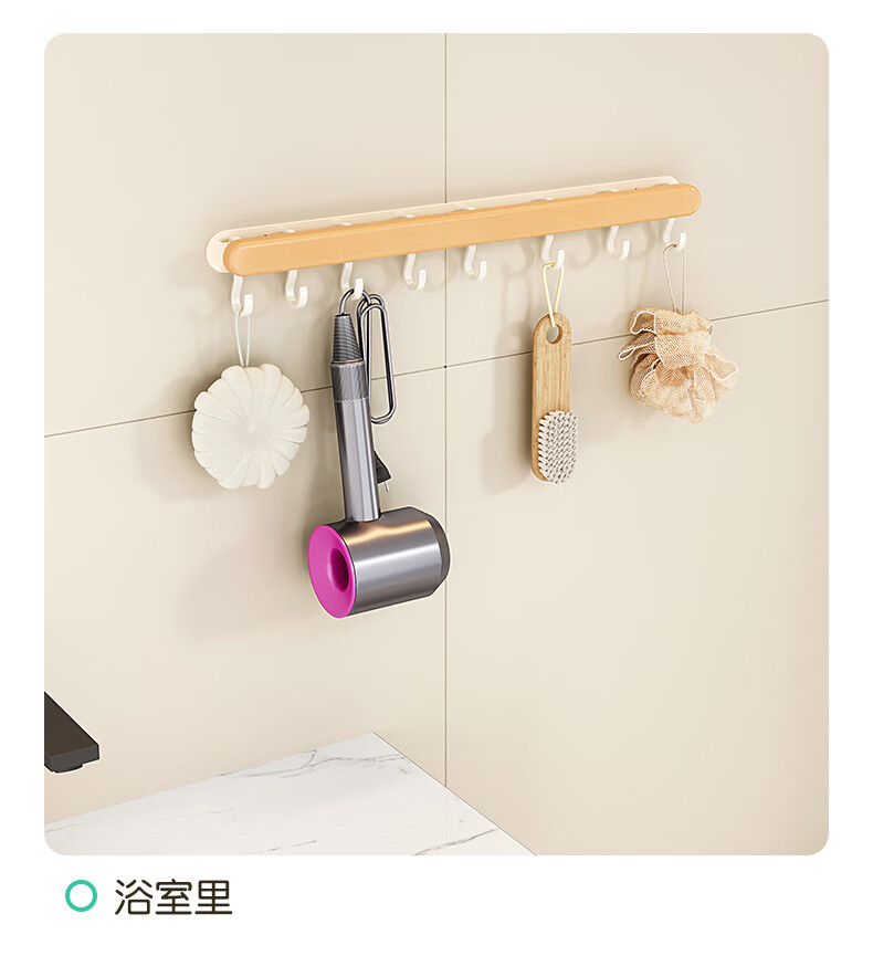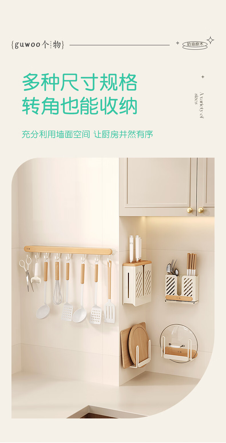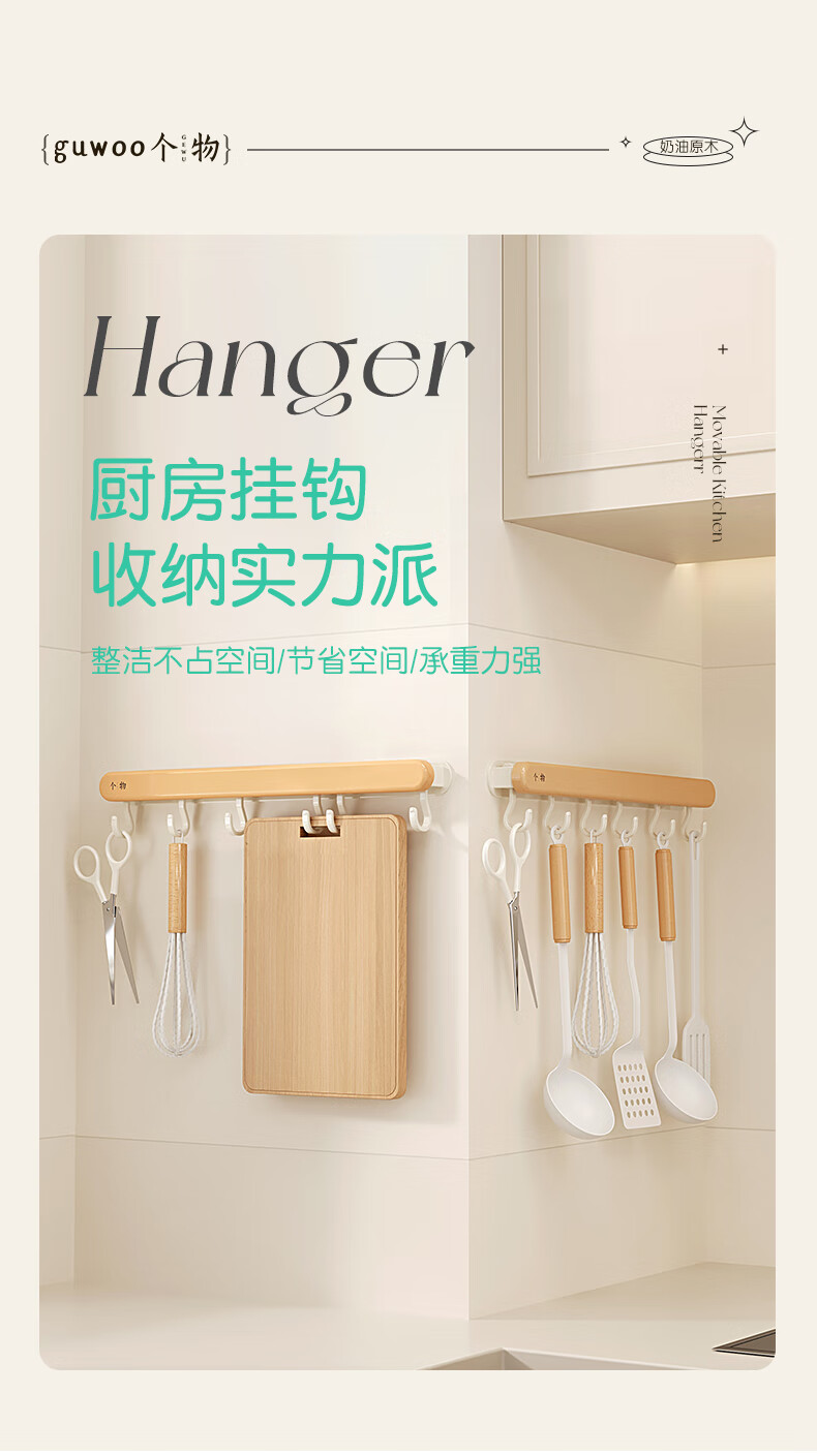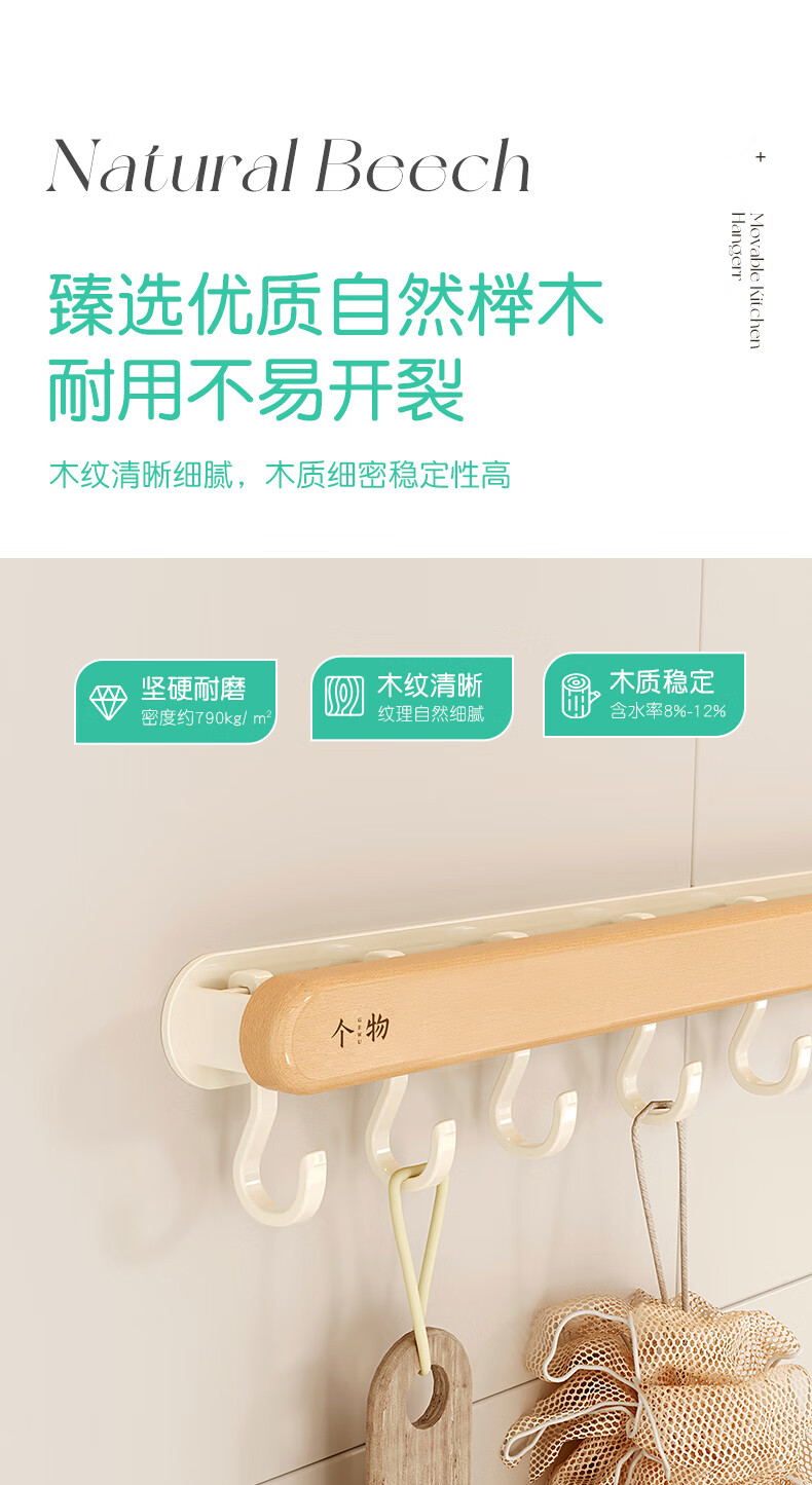 个物厨房锅铲挂钩勺子收纳架免打孔多功能壁挂排挂杆移动置物架原木风 锅铲勺子可移动挂钩40CM