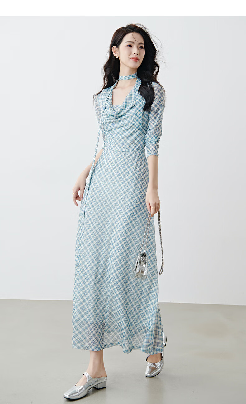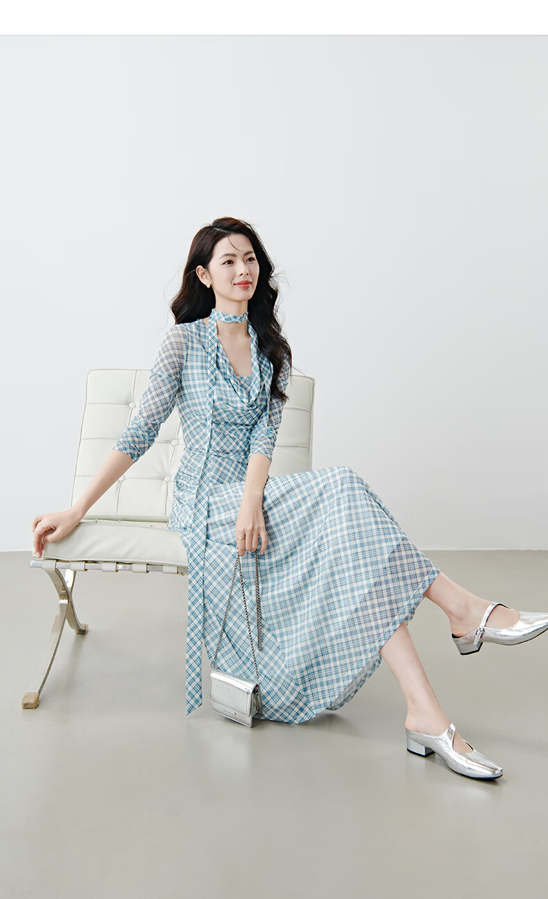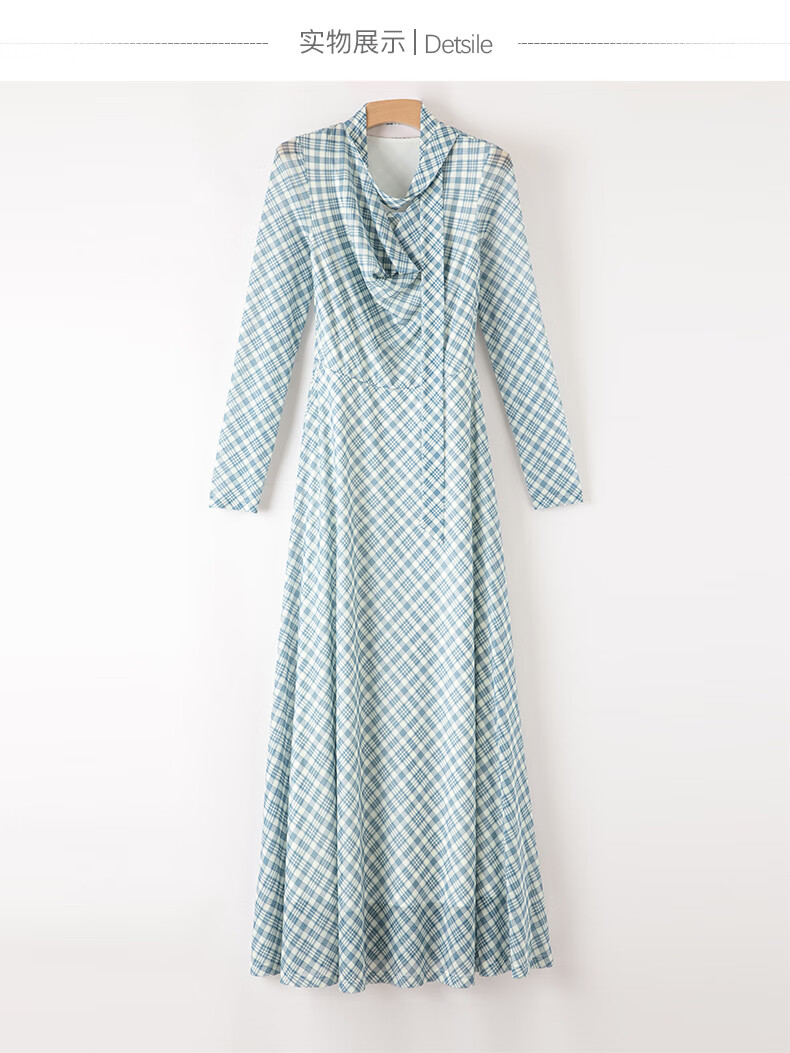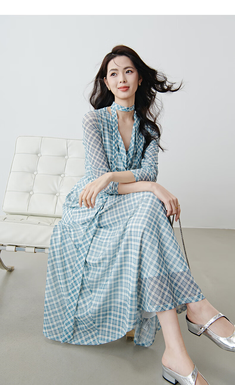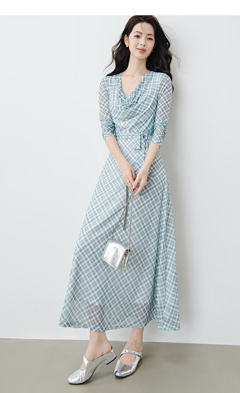 晚白2026年春款法式复古格纹度假风荡领裙子高弹垂感免烫氛围感连衣裙 深蓝色 L