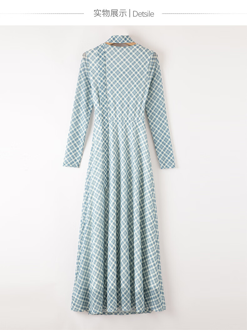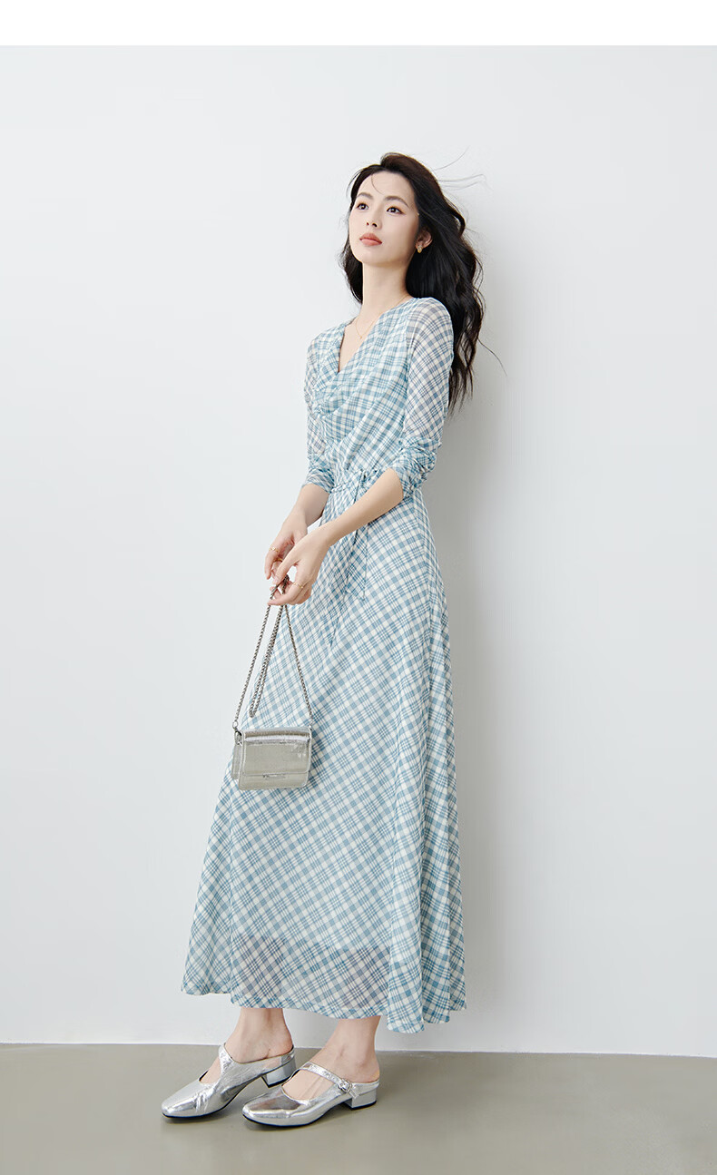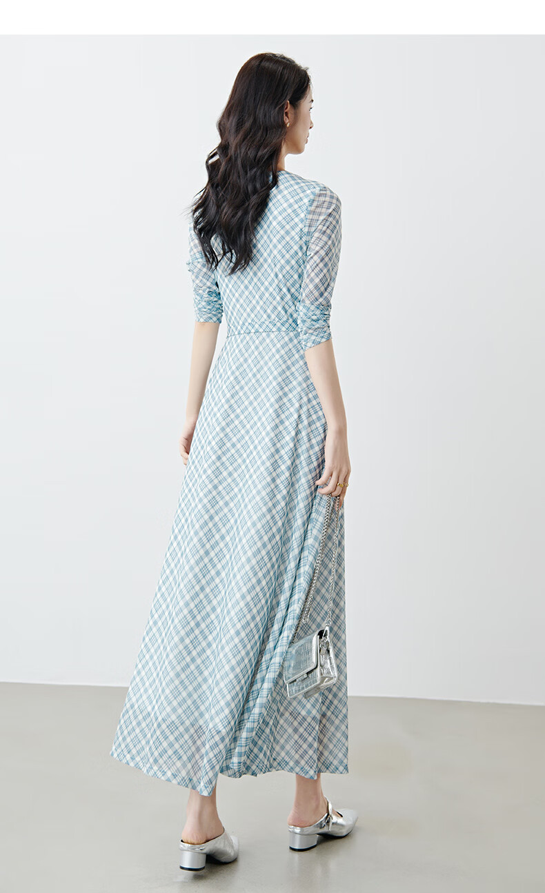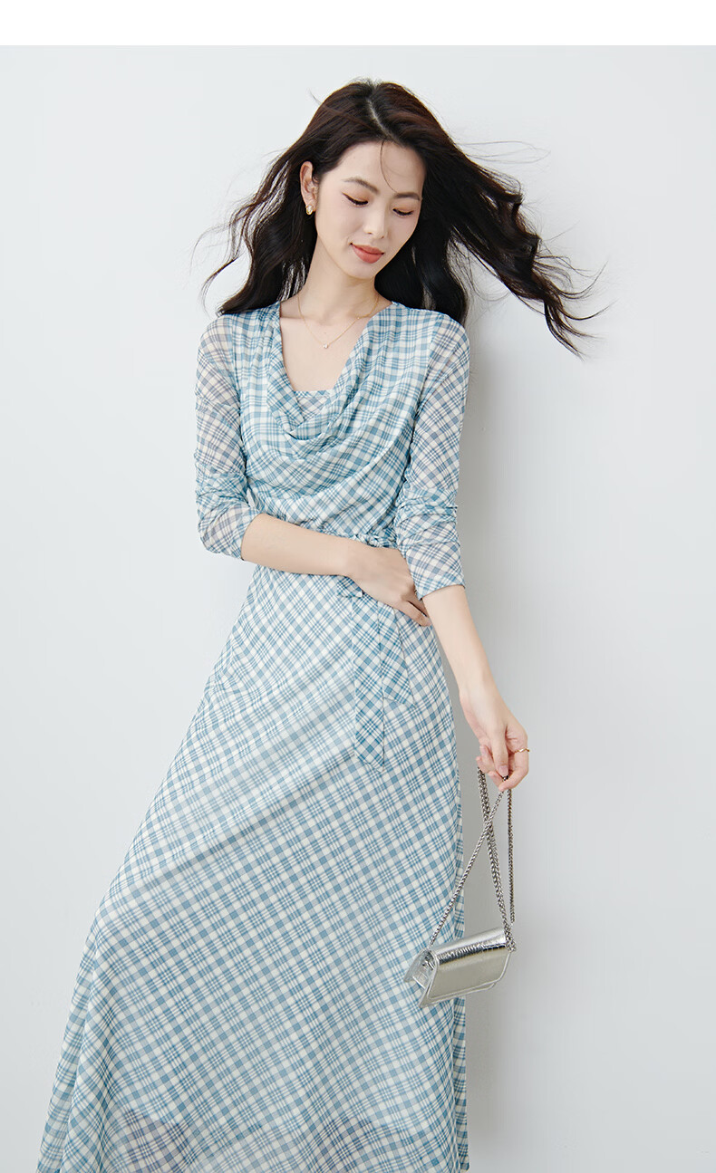 晚白2026年春款法式复古格纹度假风荡领裙子高弹垂感免烫氛围感连衣裙 深蓝色 L