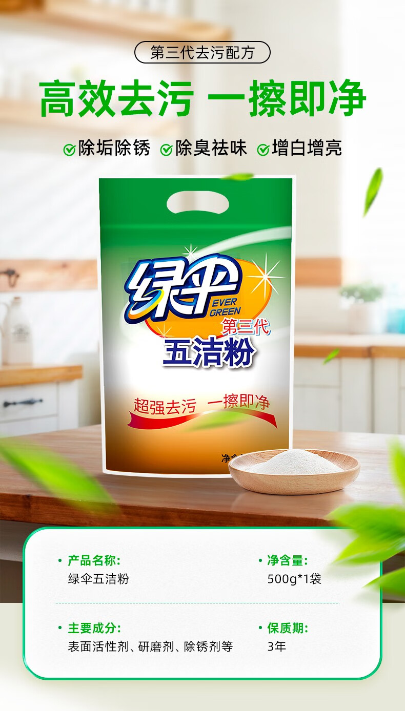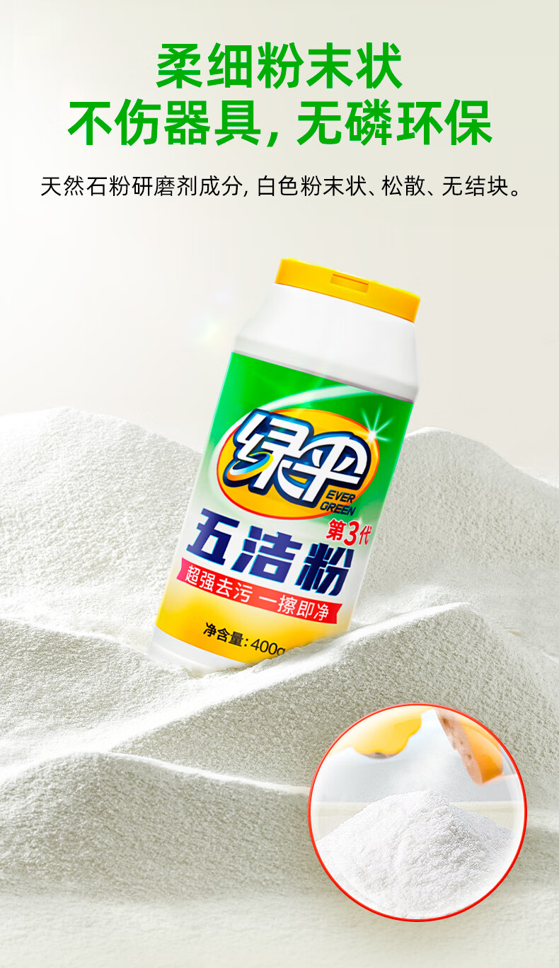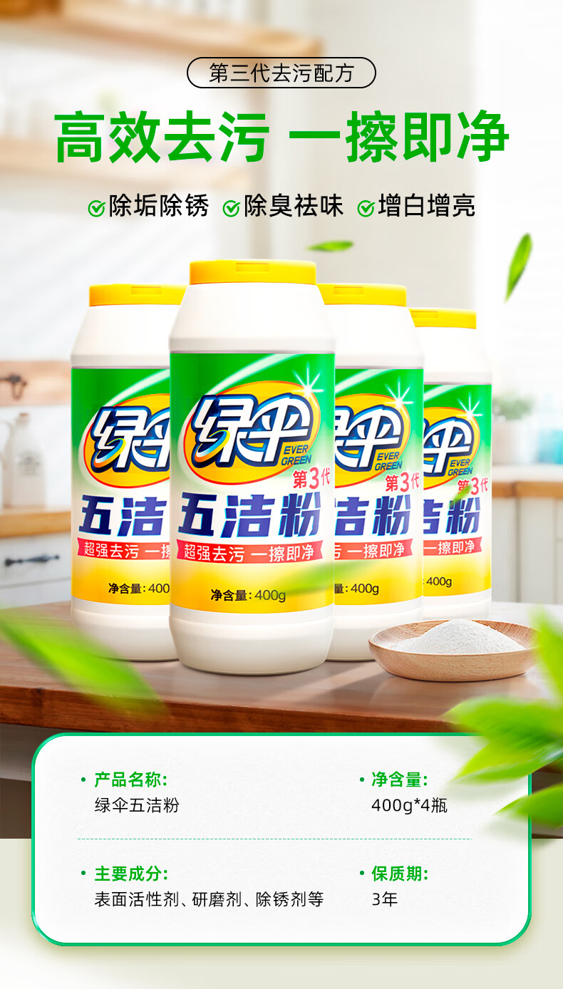 绿伞五洁粉 除锈锅底黑垢 厨房油污抛光剂 不锈钢水槽清洁剂 去污粉 【家庭装】400g*4瓶 | 增白增亮