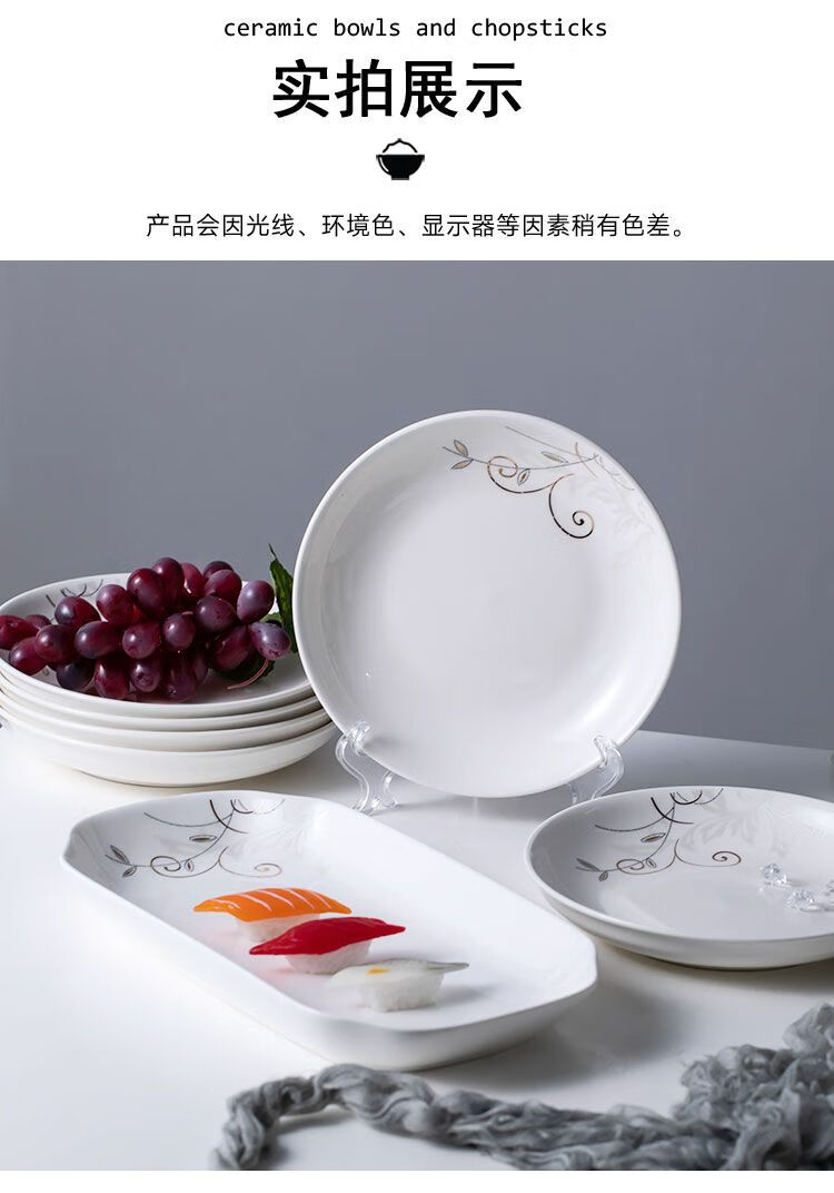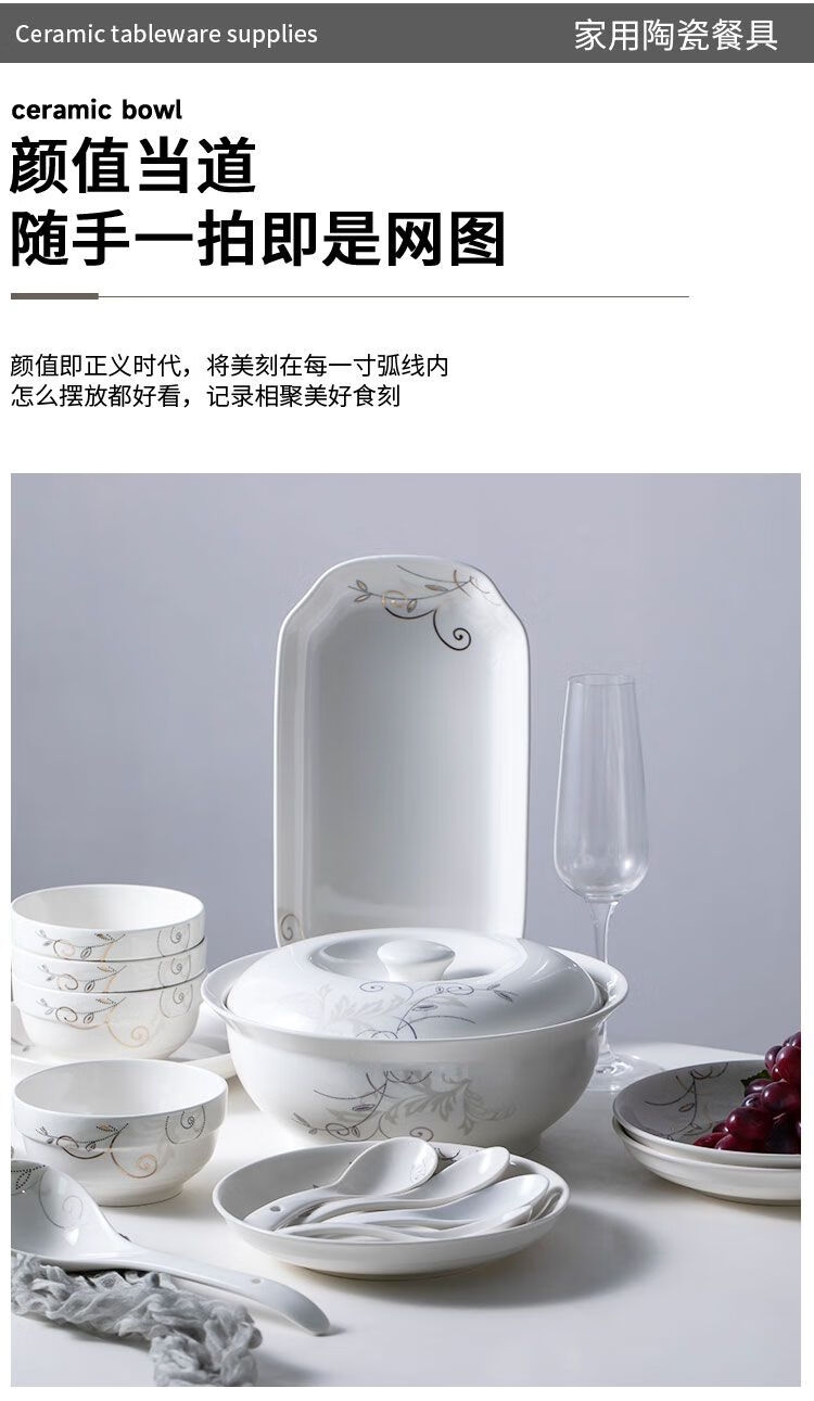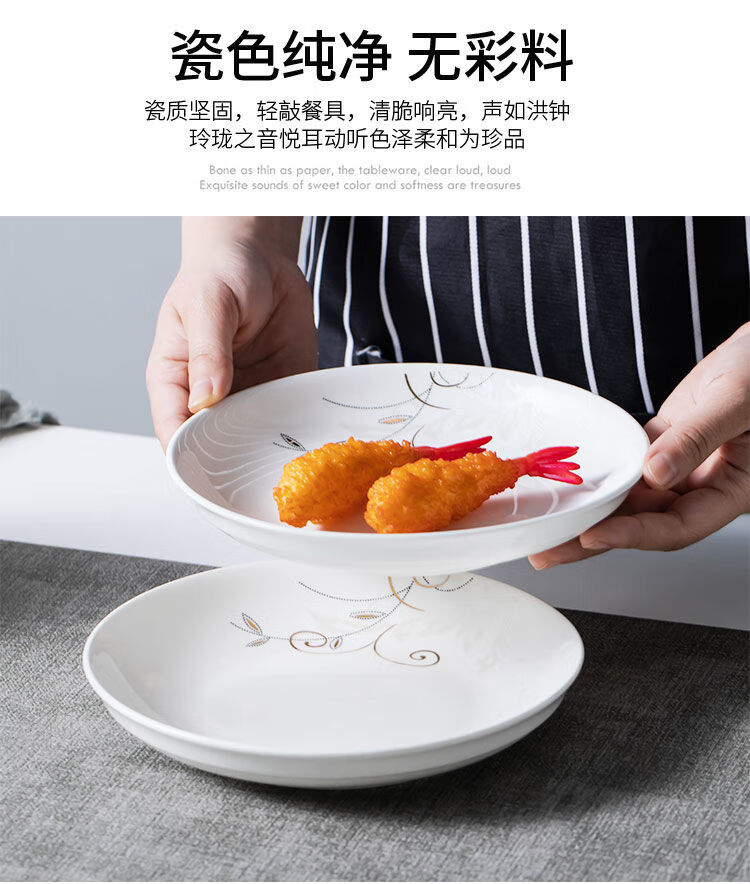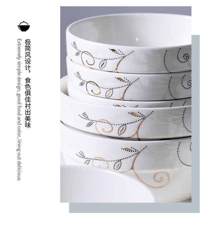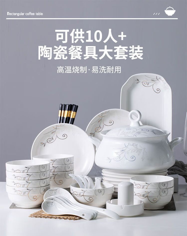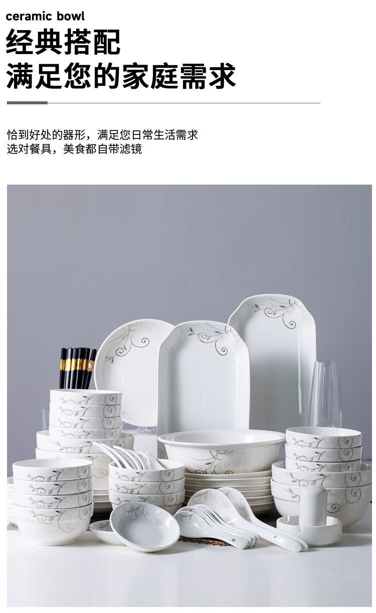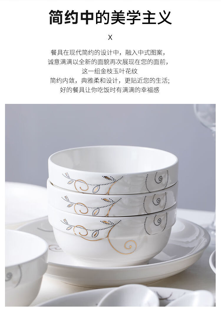 咏夏家用碗碟新款10人组合创意大套装陶瓷餐具饭碗面碗盘子汤碗可微波 金枝50件配合金筷