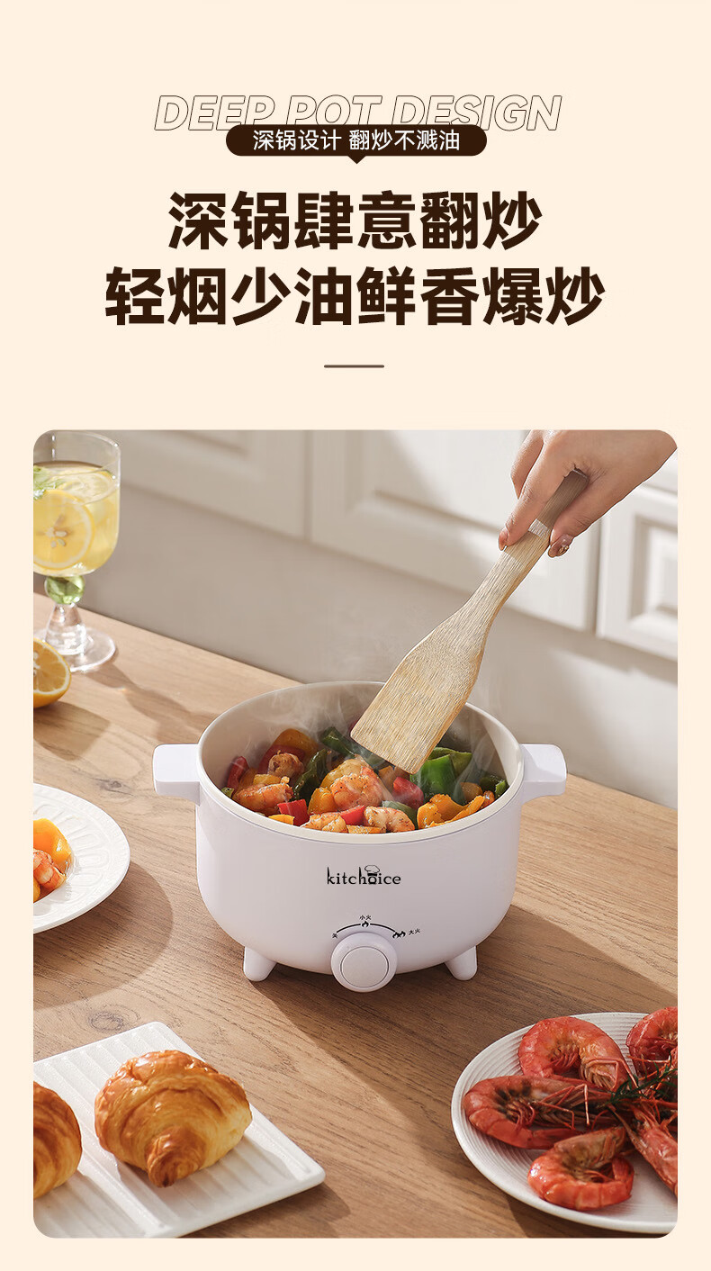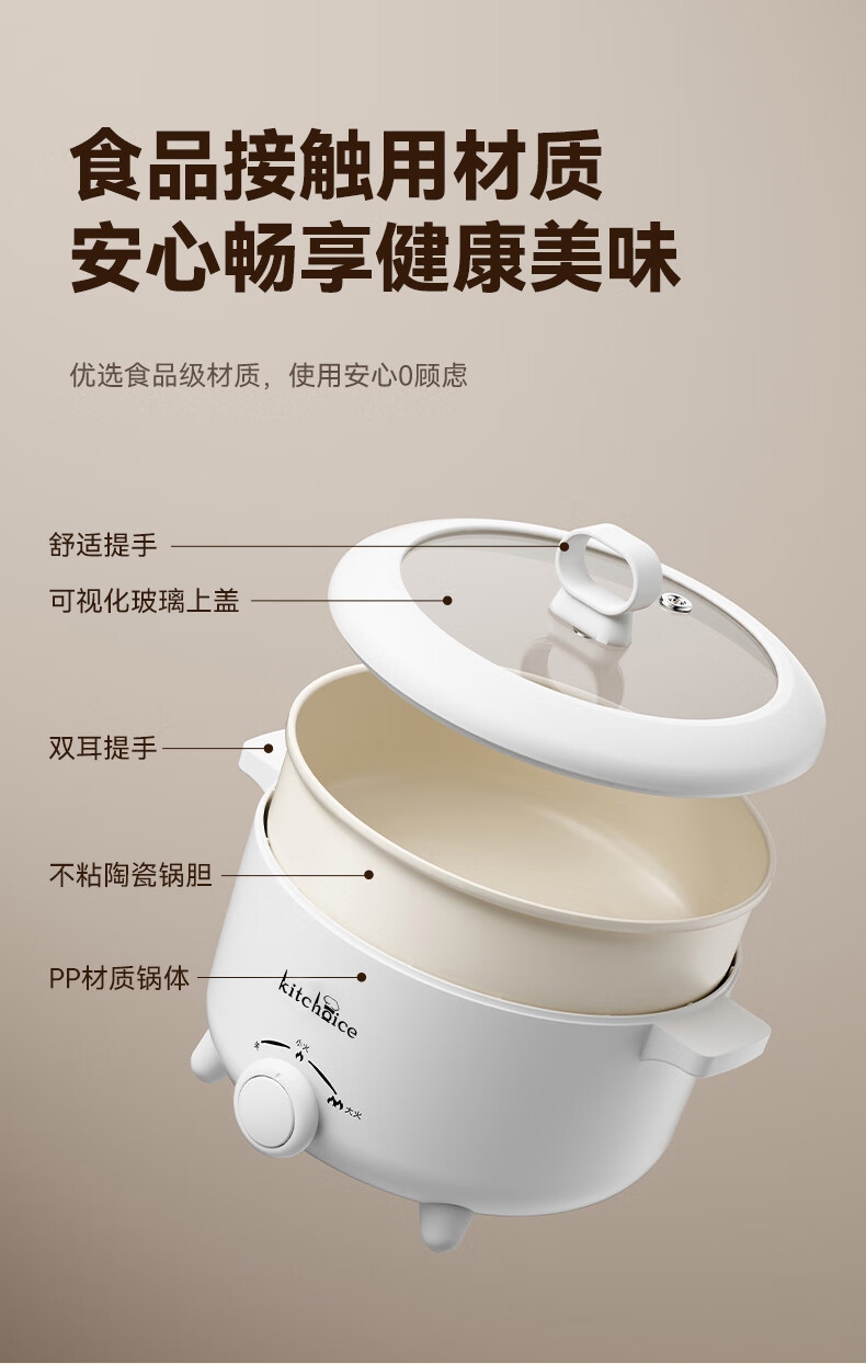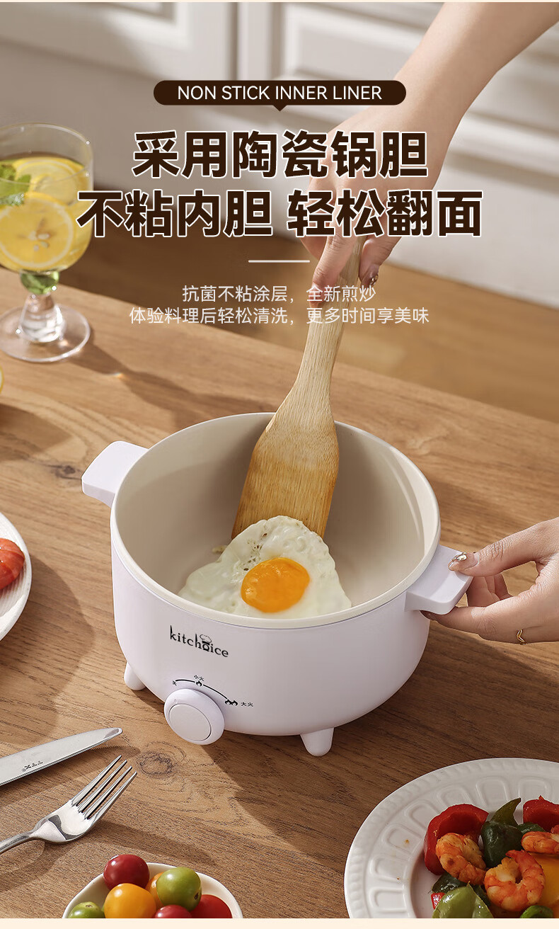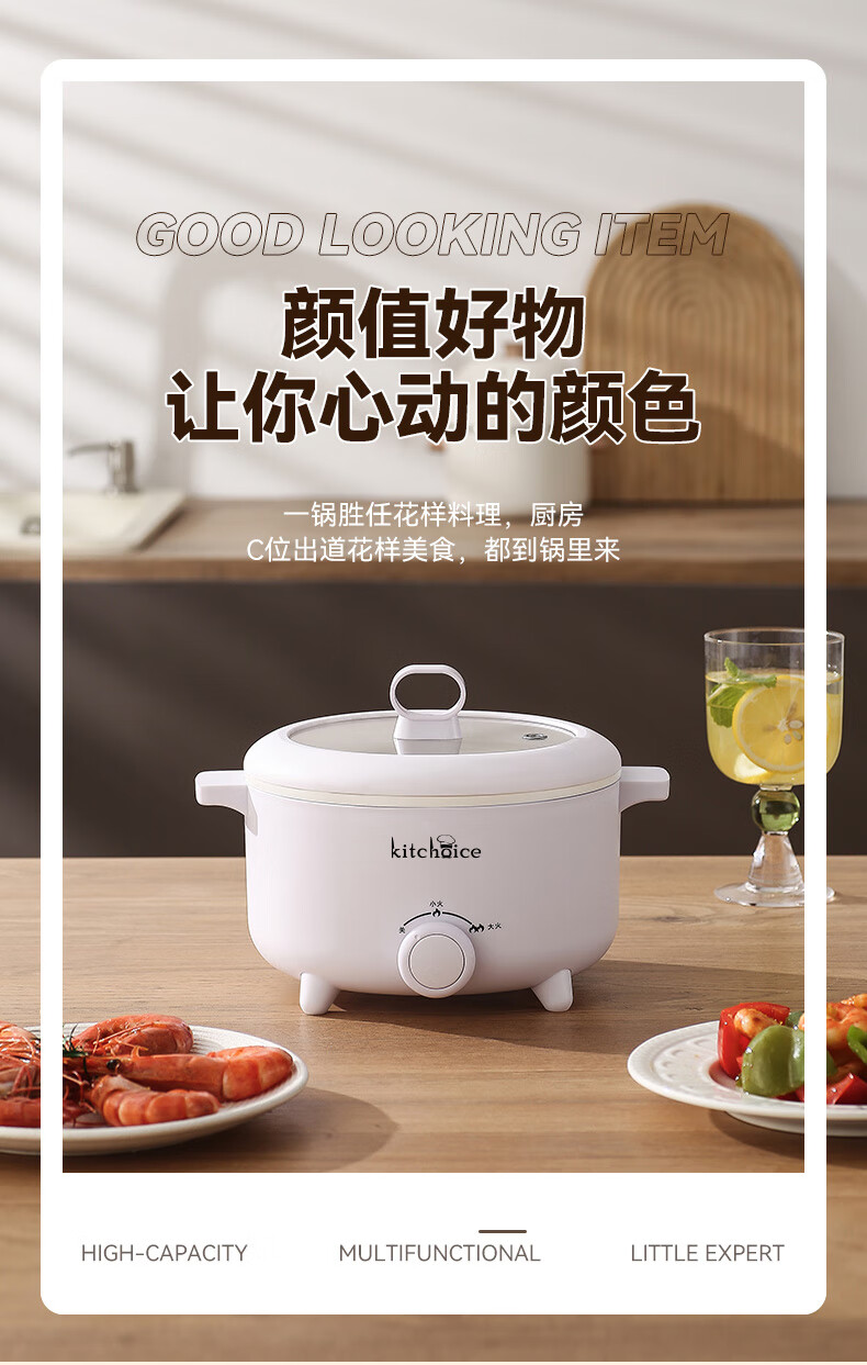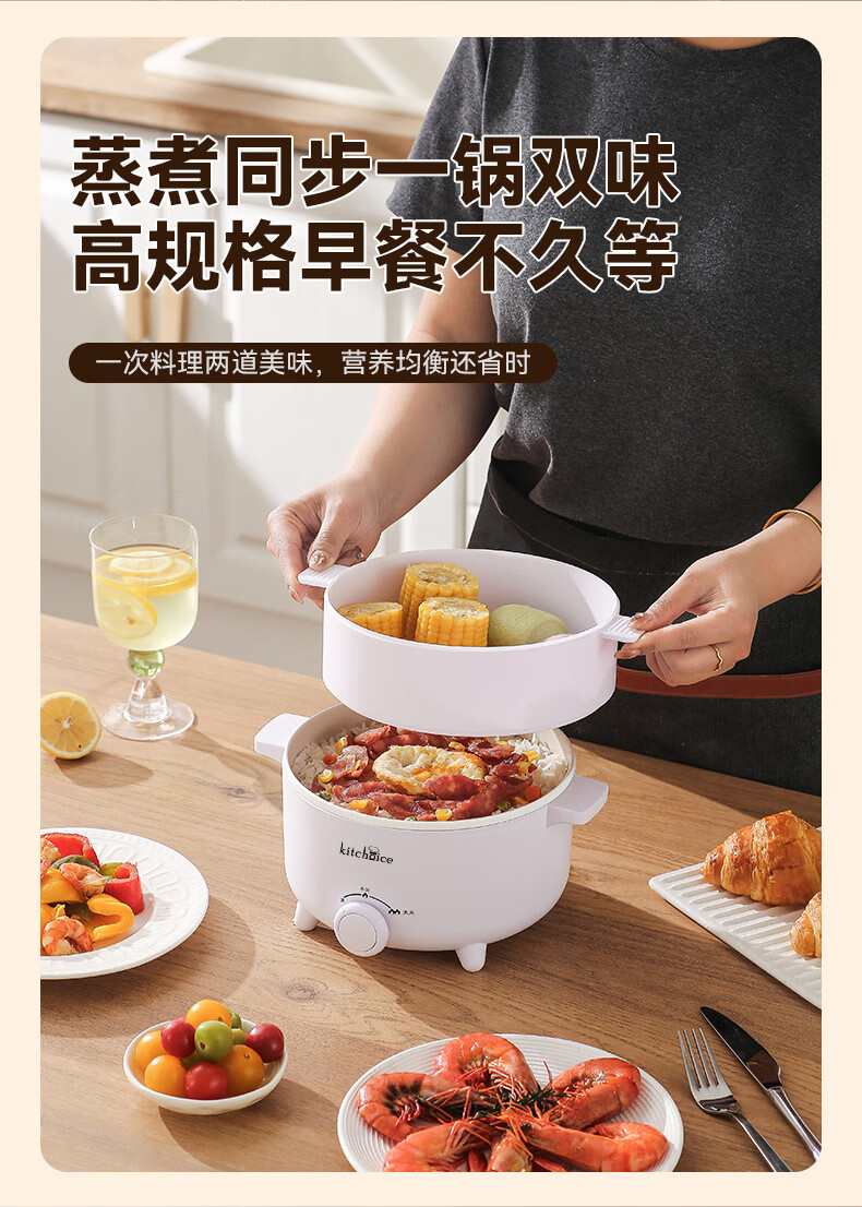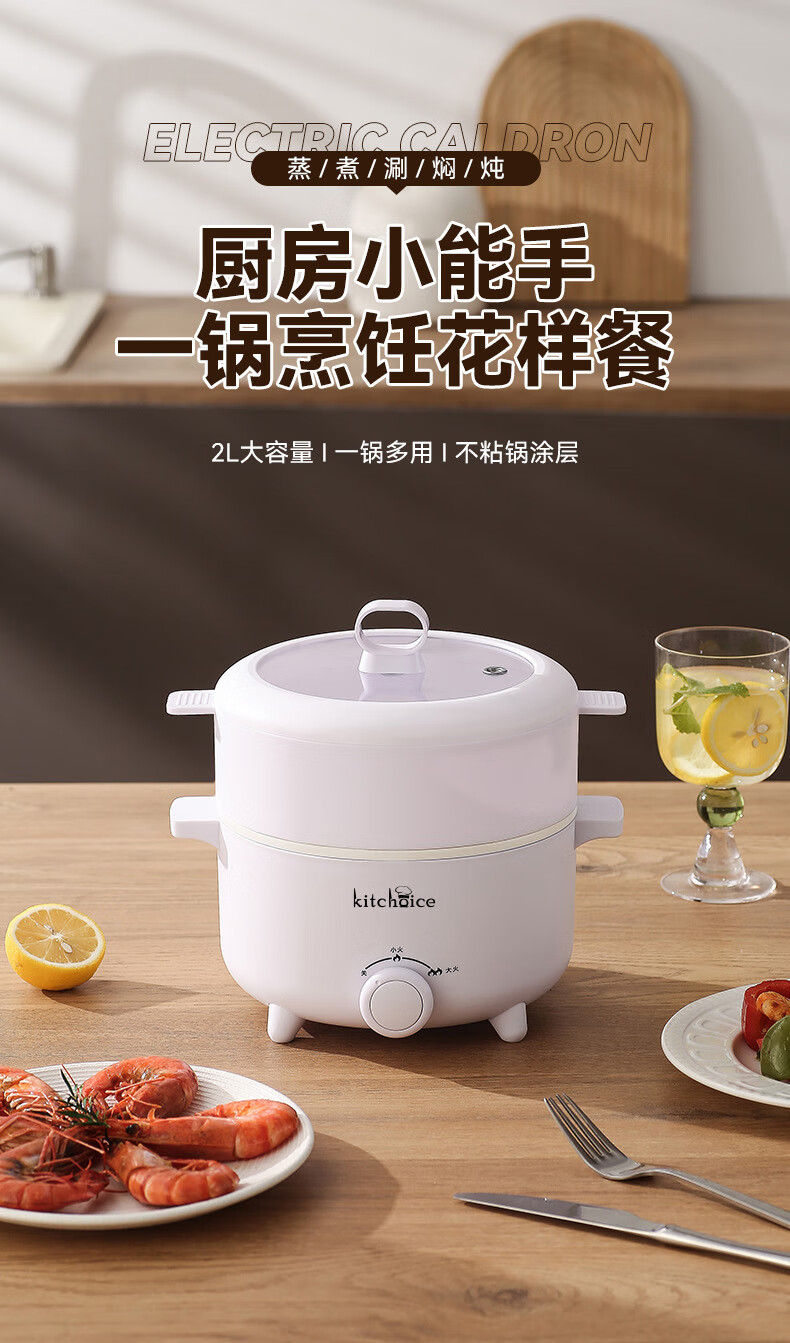 KITCHOICE电煮锅 电热锅 小电锅 宿舍小锅 学生寝室一体泡面小火锅多功能锅煮蛋器宿舍用小电锅煮泡面小锅 2L 豪华款【带竹蒸笼】
