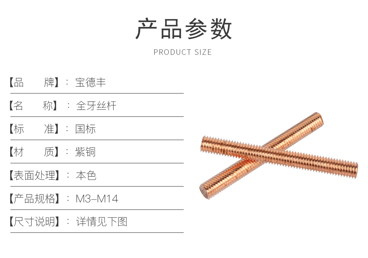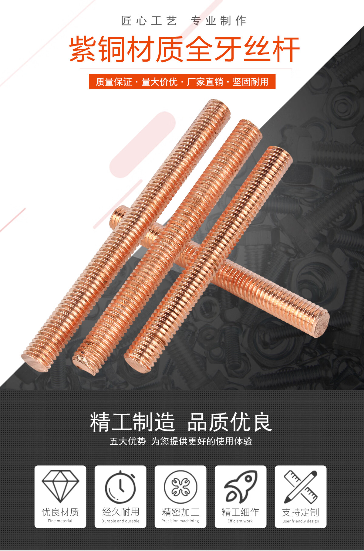宝德丰T2紫铜丝杆红铜牙条螺杆DIN976牙棒螺纹棒M3M4M5M6M8M10M12 M3x1米[1条]