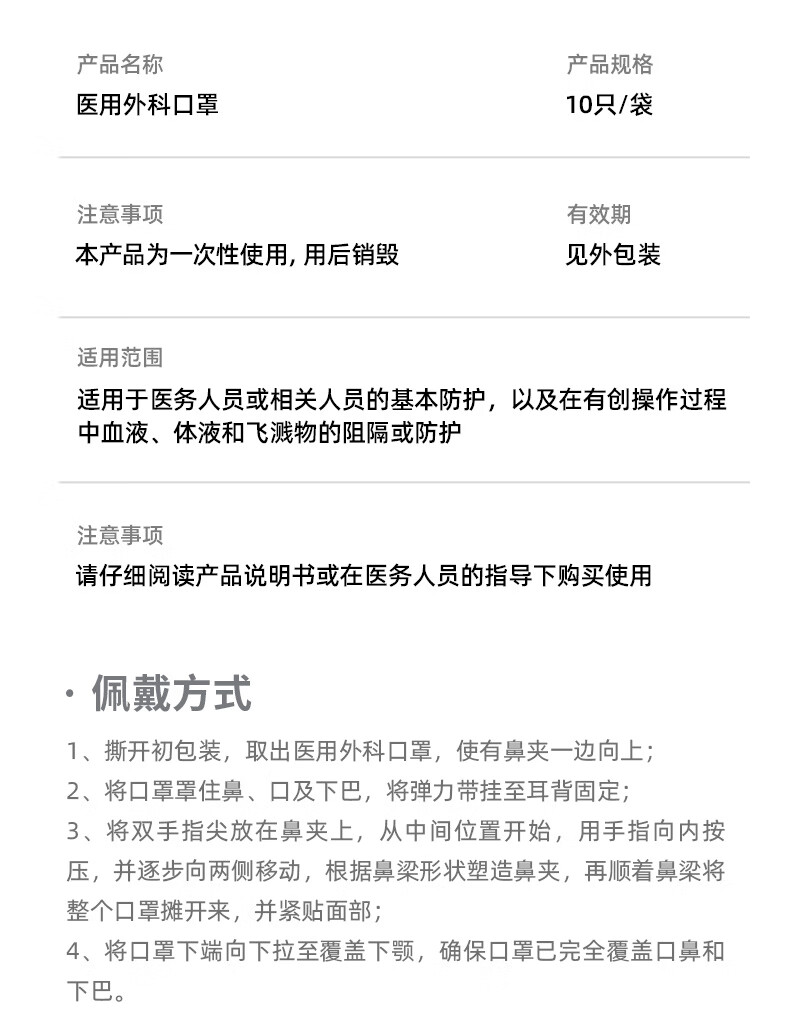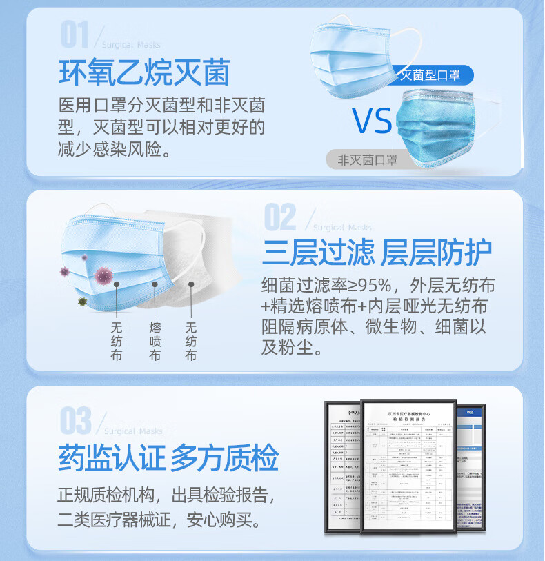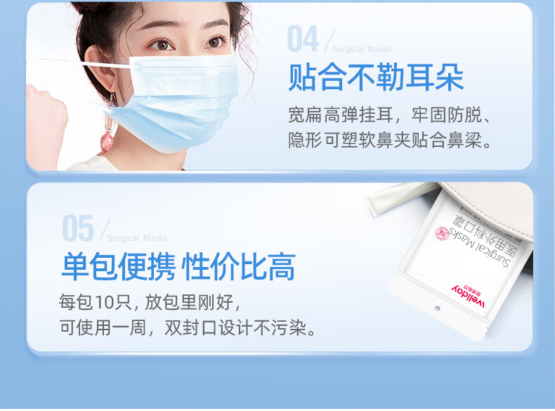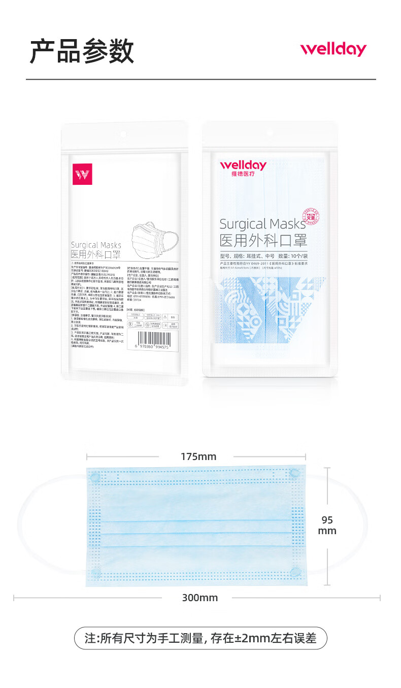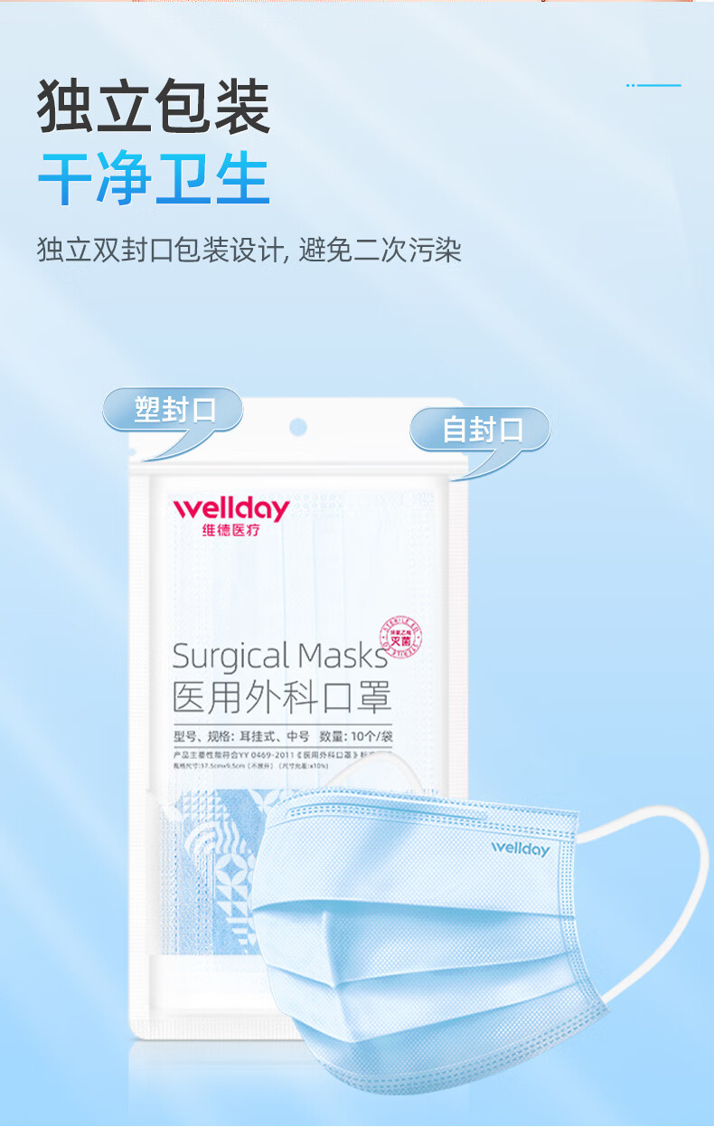 维德(WELLDAY)一次性医用外科口罩挂耳式三层无菌级防细菌轻薄透气医用防护口罩 【白色100只】外科灭菌 10只/袋