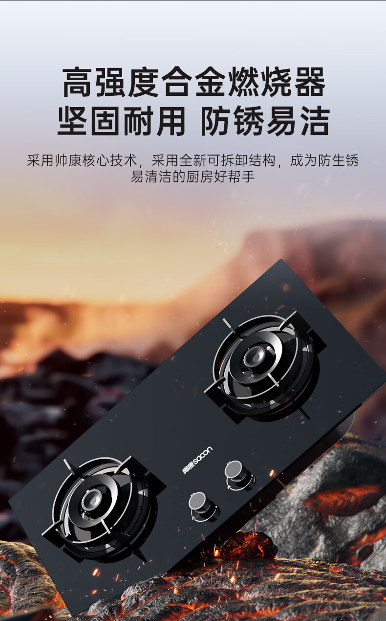 帅康(Sacon)燃气灶煤气灶铜火盖双灶天然气台嵌两用5.2kW双边定时灶免改孔烟灶联动9B828/9G826/9B868Max 5.2kW不锈钢面板灶9G826 天然气