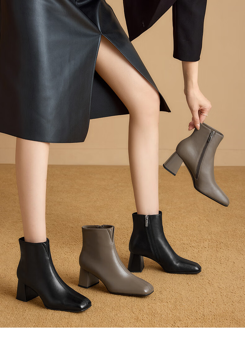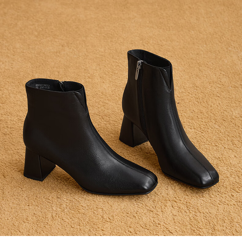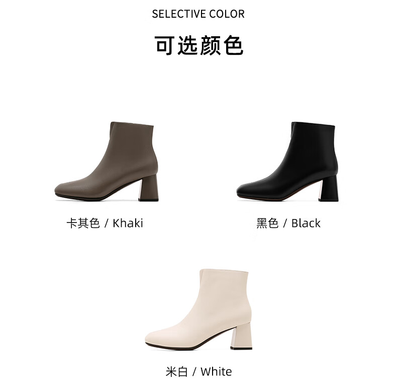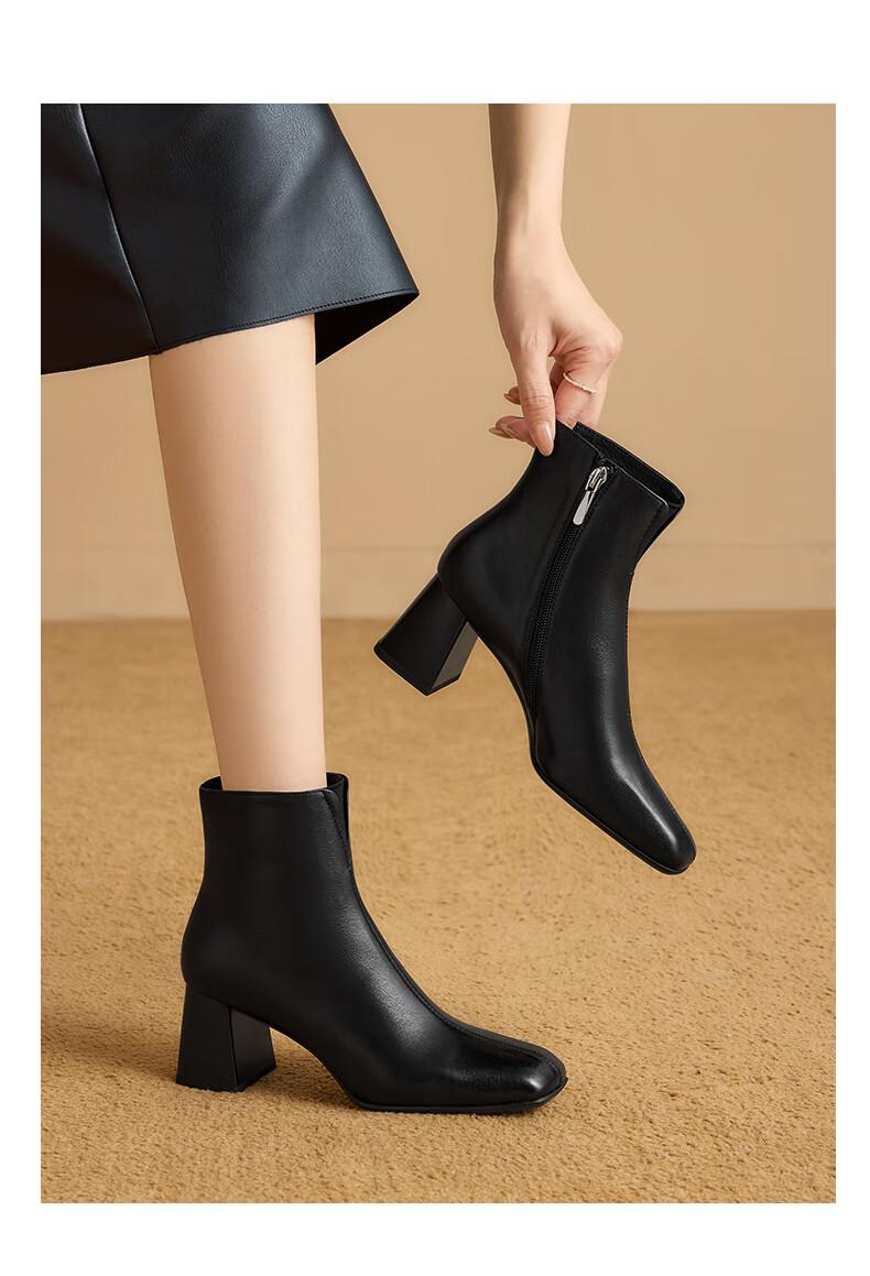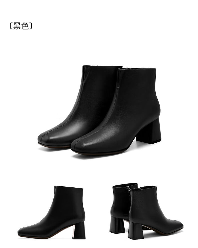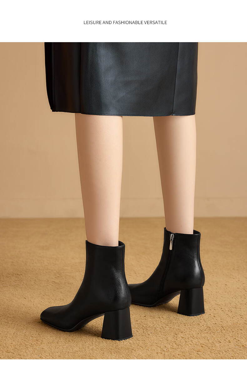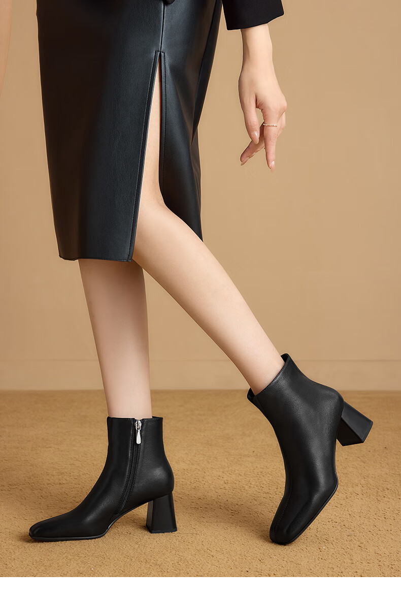 星期六高跟短靴女2025新款秋季增高靴子方头黑色真皮切尔西瘦瘦靴 黑色 37
