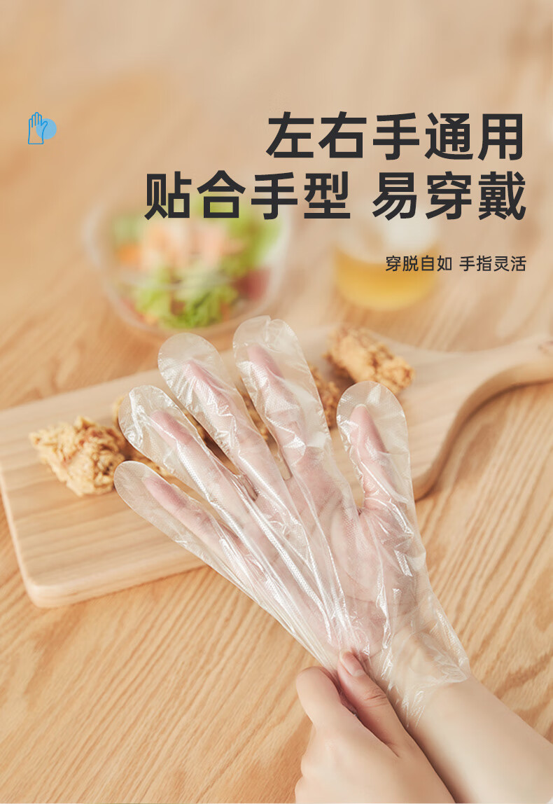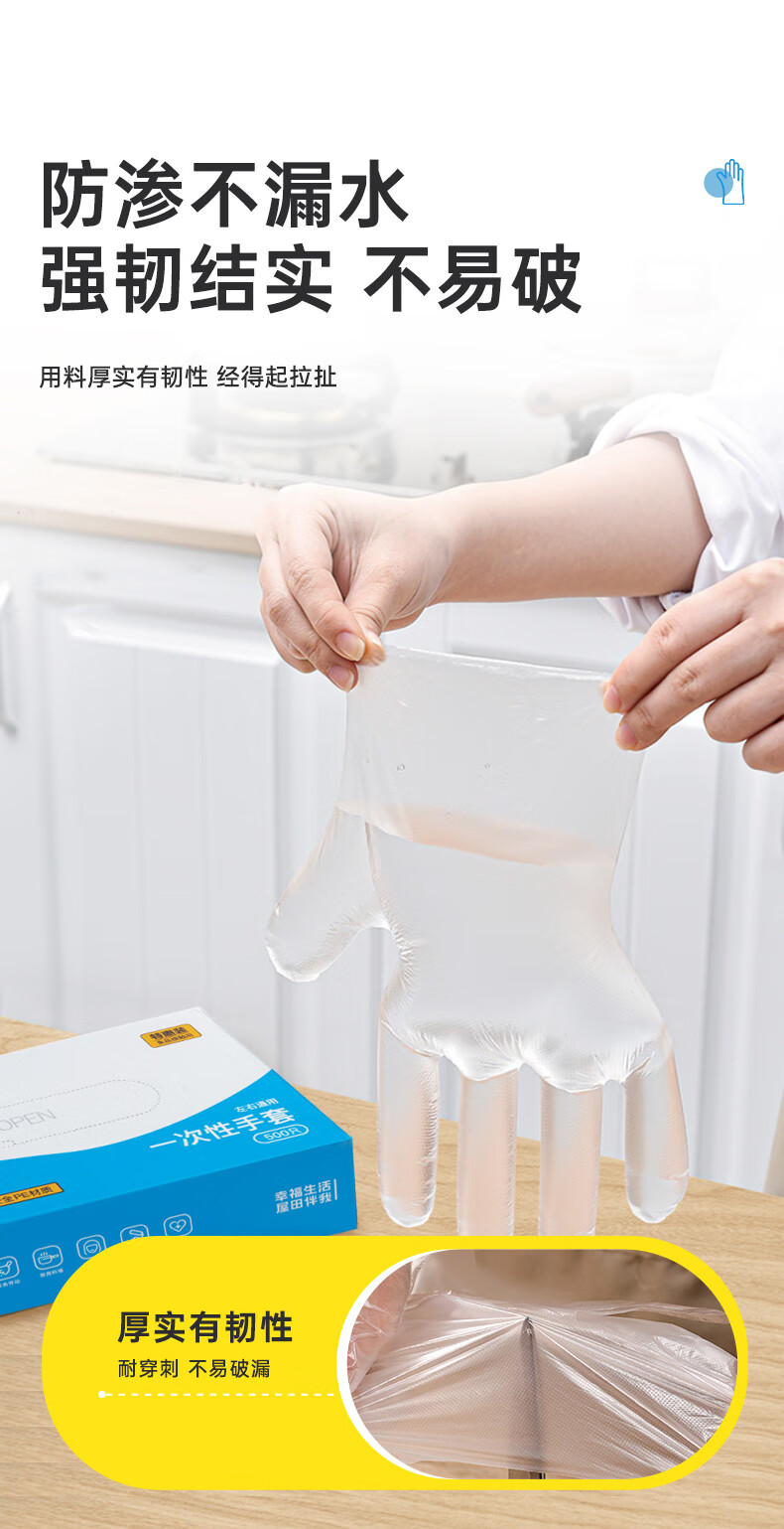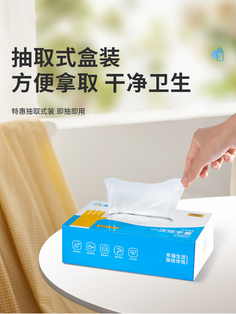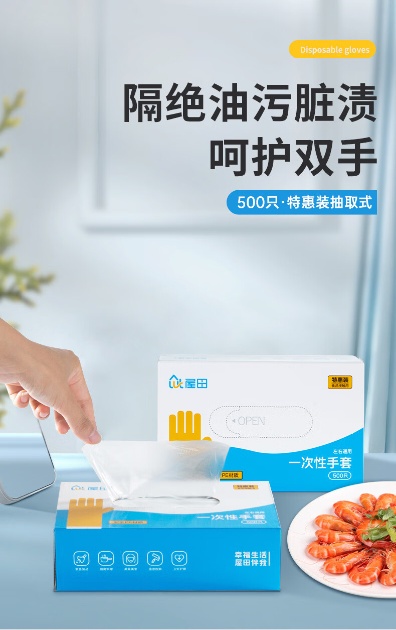 屋田一次性手套食品级500只盒装抽取式加厚塑料PE防漏手套厨房烘焙