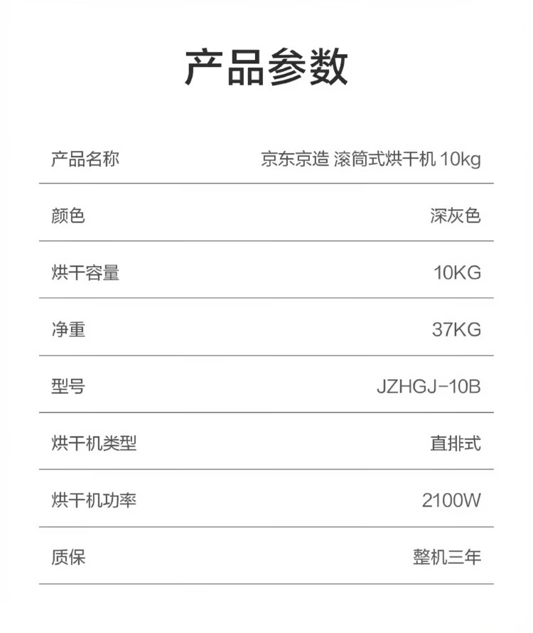 京东京造 烘干机 干衣机 10公斤家用直排式单独单烘干烘干机 烘衣服杀菌祛螨除潮 家电 JZHGJ-10B