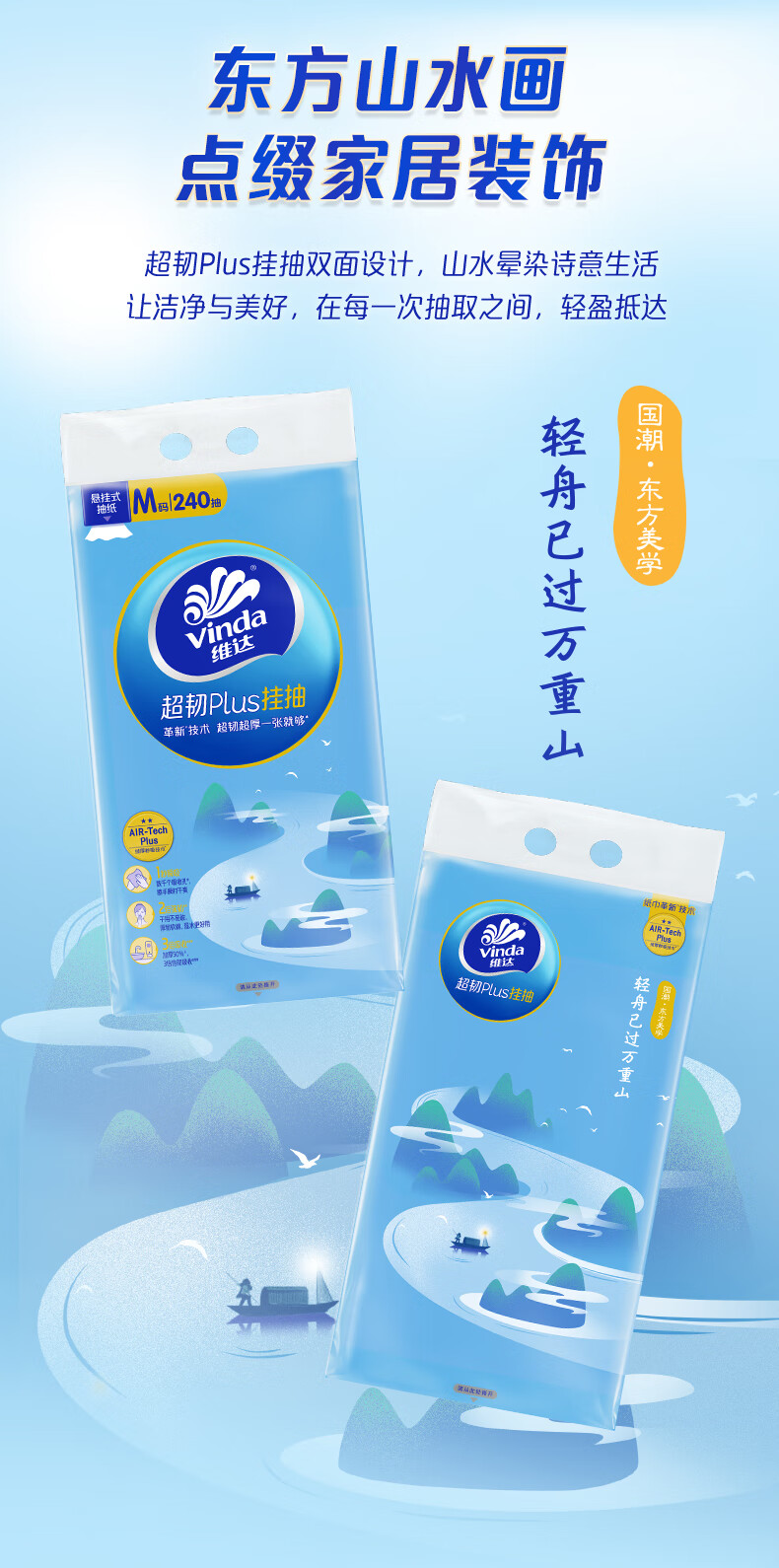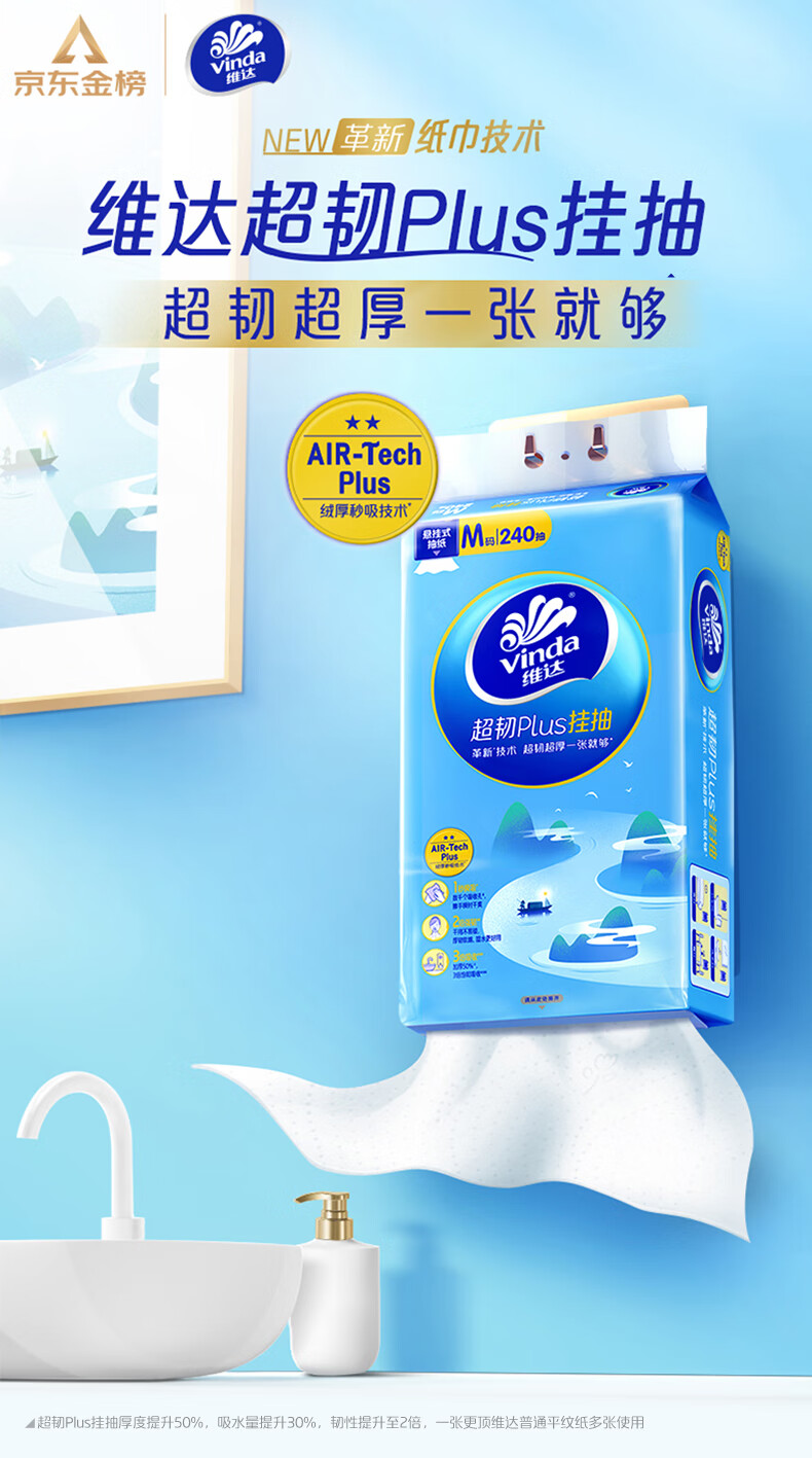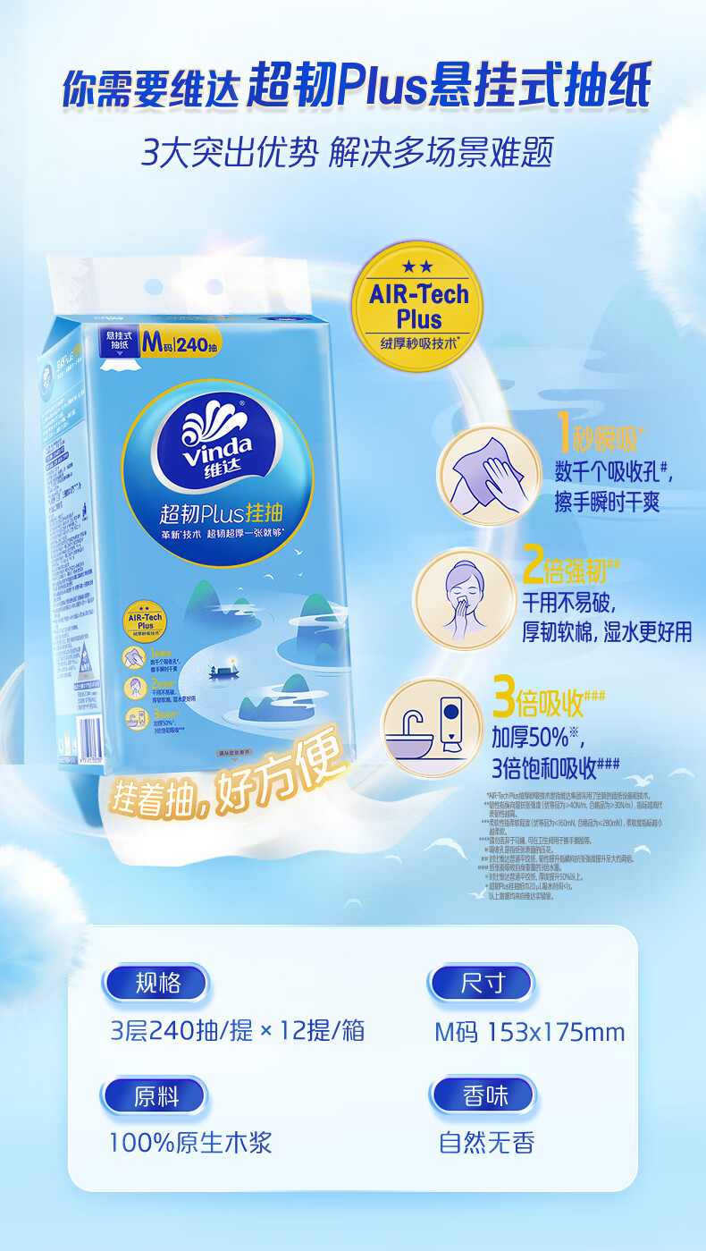 维达(Vinda)抽纸 超韧Plus挂抽3层240抽*12提M码 纸巾抽纸悬挂式京东金榜联合