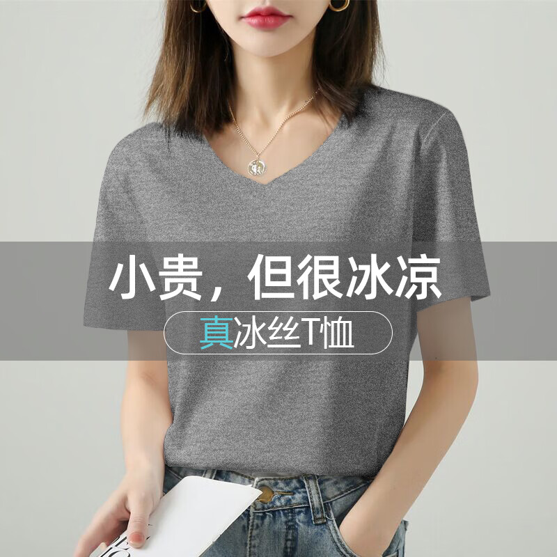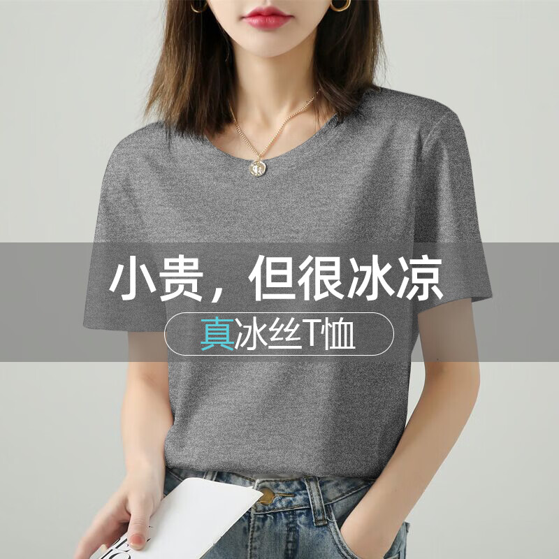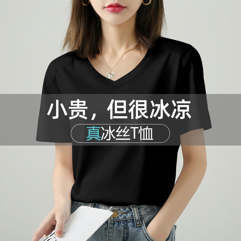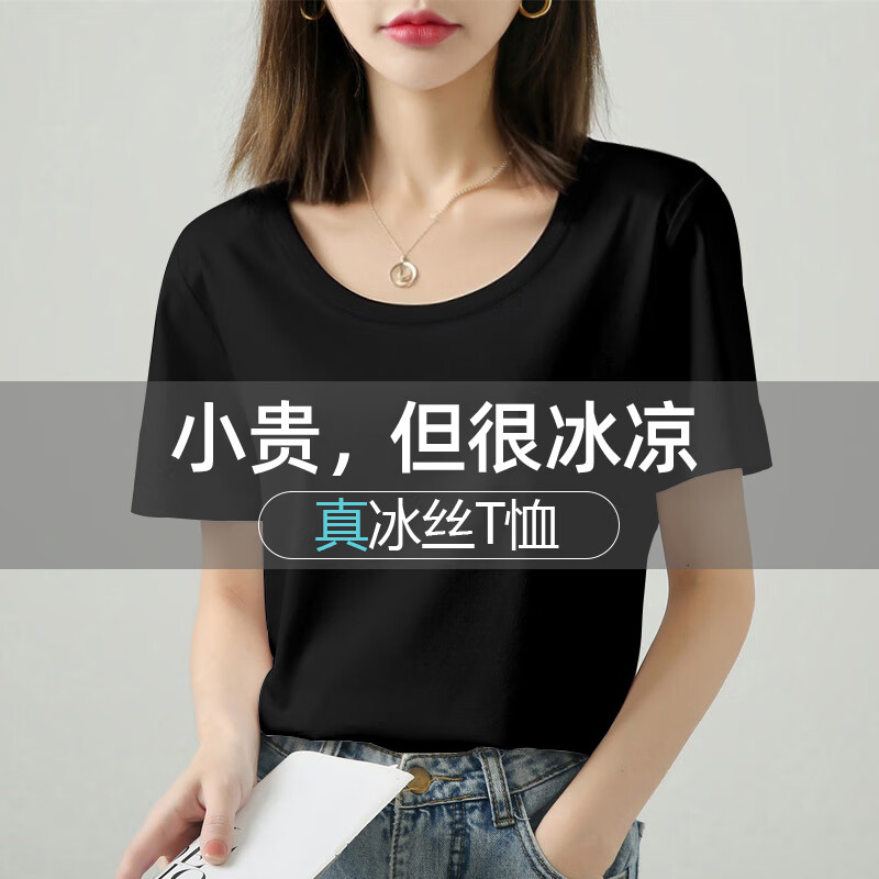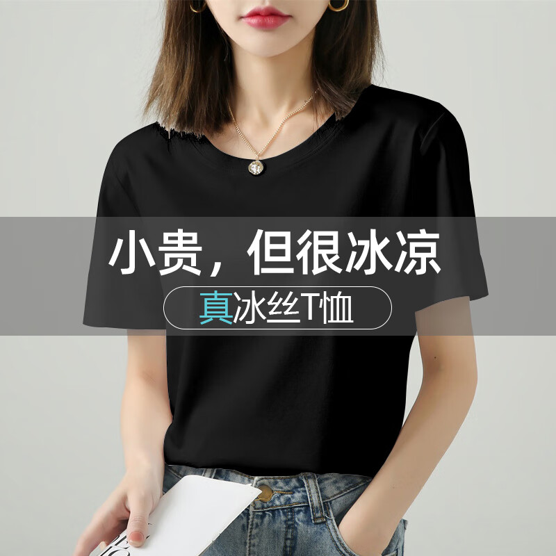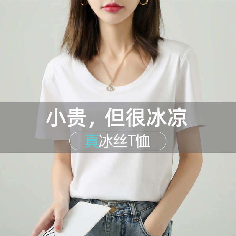 高级感冰丝纯棉白色短袖t恤女夏季新款圆V领U正肩凉感上衣体恤777 【重磅凉感纯棉圆领】白色 挺括型 L 参考100-115斤