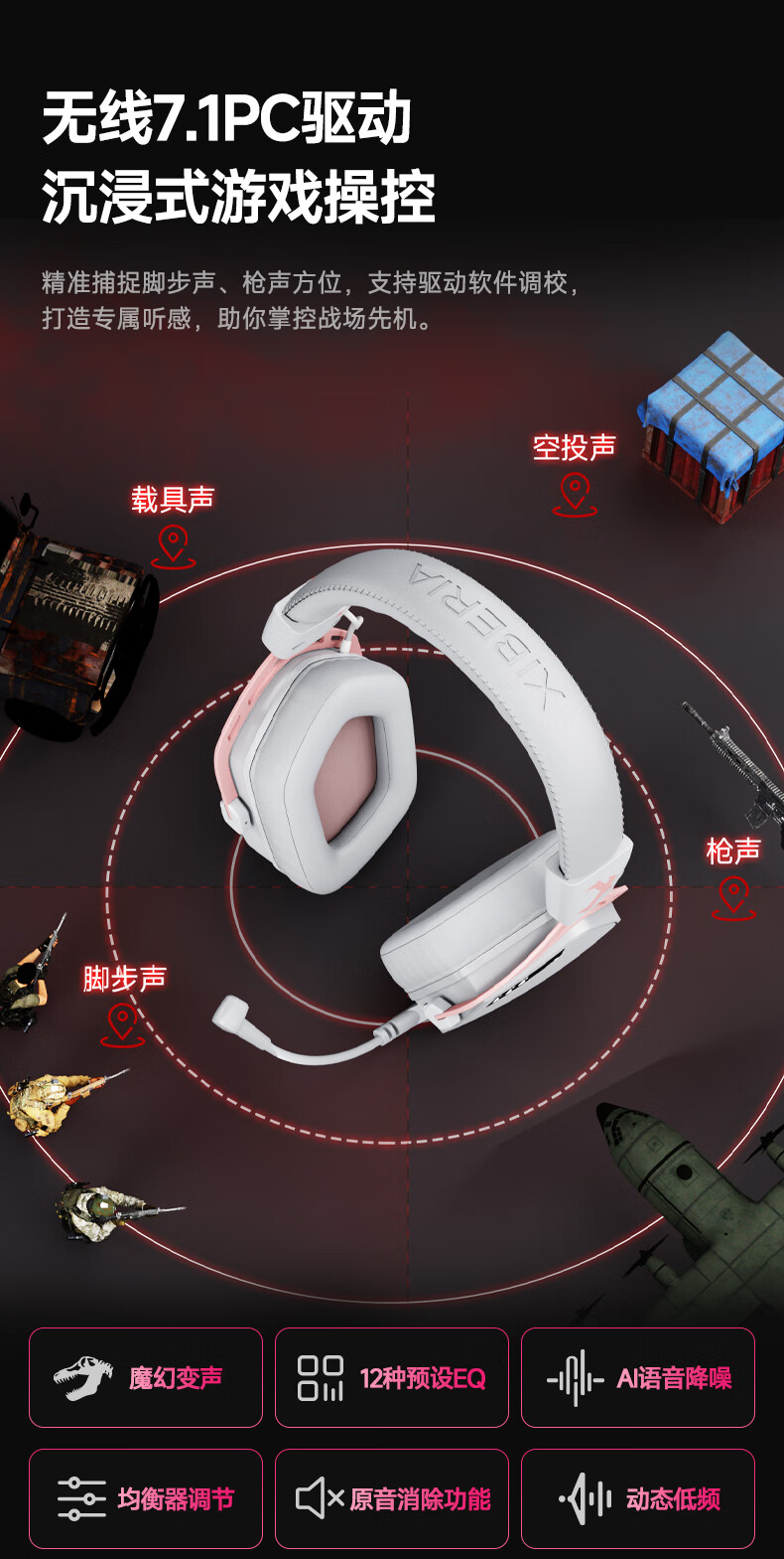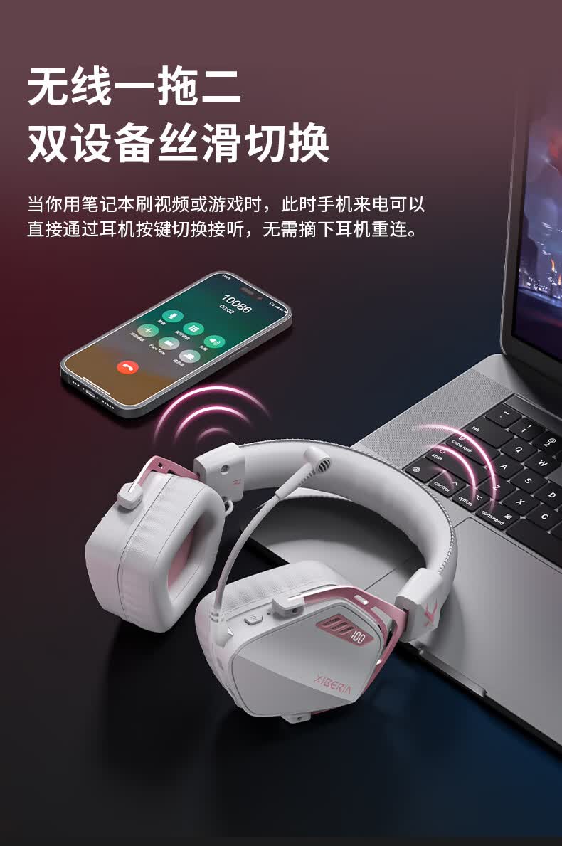 西伯利亚(XIBERIA)K03S7.1版2.4G蓝牙游戏耳机蓝牙无线头戴式手机低延迟电竞专用可视化电量极光粉【小叮当推荐】