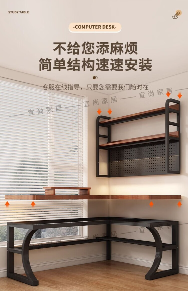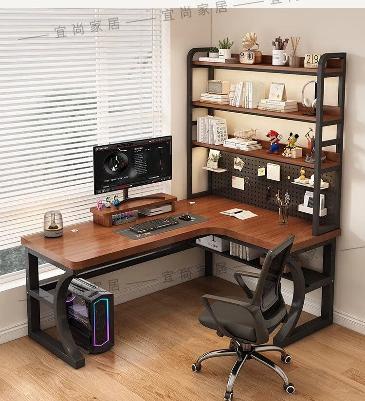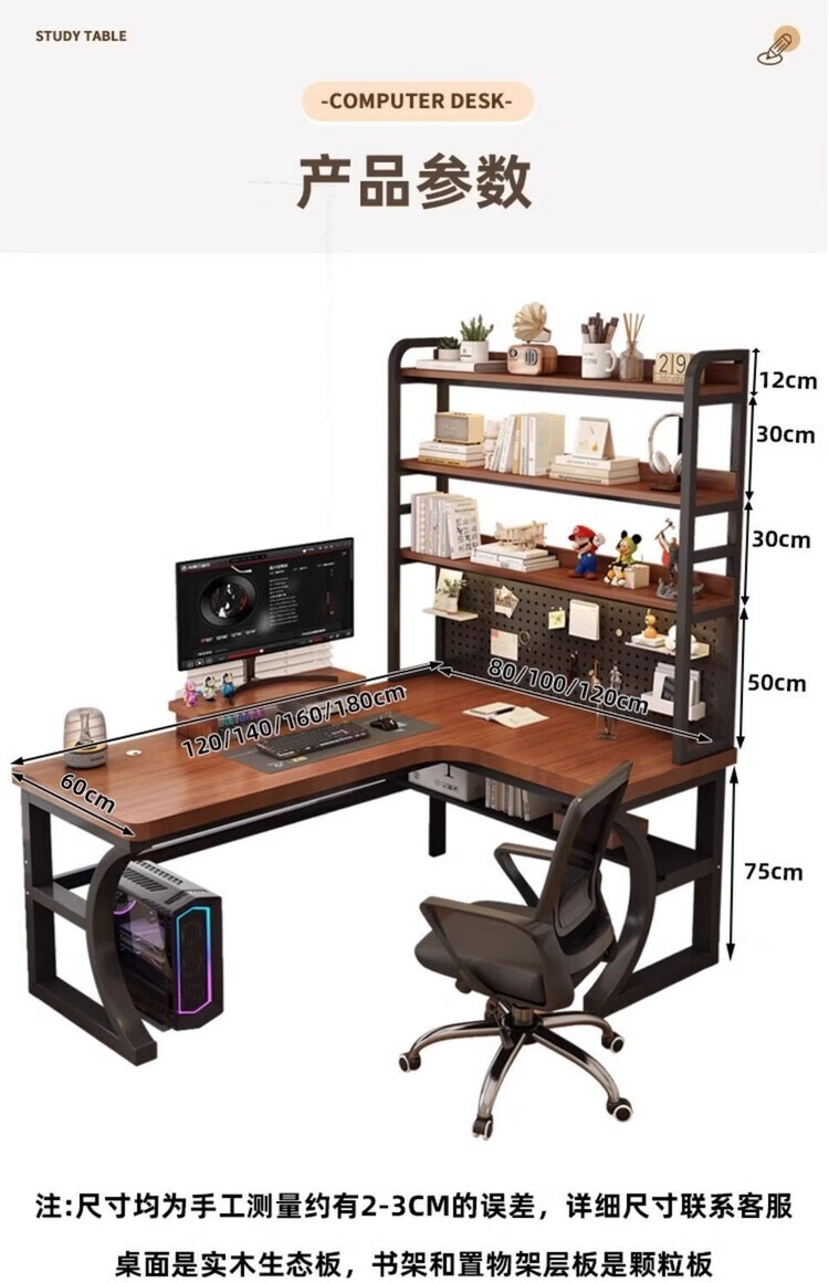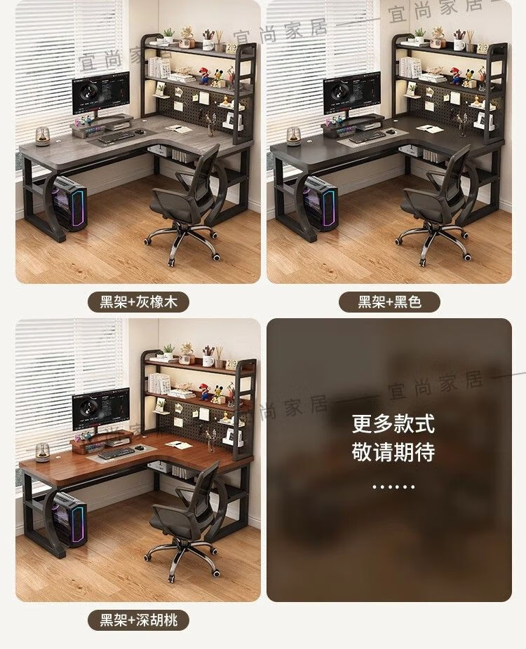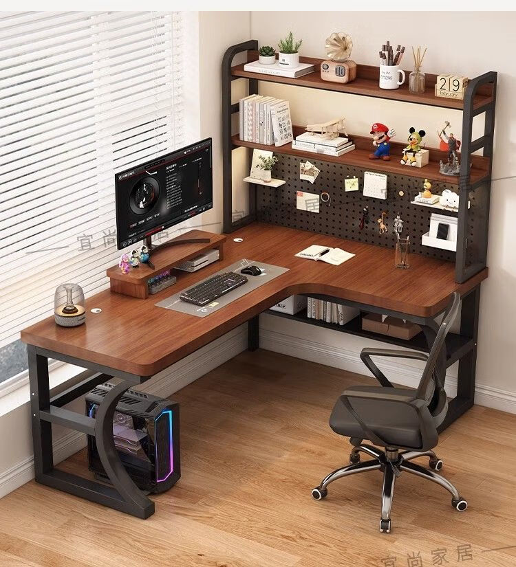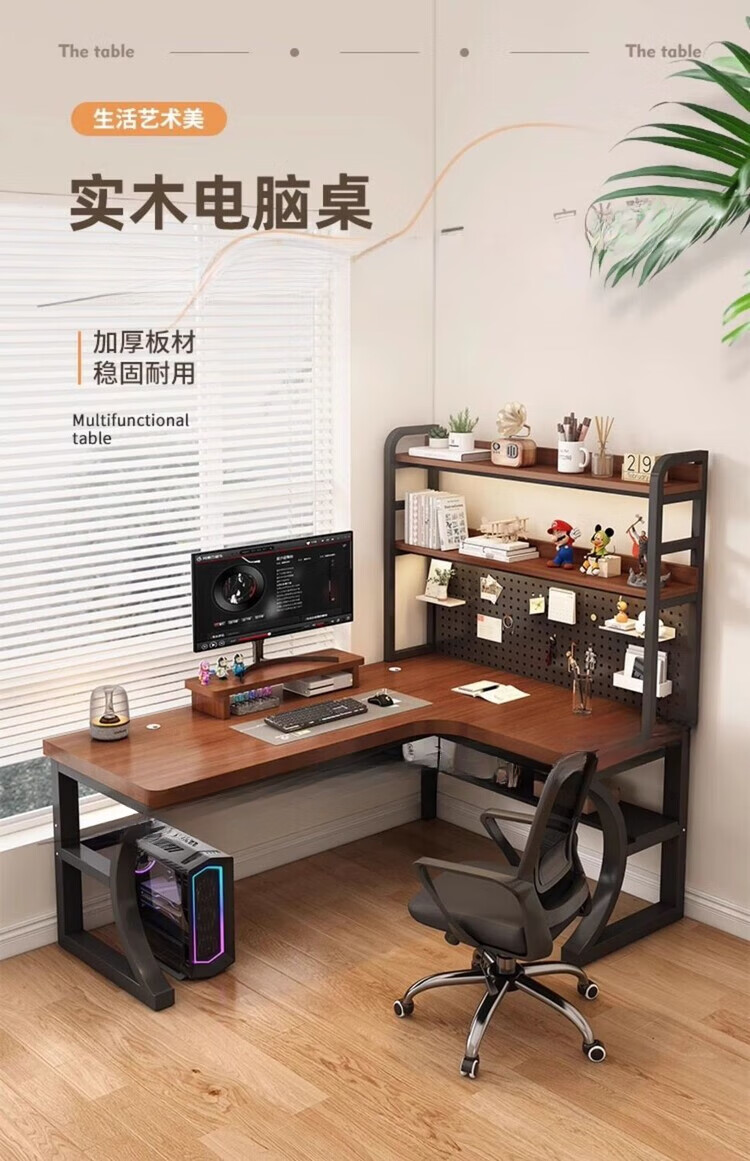 迈途森实木转角电脑桌卧室家用台式书桌书架一体学生电竞桌拐角办公桌子 三层书架+洞洞板【25MM桌面】胡桃色+黑架 120*80*74cm:【左转角】