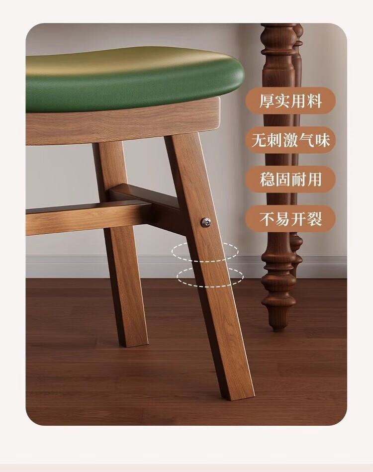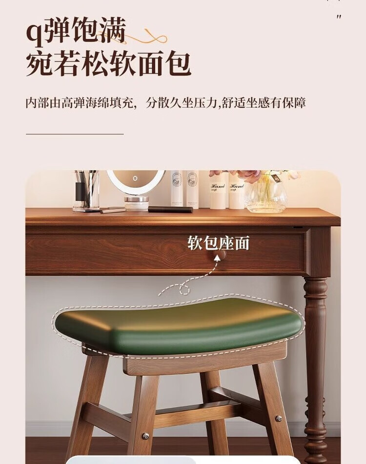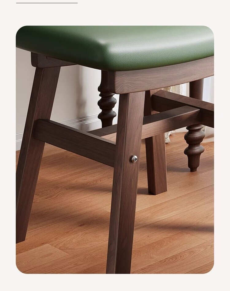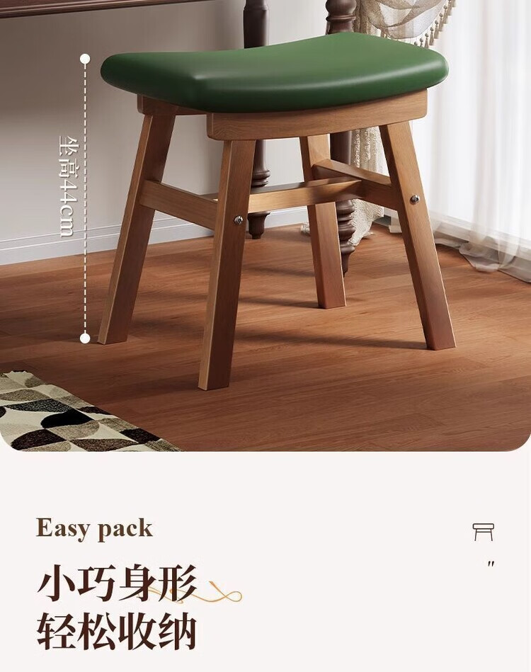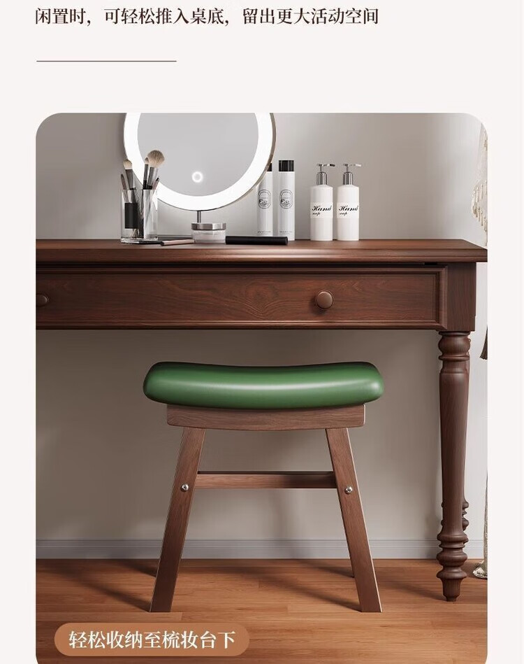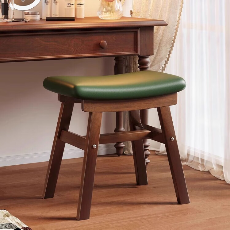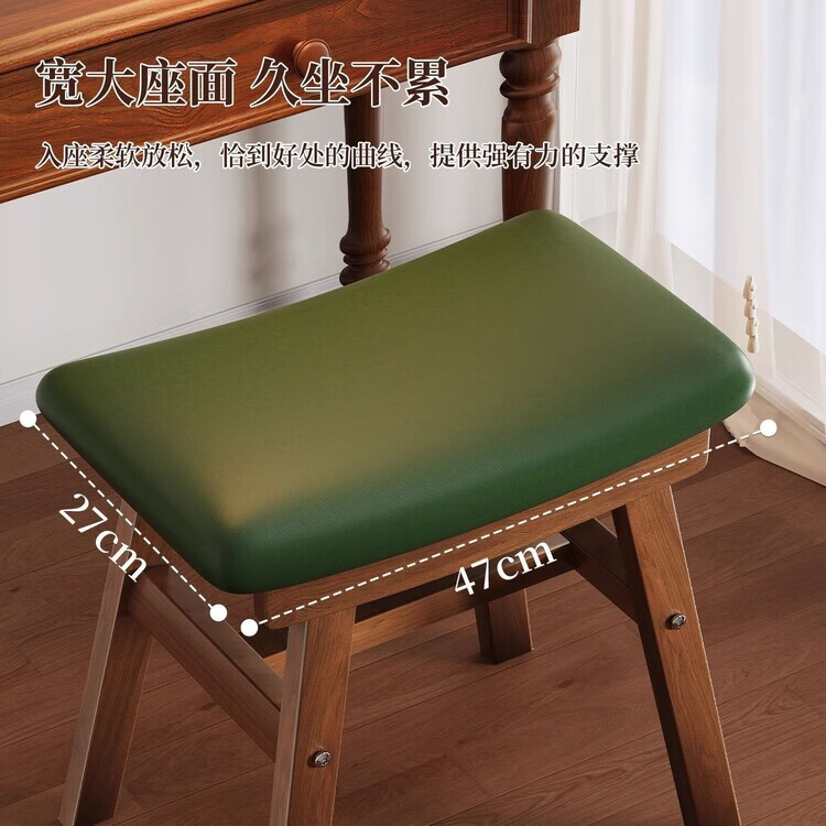 海诗圣堡实木凳子化妆凳女生卧室家用梳妆台椅子轻奢高级美甲方凳软包板凳 胡桃色+墨绿色超纤皮-高弹海绵-加固横梁