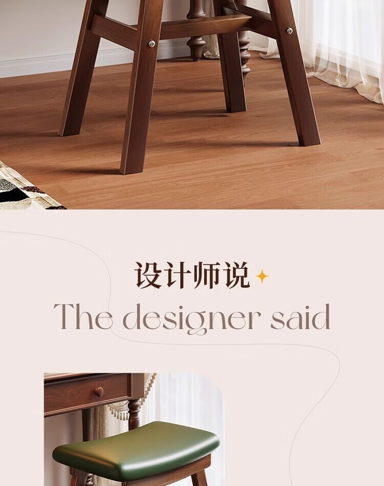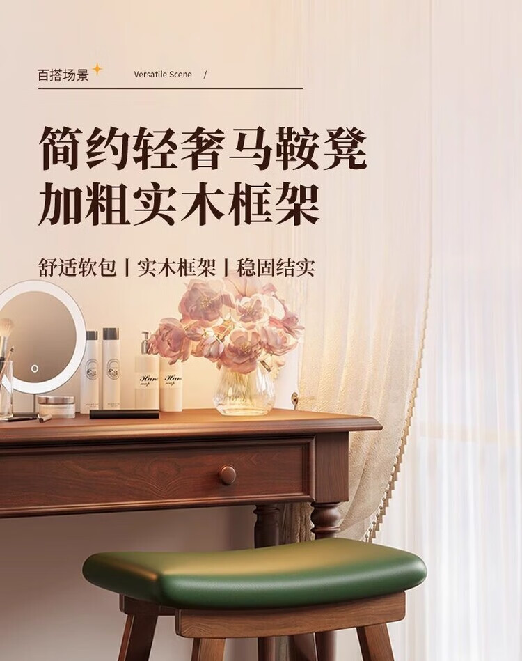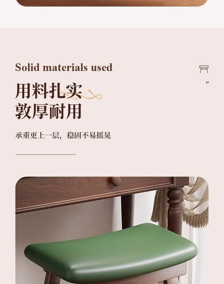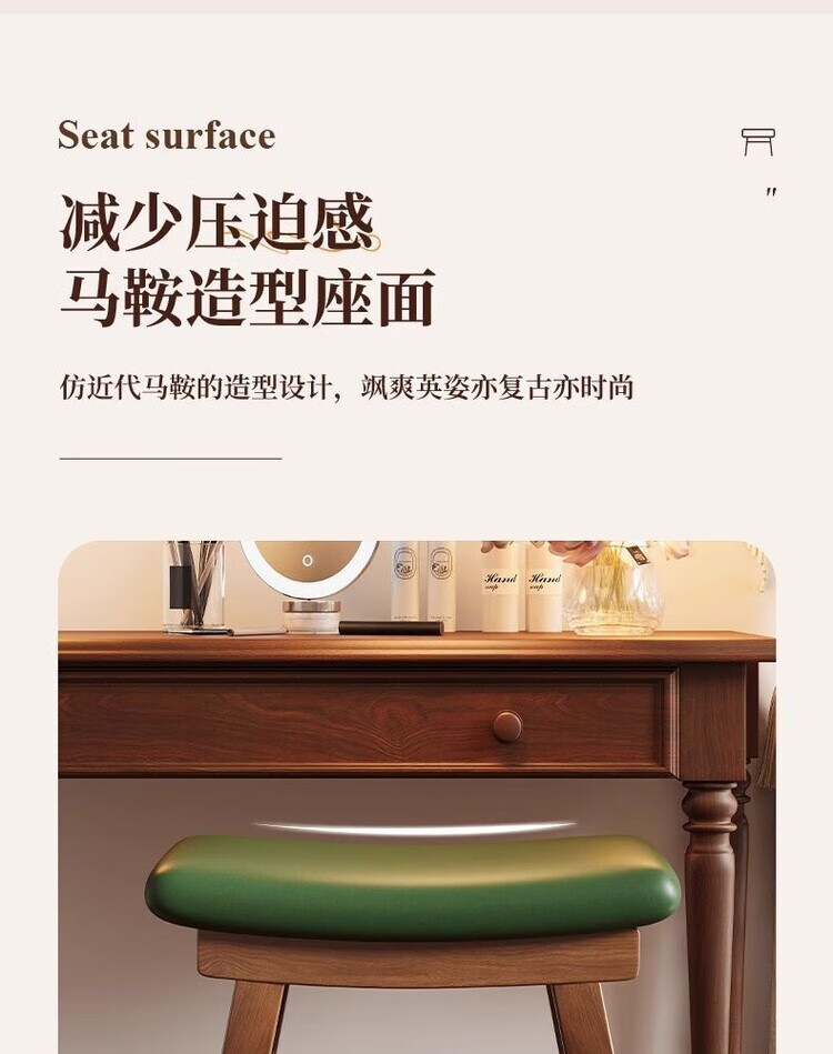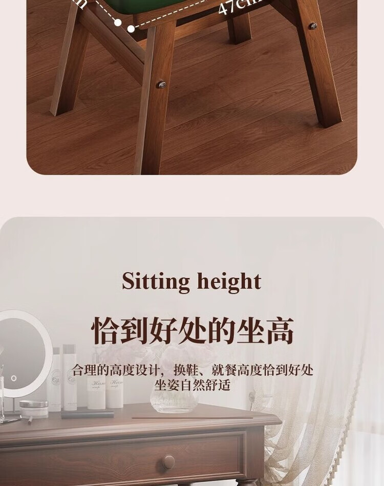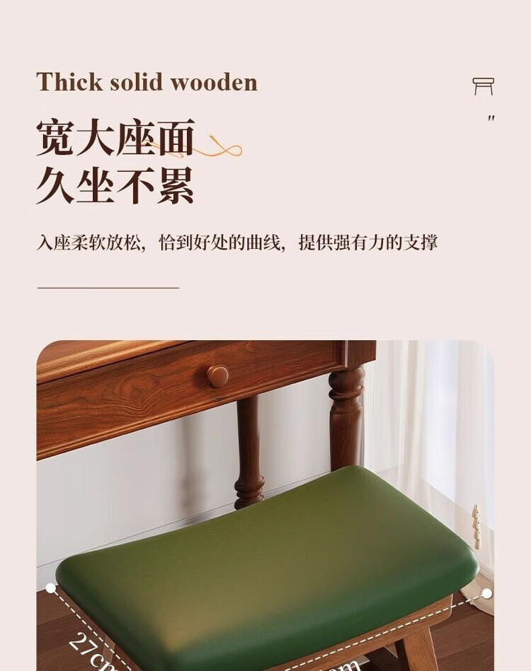 海诗圣堡实木凳子化妆凳女生卧室家用梳妆台椅子轻奢高级美甲方凳软包板凳 胡桃色+墨绿色超纤皮-高弹海绵-加固横梁