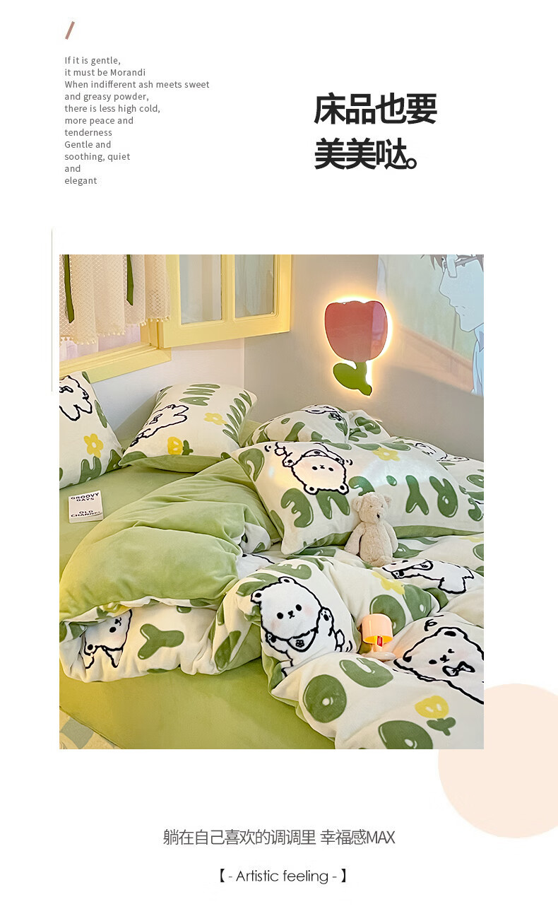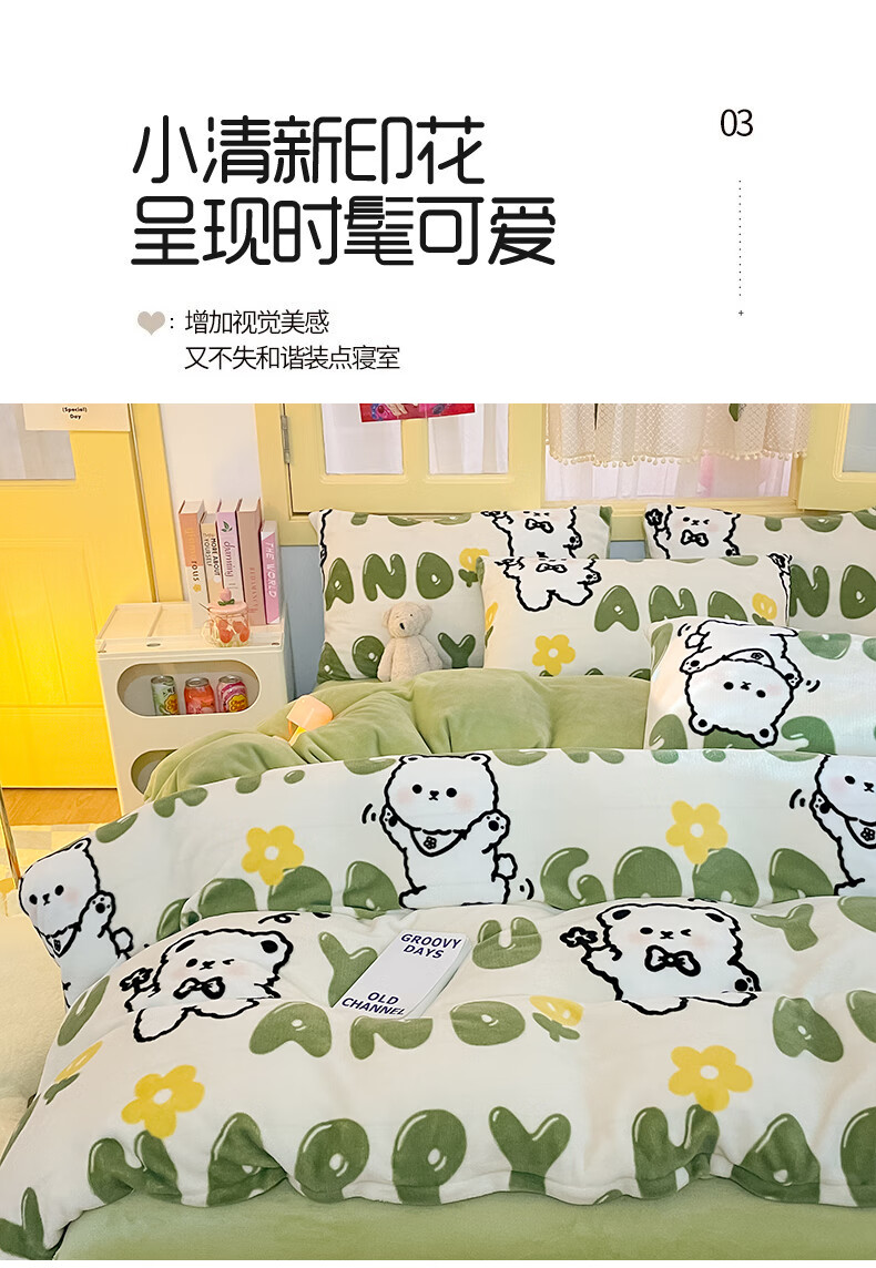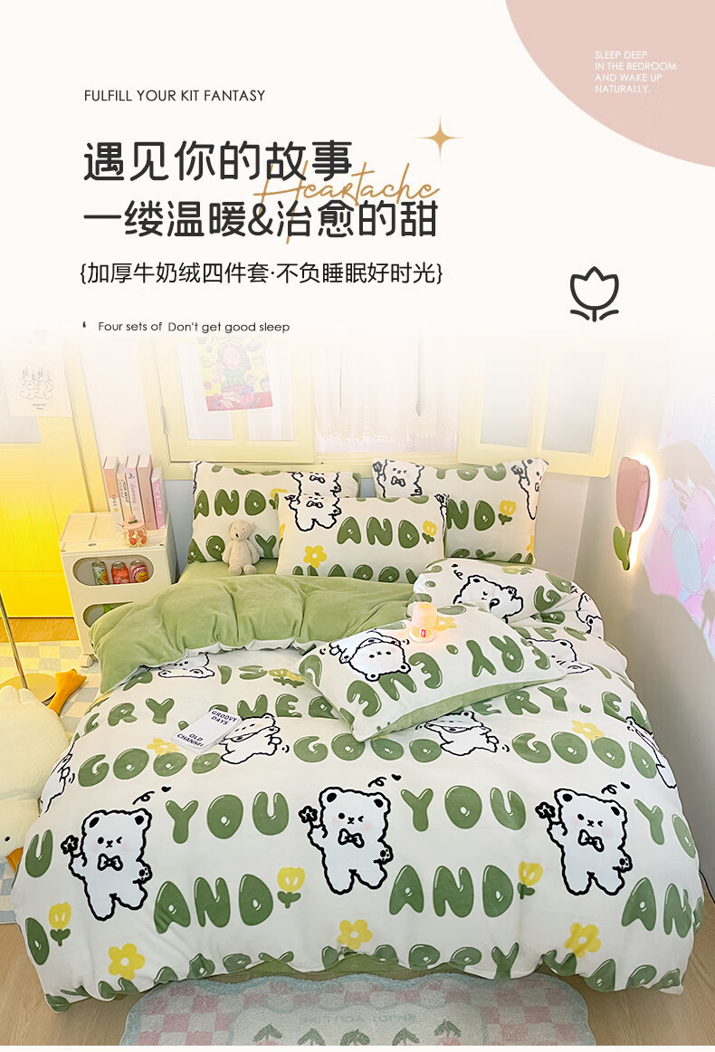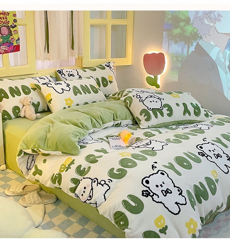 猫人(MiiOW)牛奶绒床上四件套 冬季加绒保暖床单被套罩床笠单双人床品三件套 绿色字母狗 1.5/1.8 床单款 四件套(被套200*230)