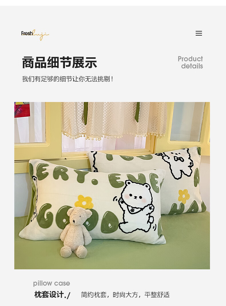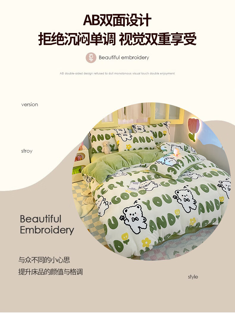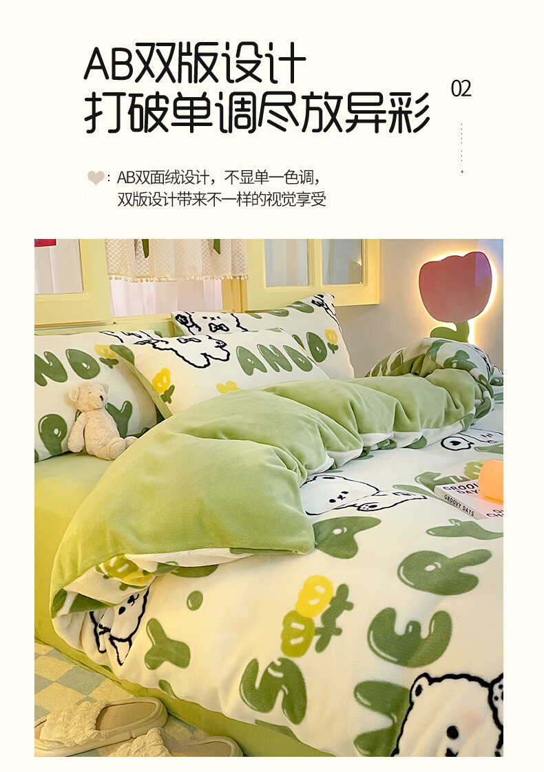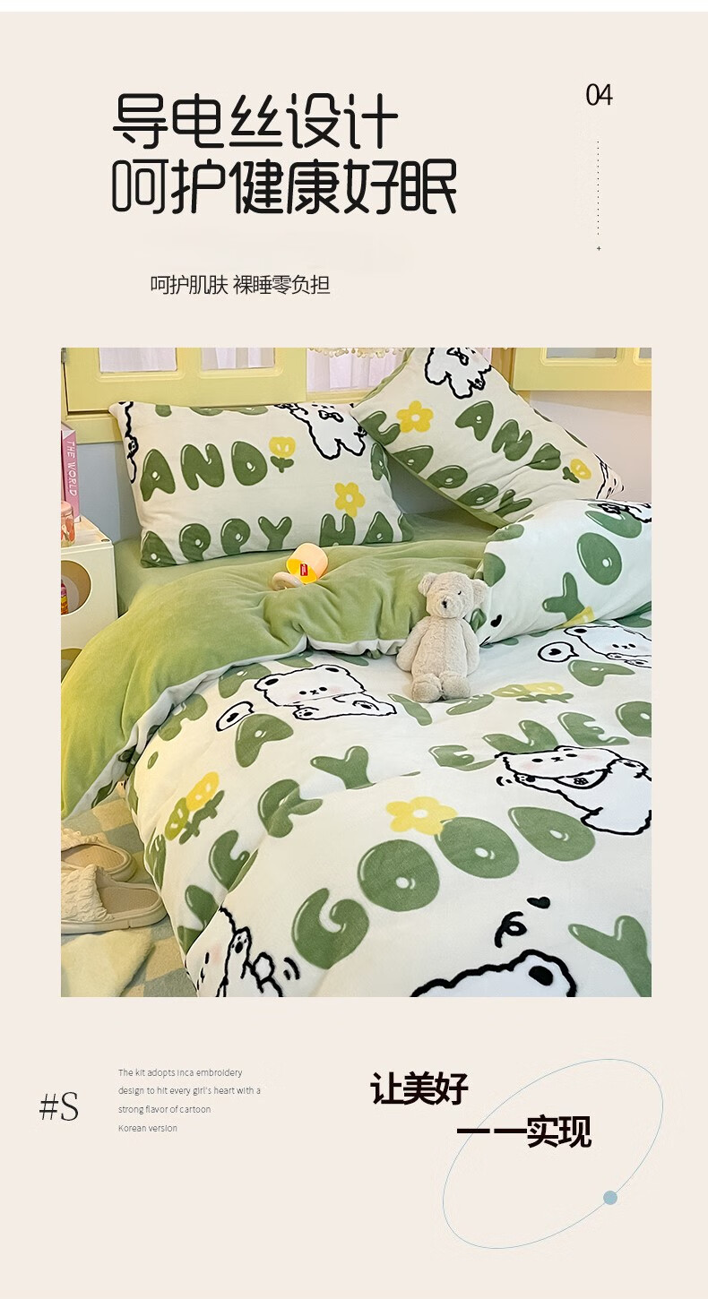 猫人(MiiOW)牛奶绒床上四件套 冬季加绒保暖床单被套罩床笠单双人床品三件套 绿色字母狗 1.5/1.8 床单款 四件套(被套200*230)