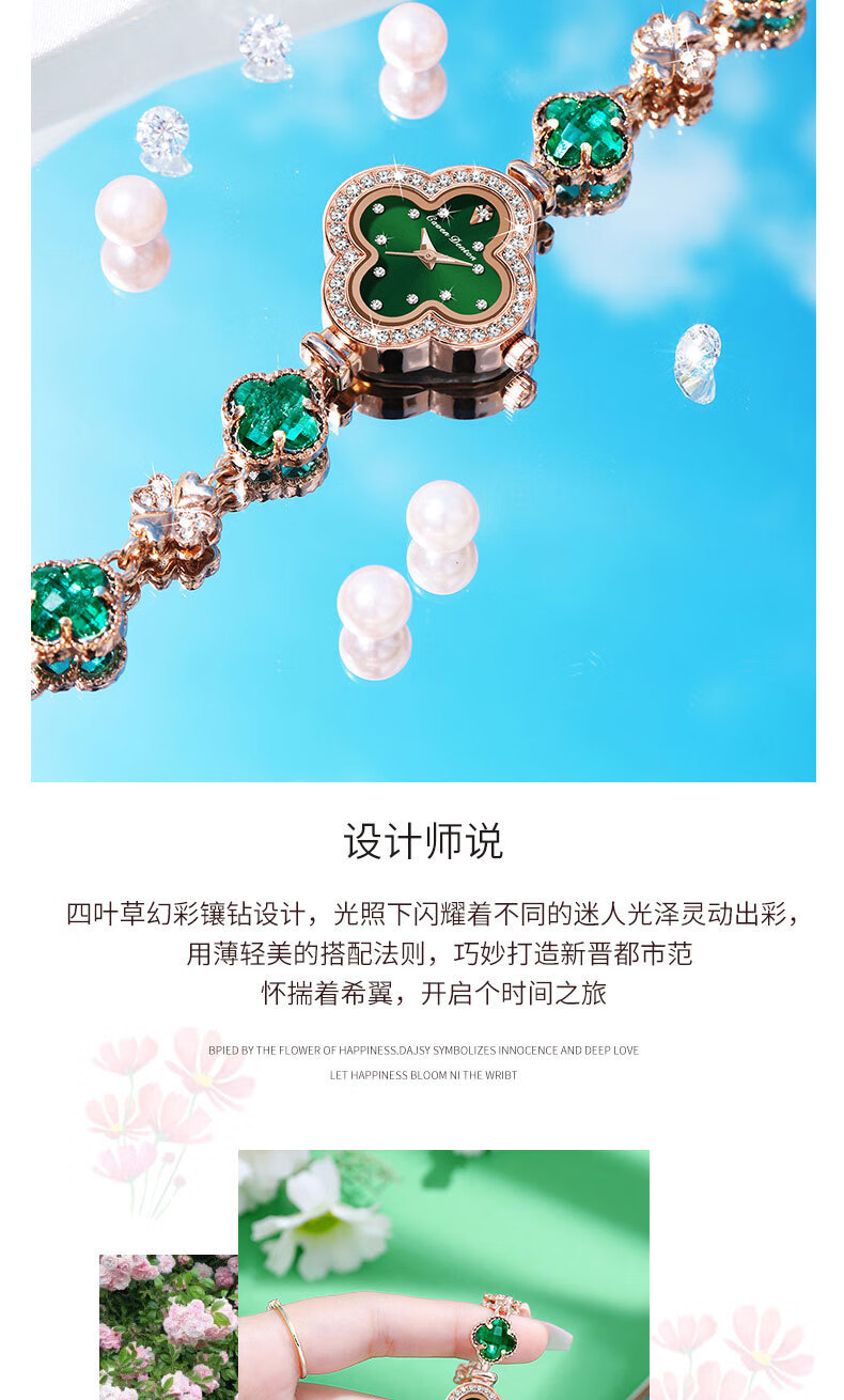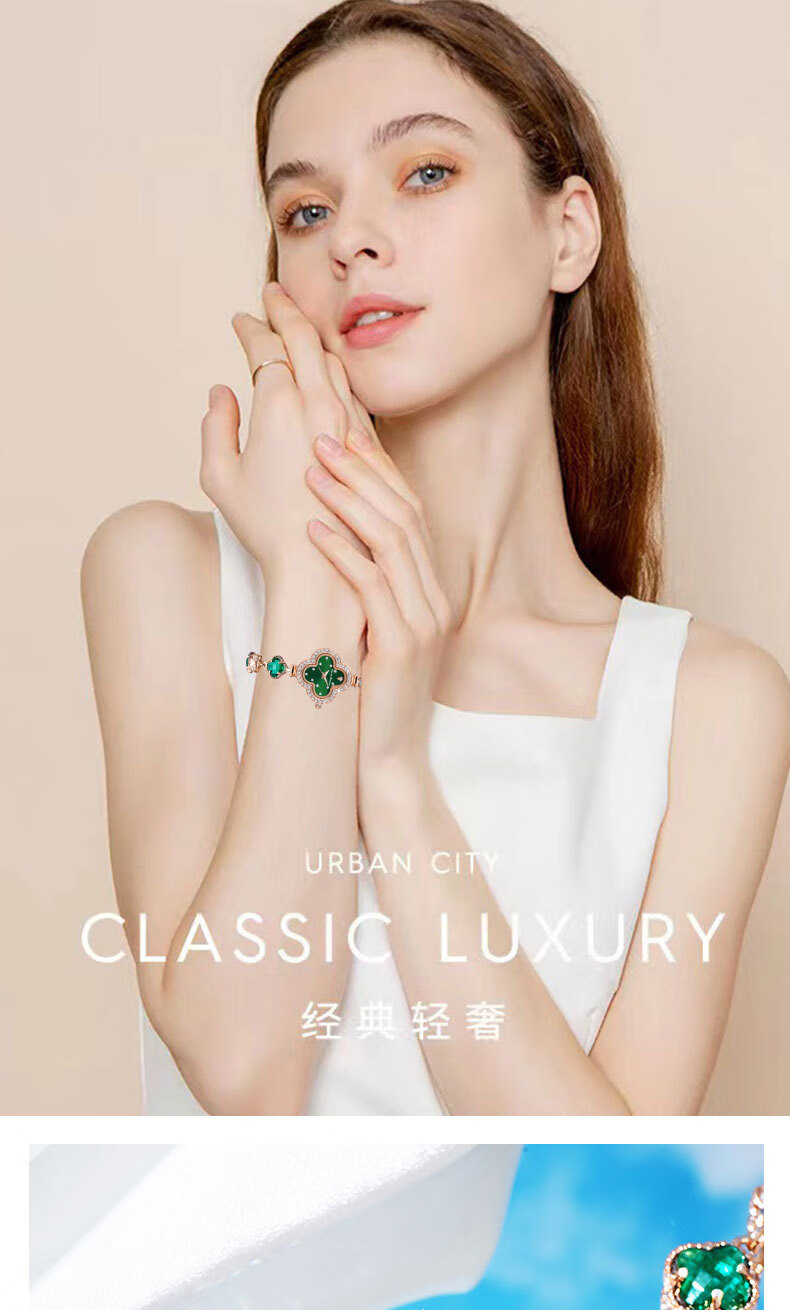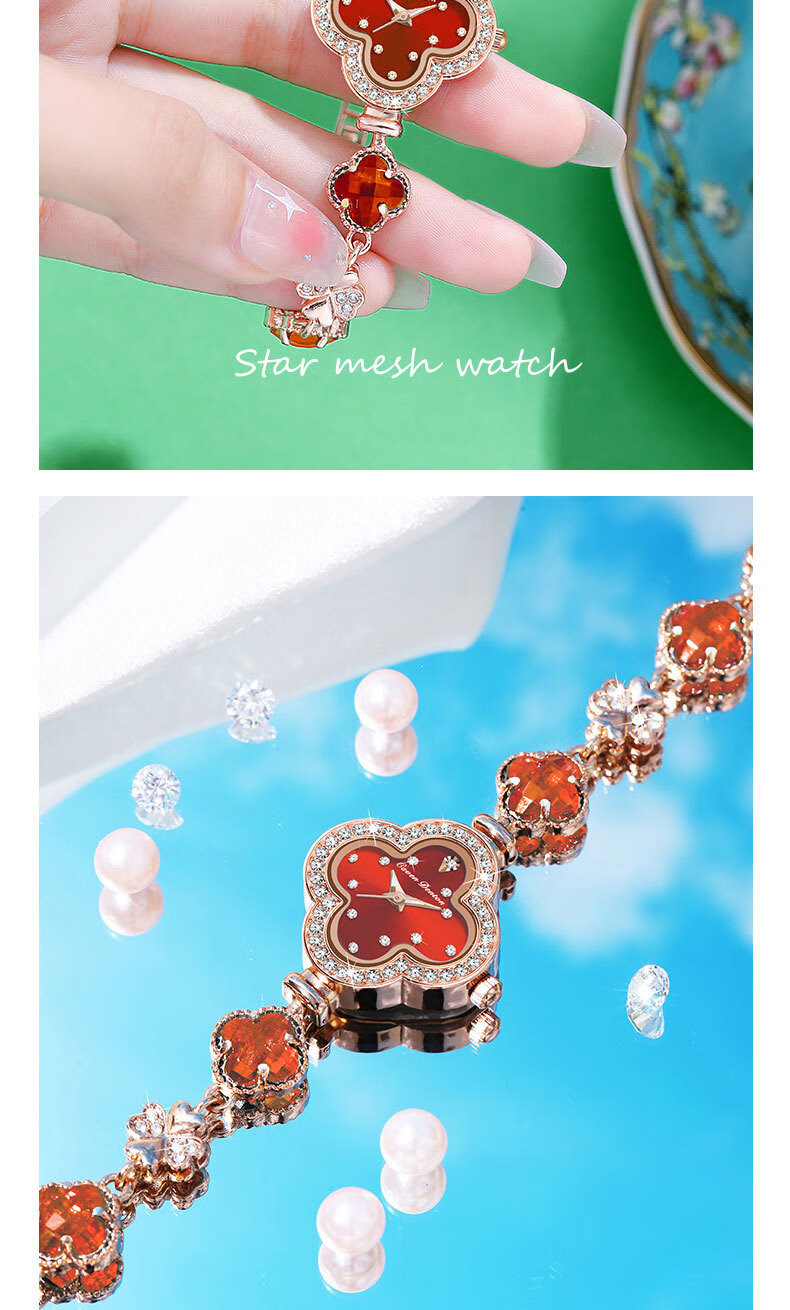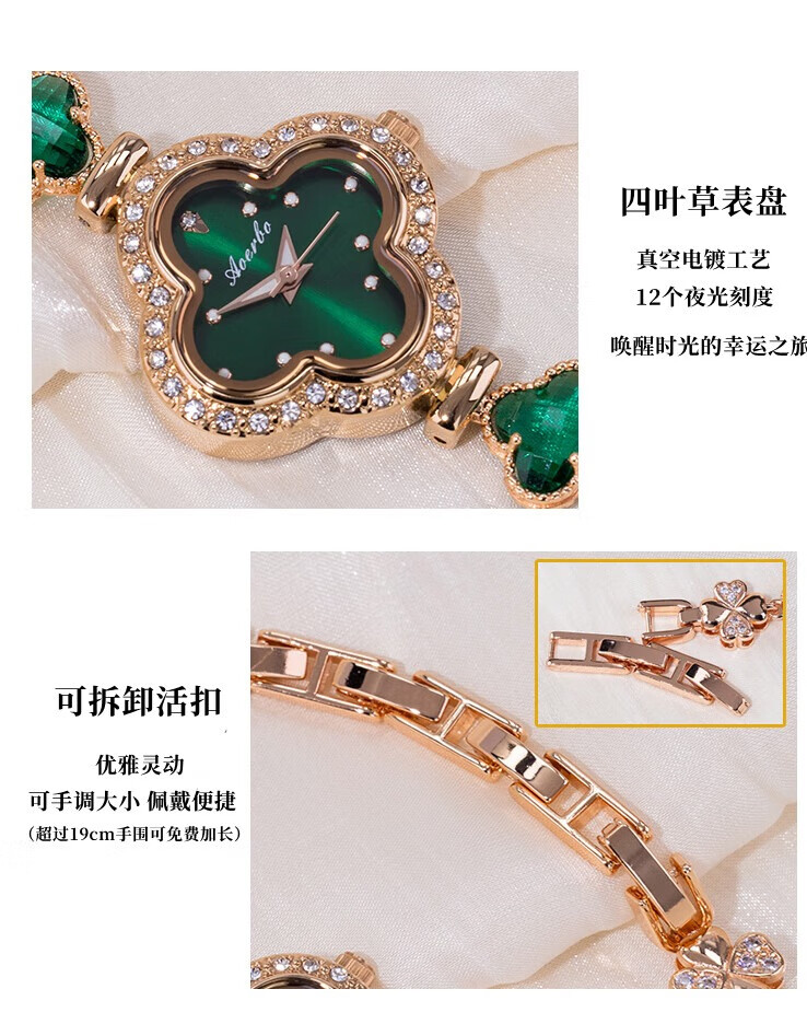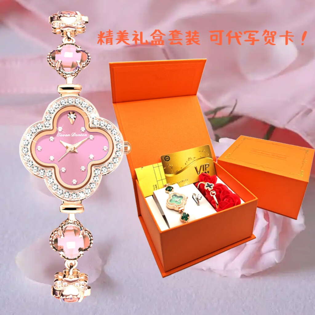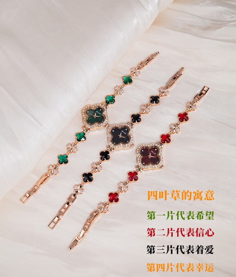 Create Road幸运四叶草女士手链式手表轻奢时尚简约镶钻学生石英送女友礼物 胭脂粉【送礼盒+手镯】