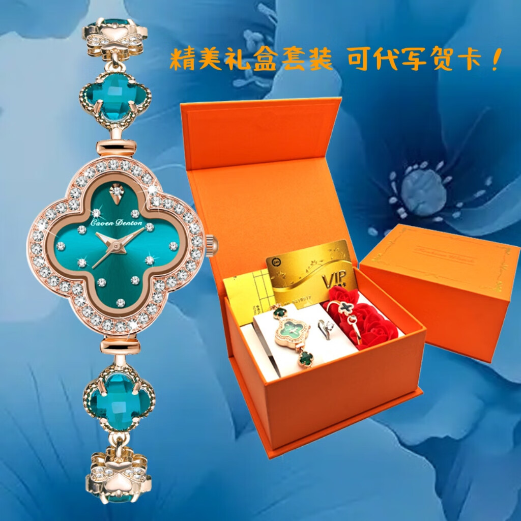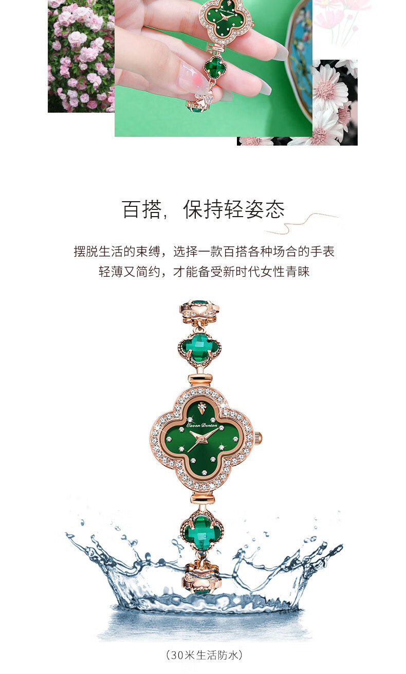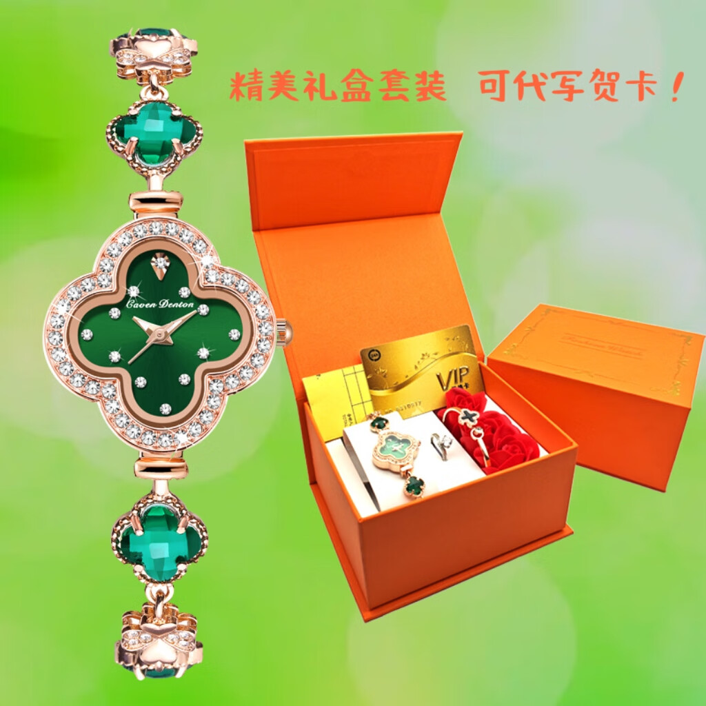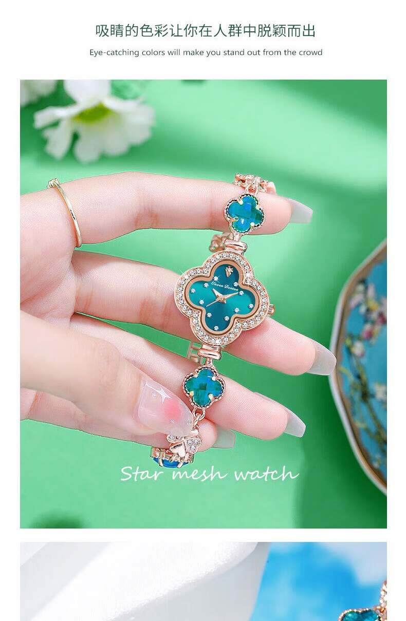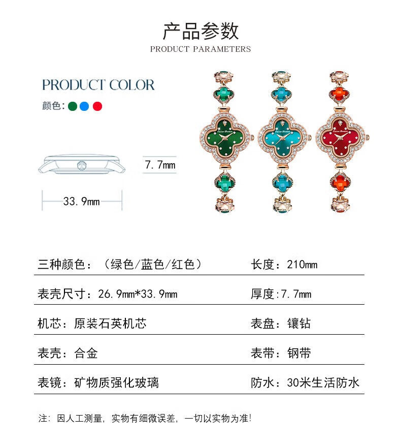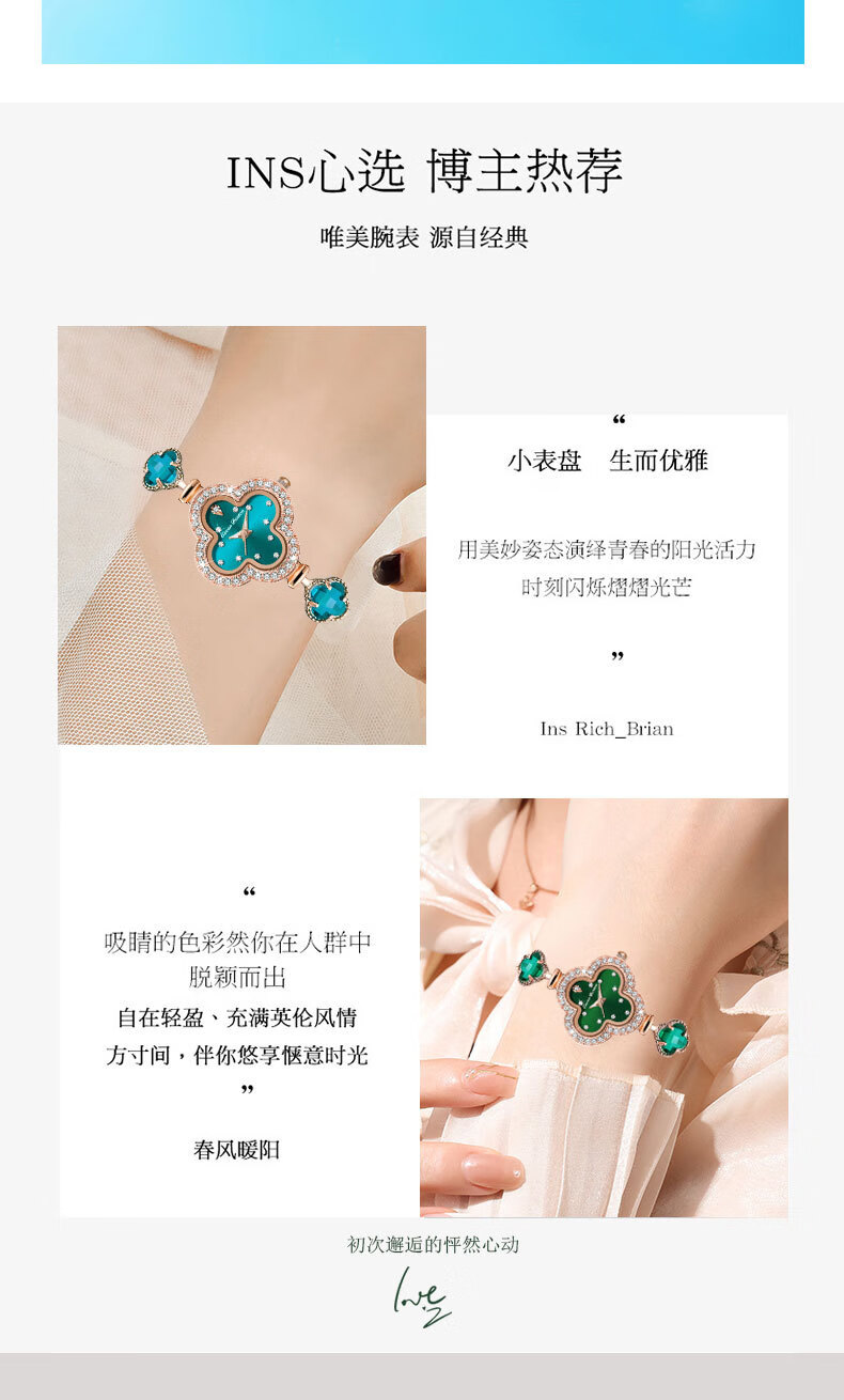 Create Road幸运四叶草女士手链式手表轻奢时尚简约镶钻学生石英送女友礼物 胭脂粉【送礼盒+手镯】