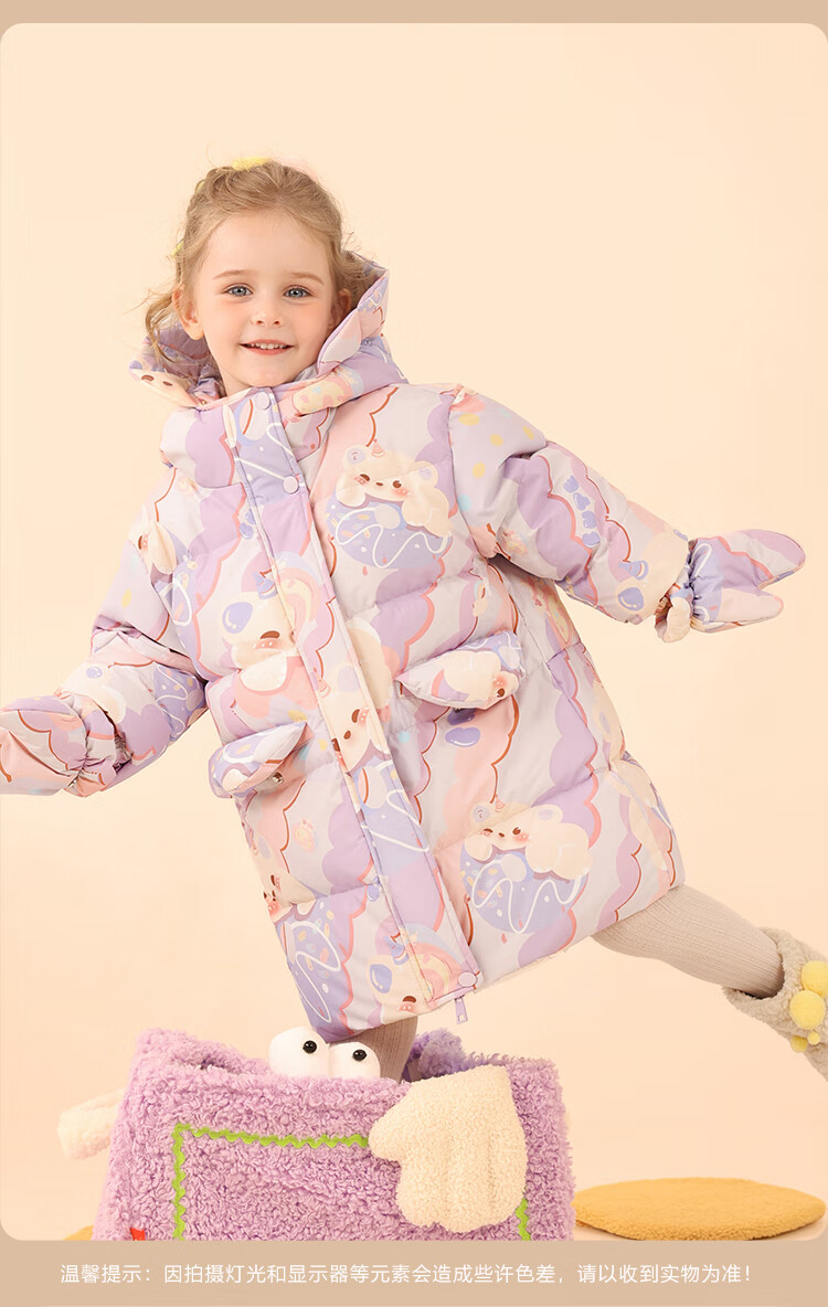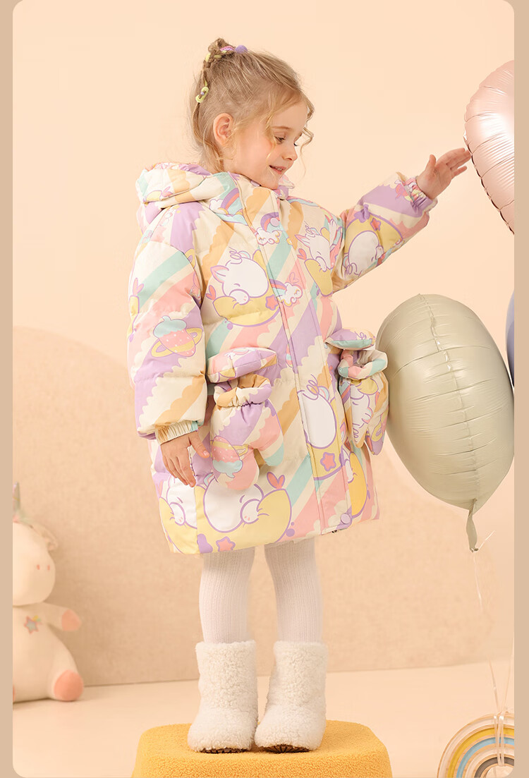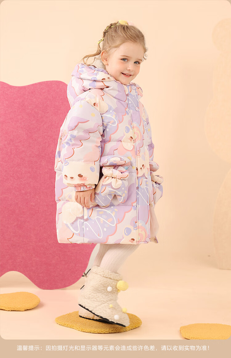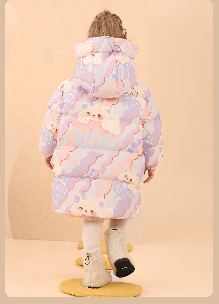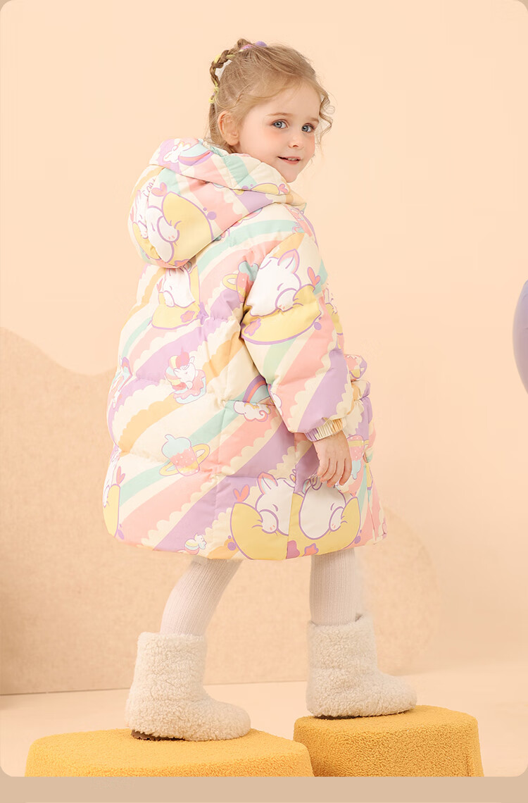 康博儿童羽绒服女童中长款冬季新款女小童宝宝可爱加厚连帽小童装外套 紫色条纹 130
