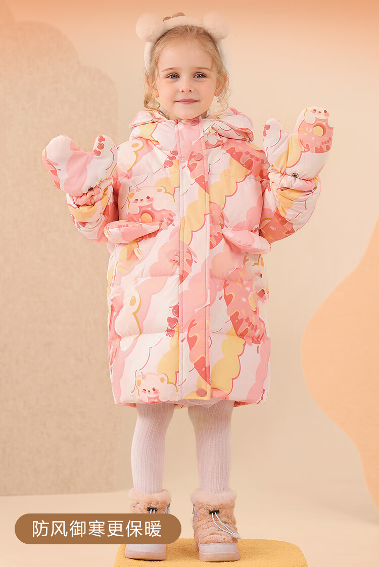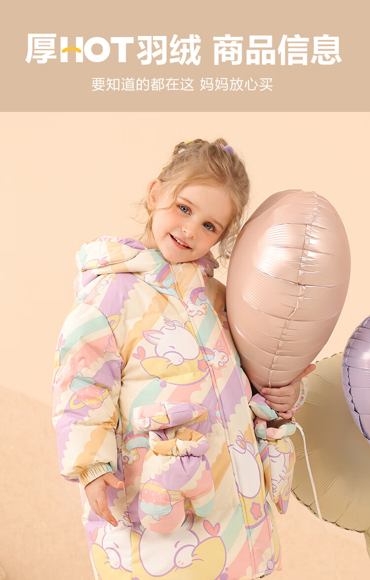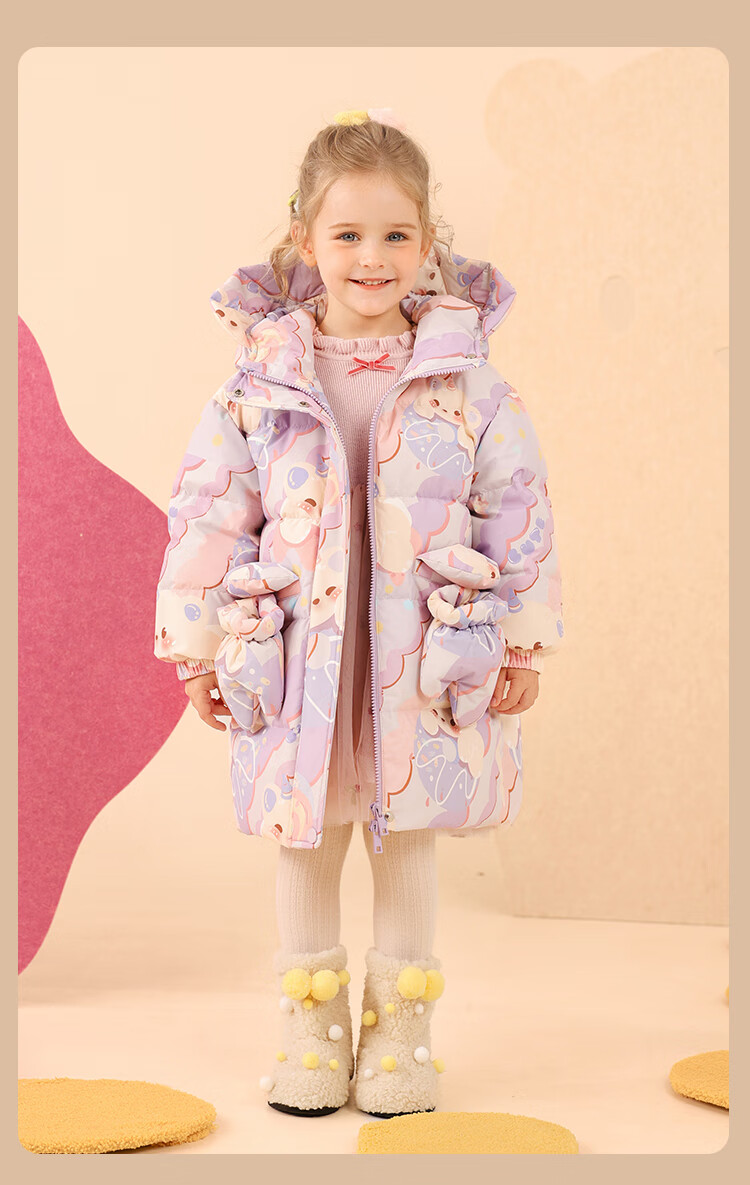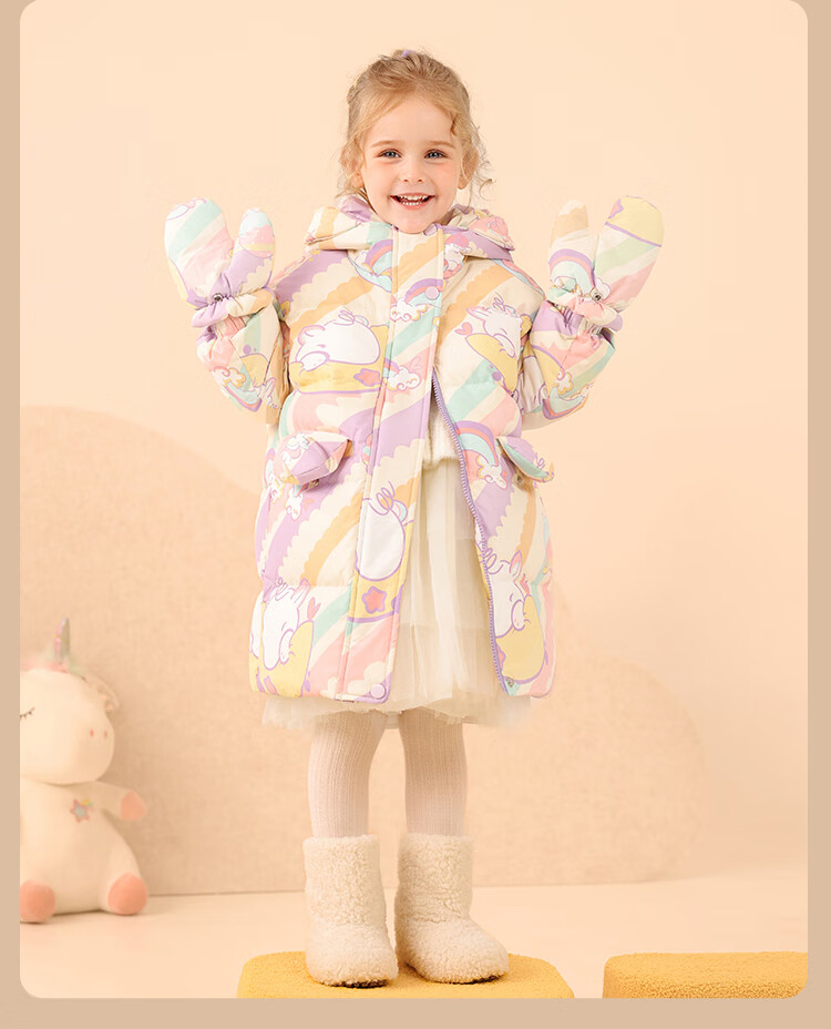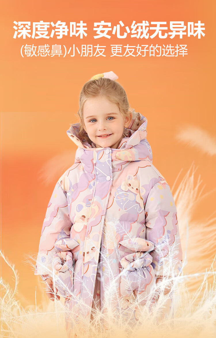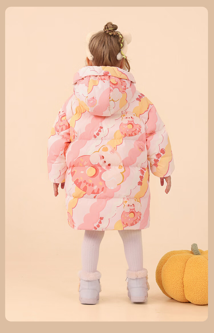 康博儿童羽绒服女童中长款冬季新款女小童宝宝可爱加厚连帽小童装外套 紫色条纹 130