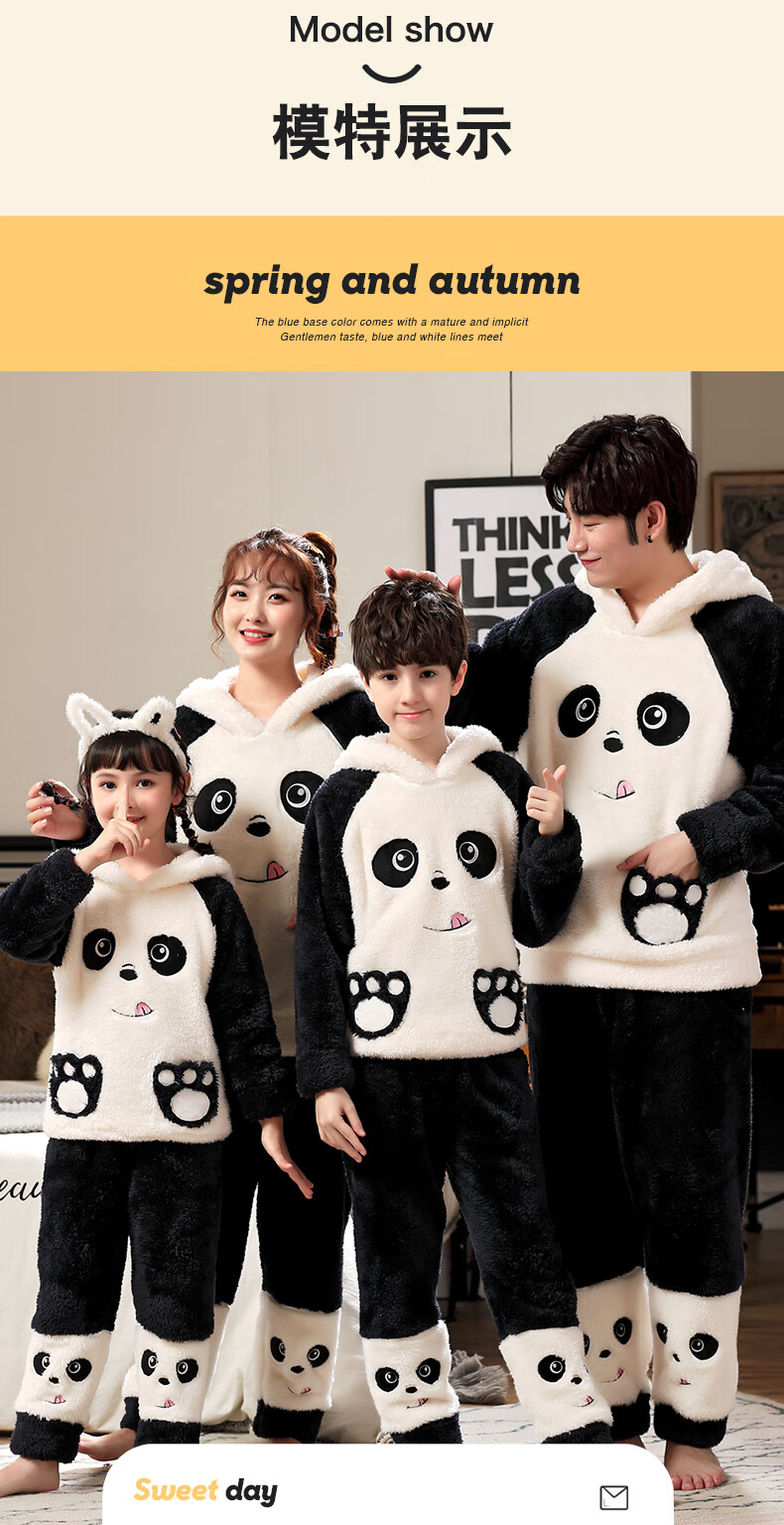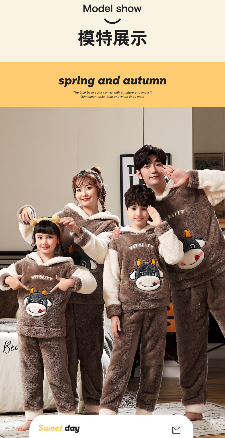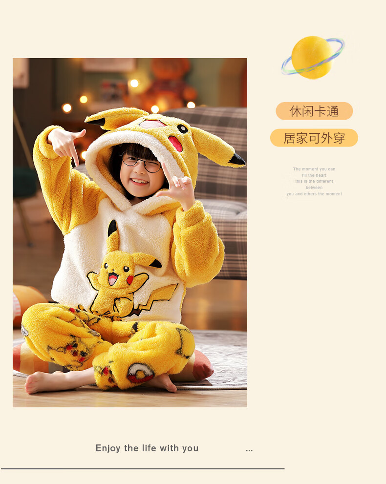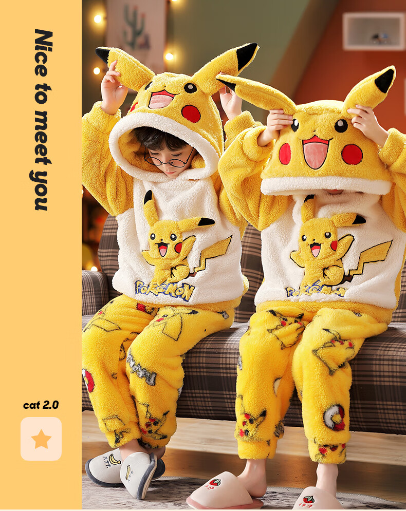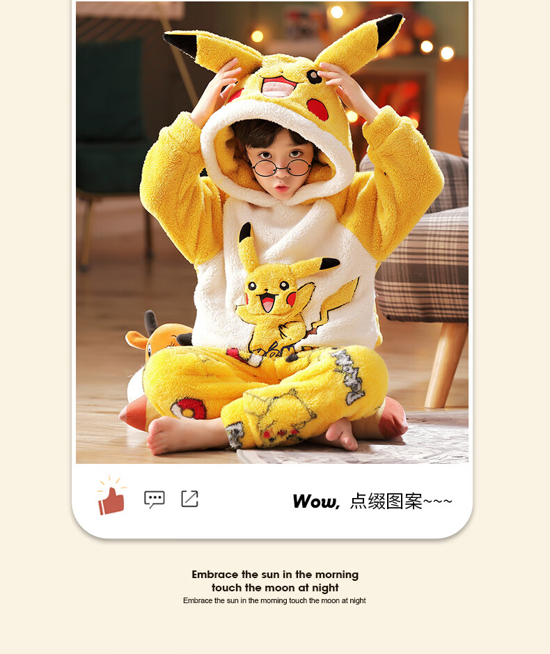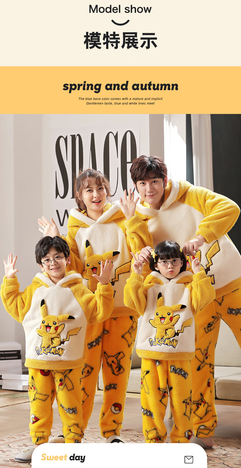 萧淑妃冬季卡通法兰绒儿童睡衣加厚保暖珊瑚绒一家四口亲子家居服套装 皮卡丘 女童12码 100-120CM/48斤左右