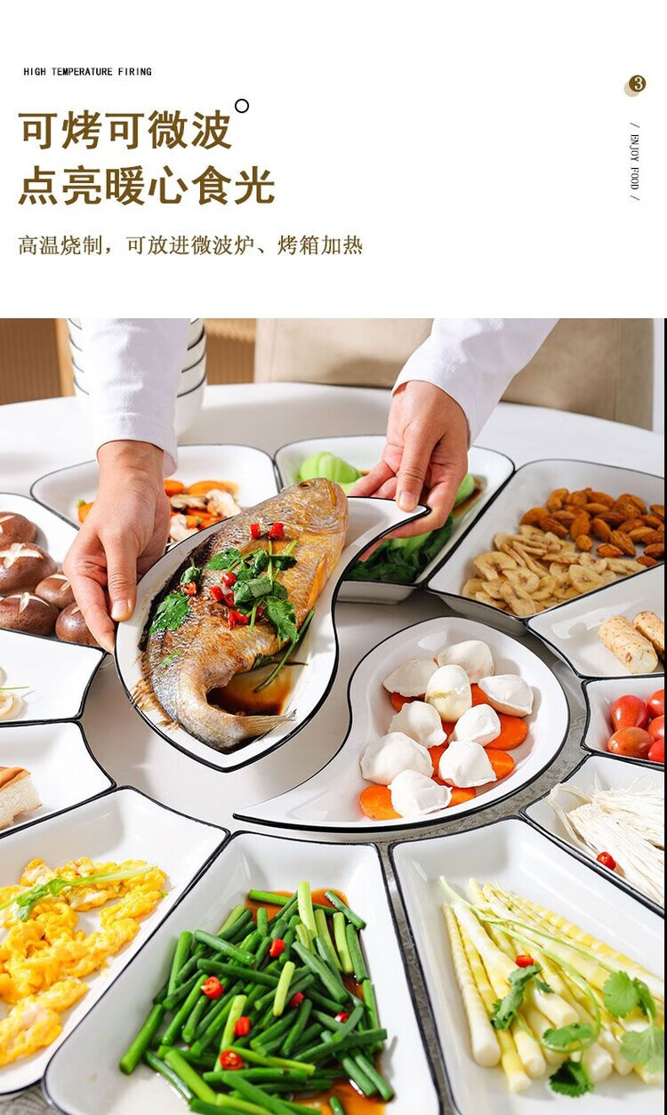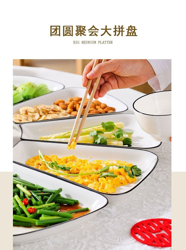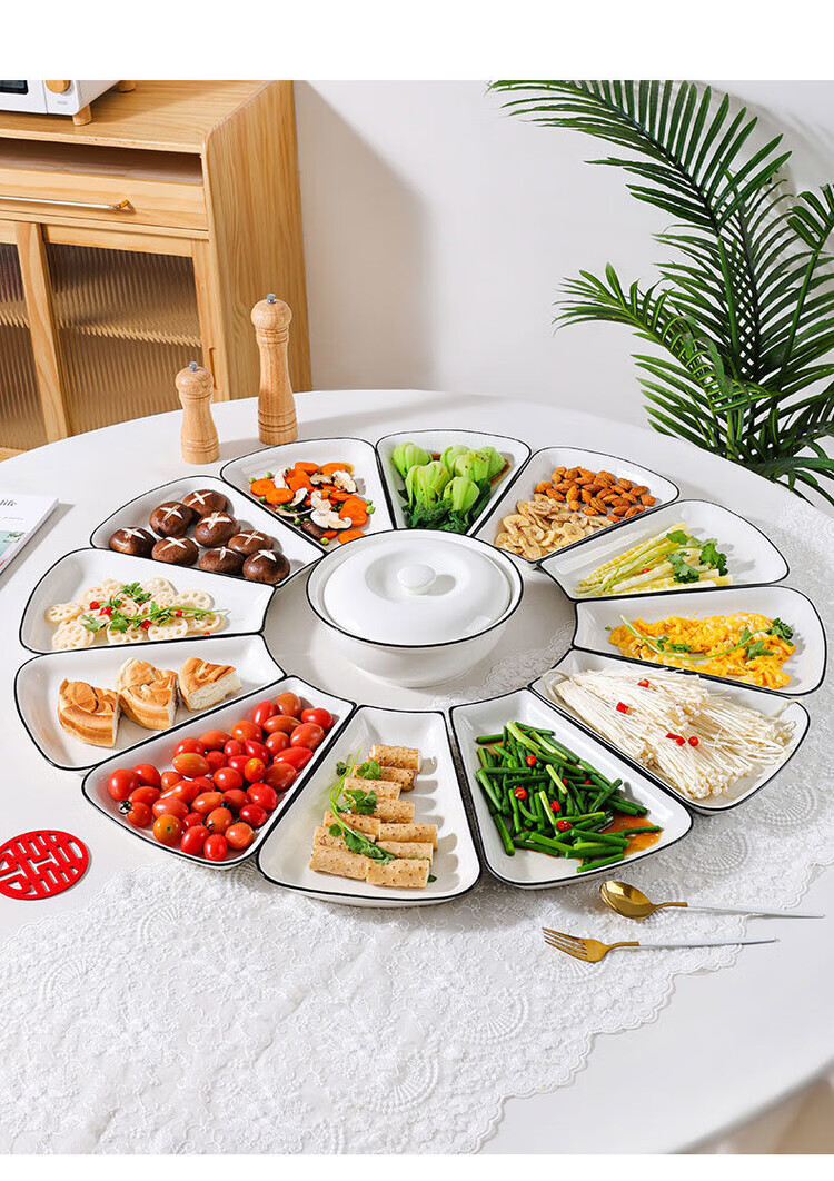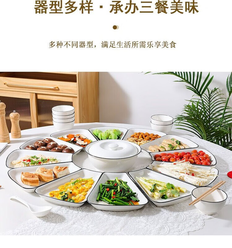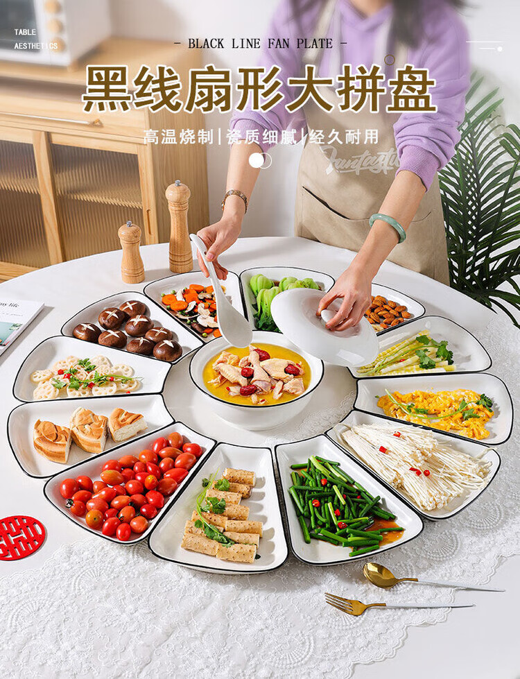 咏夏团圆拼盘餐具陶瓷组合家用过年套装创意聚餐扇形网红盘子菜盘碗碟 90扇形盘12盘+品锅+12小碗