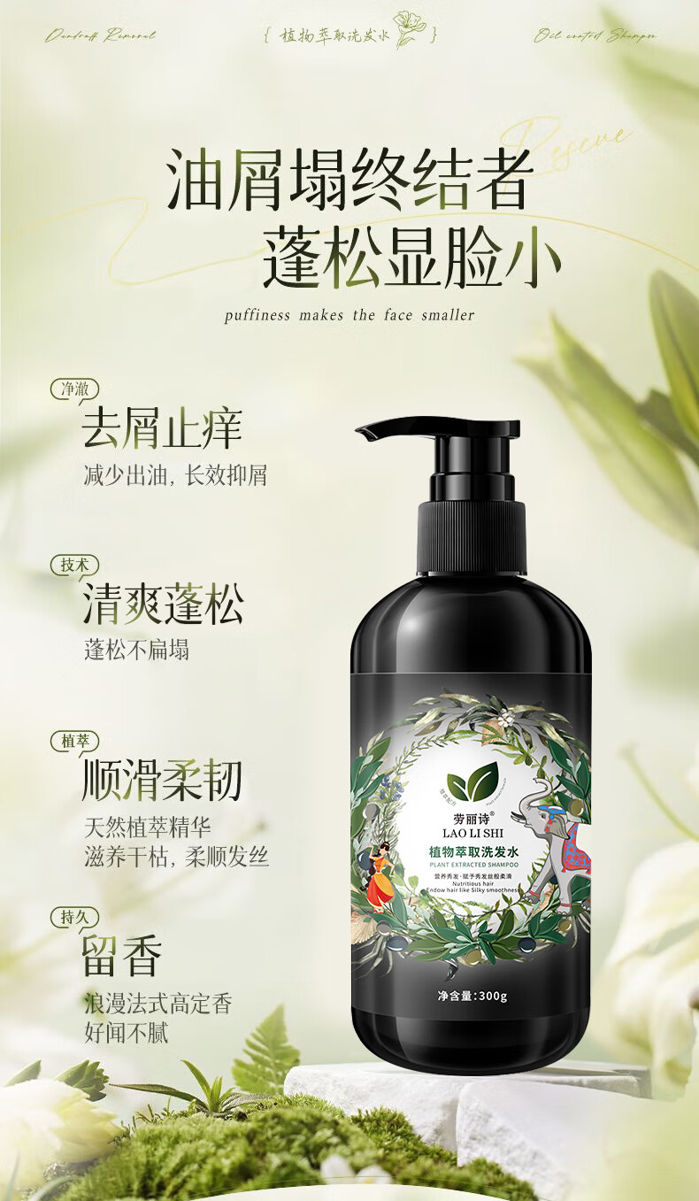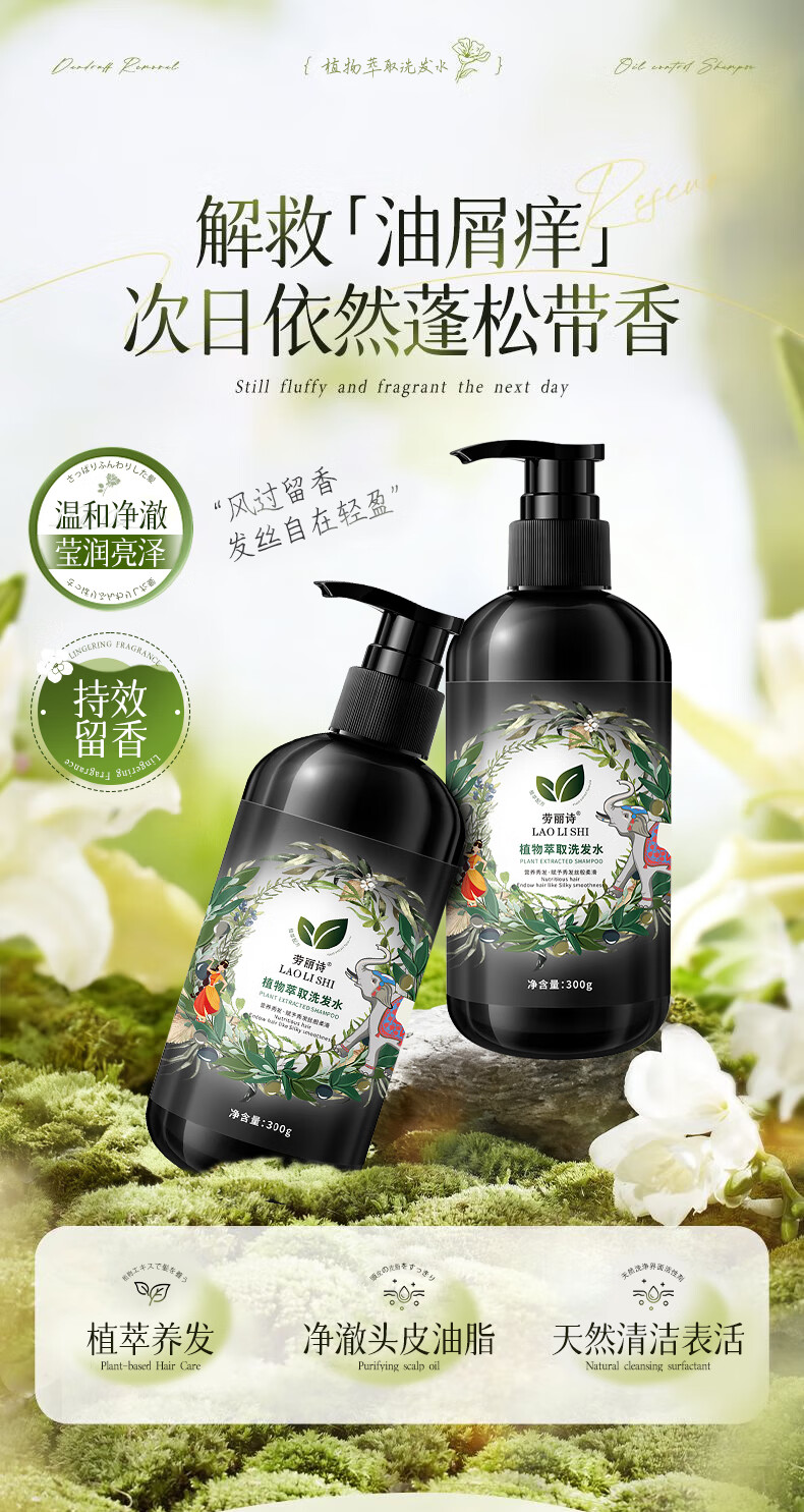 劳丽诗植物萃取洗发水清爽顺滑滋润柔顺蓬松去屑男女通用乌黑亮泽洗发露 植萃洗发水300ML-2瓶