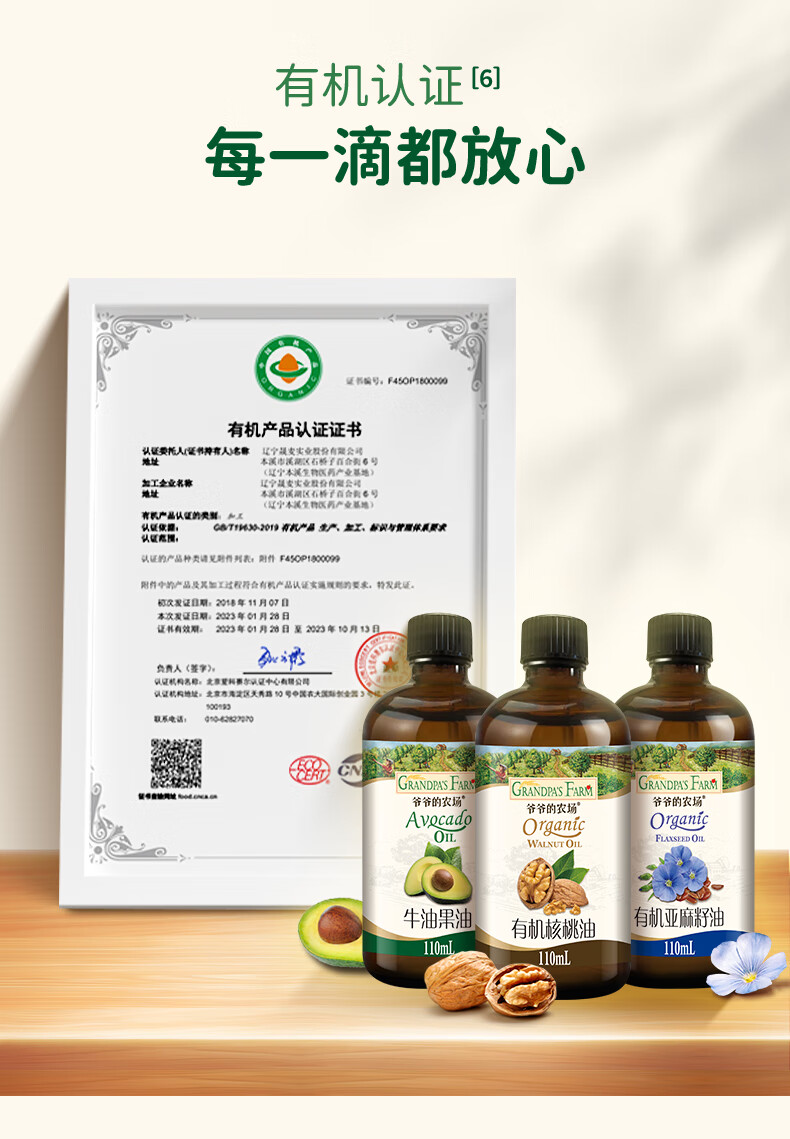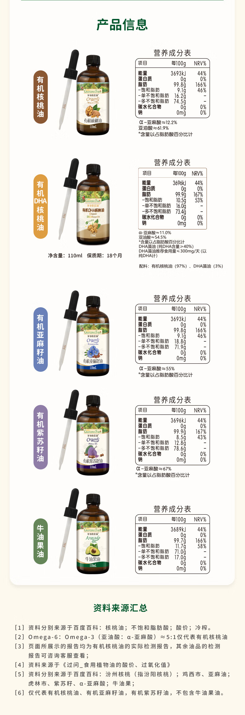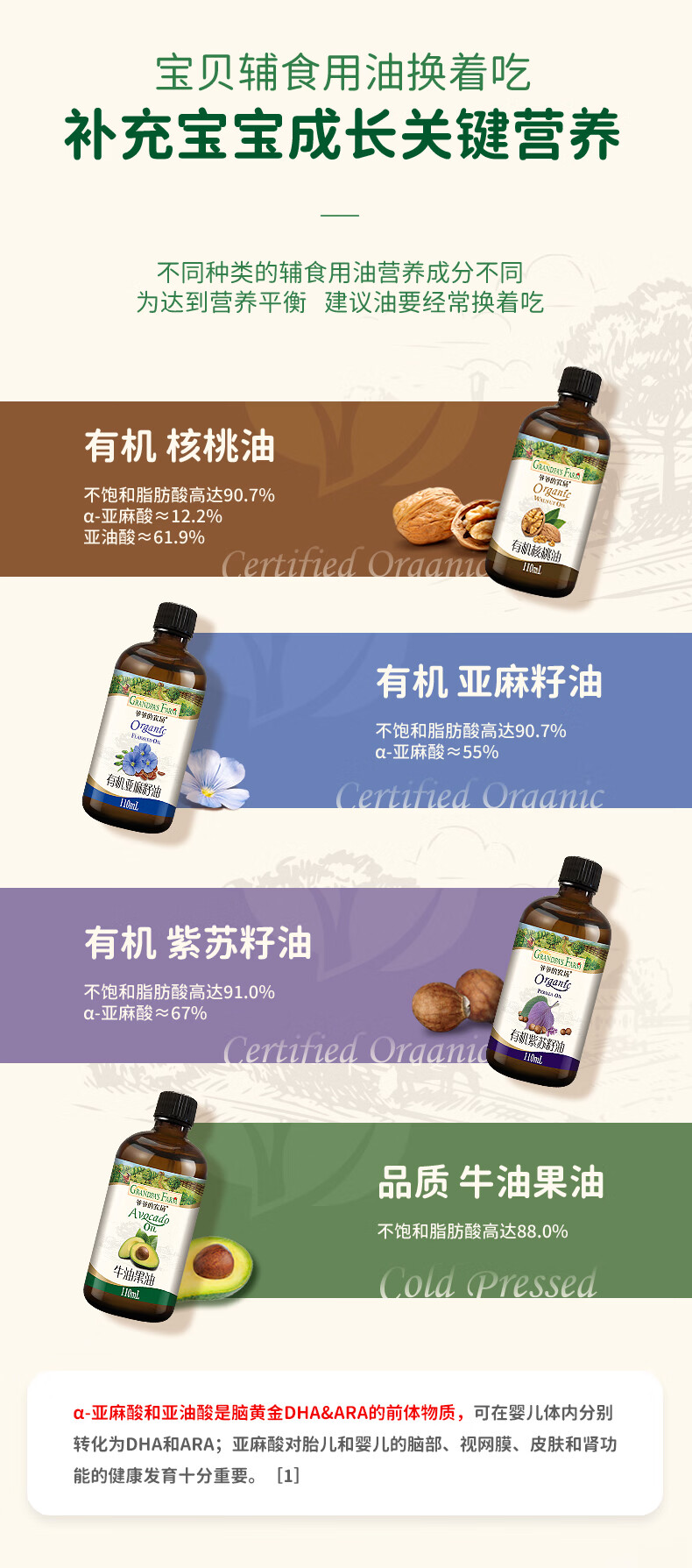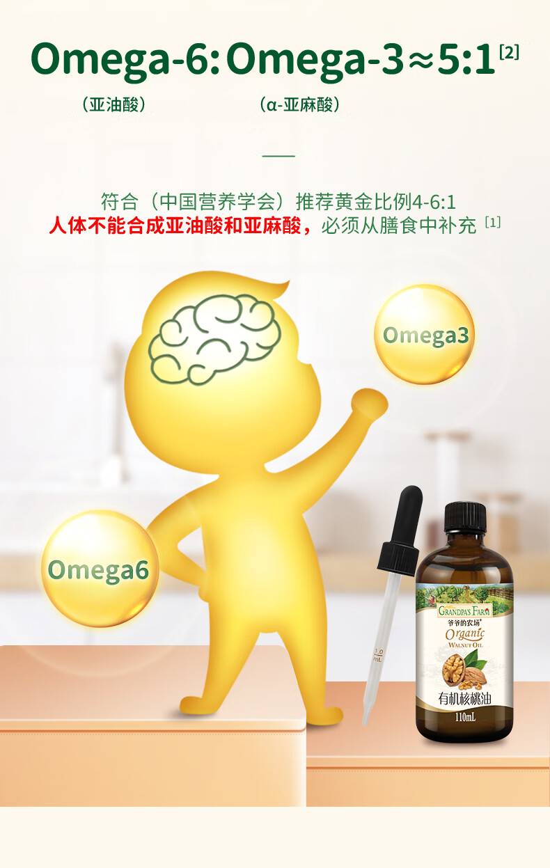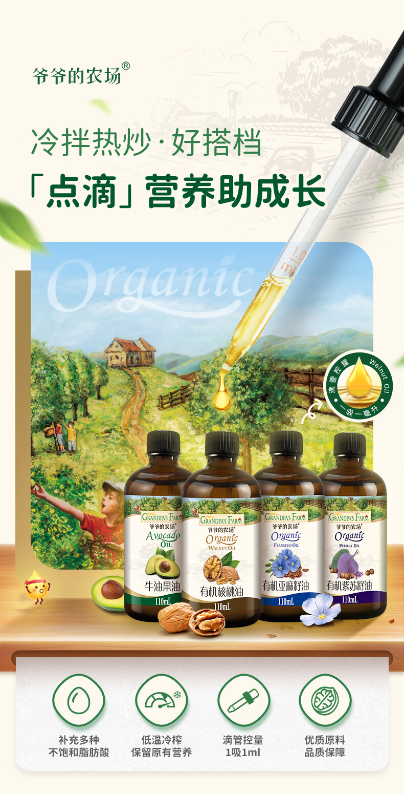 爷爷的农场核桃亚麻籽牛油果油宝宝辅食油热炒油 滴管小瓶营养食用油 DHA有机核桃油110ml