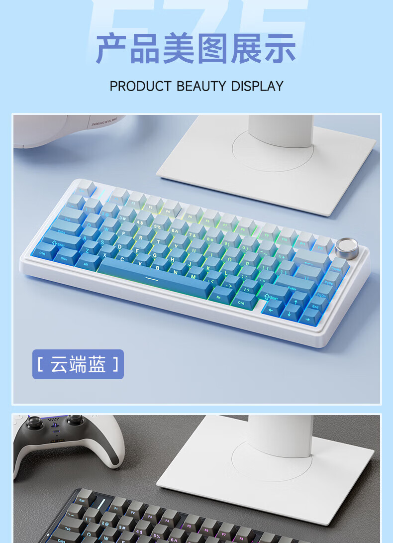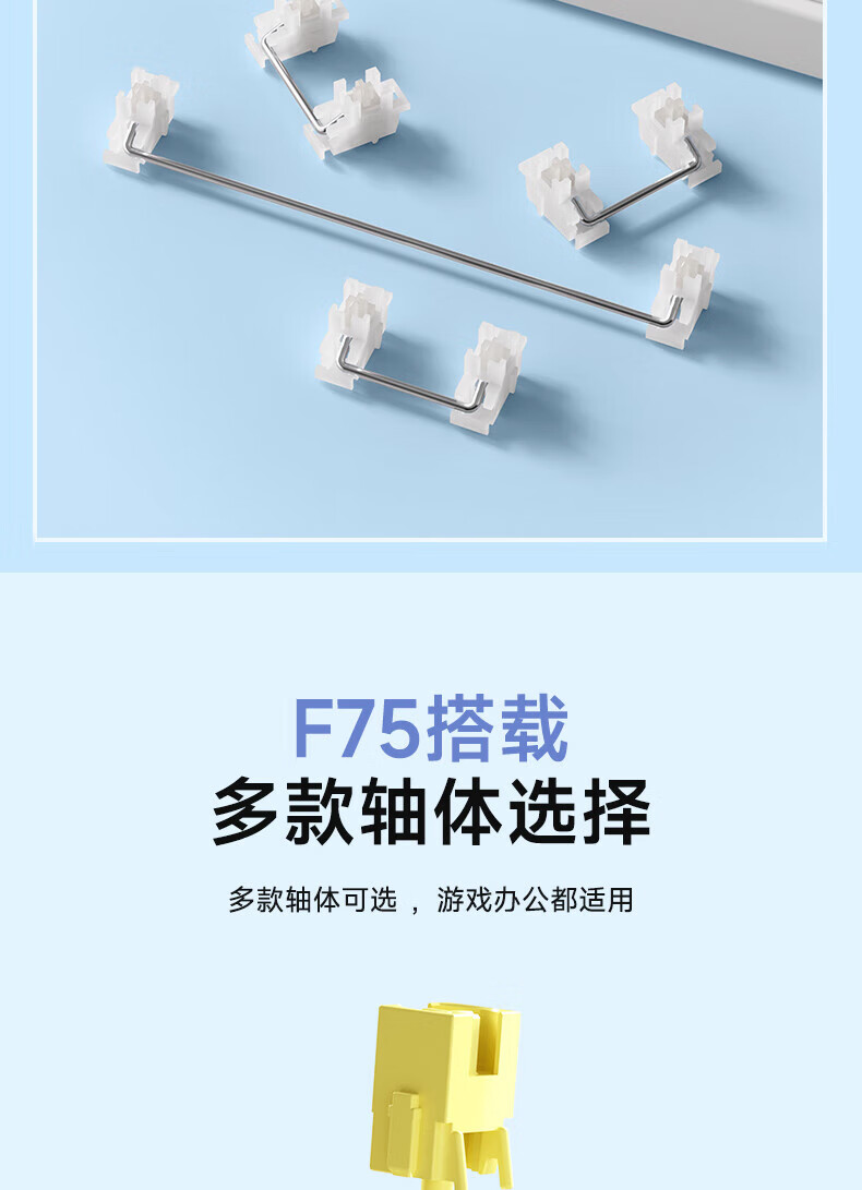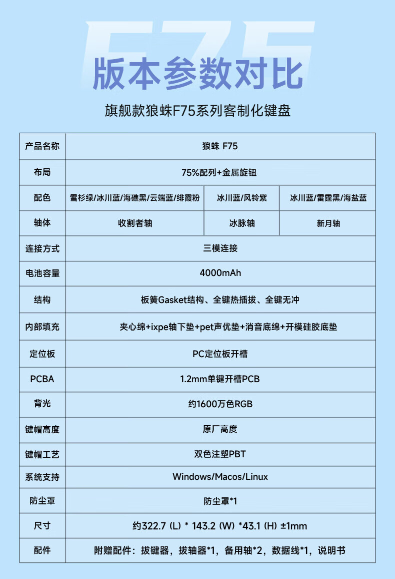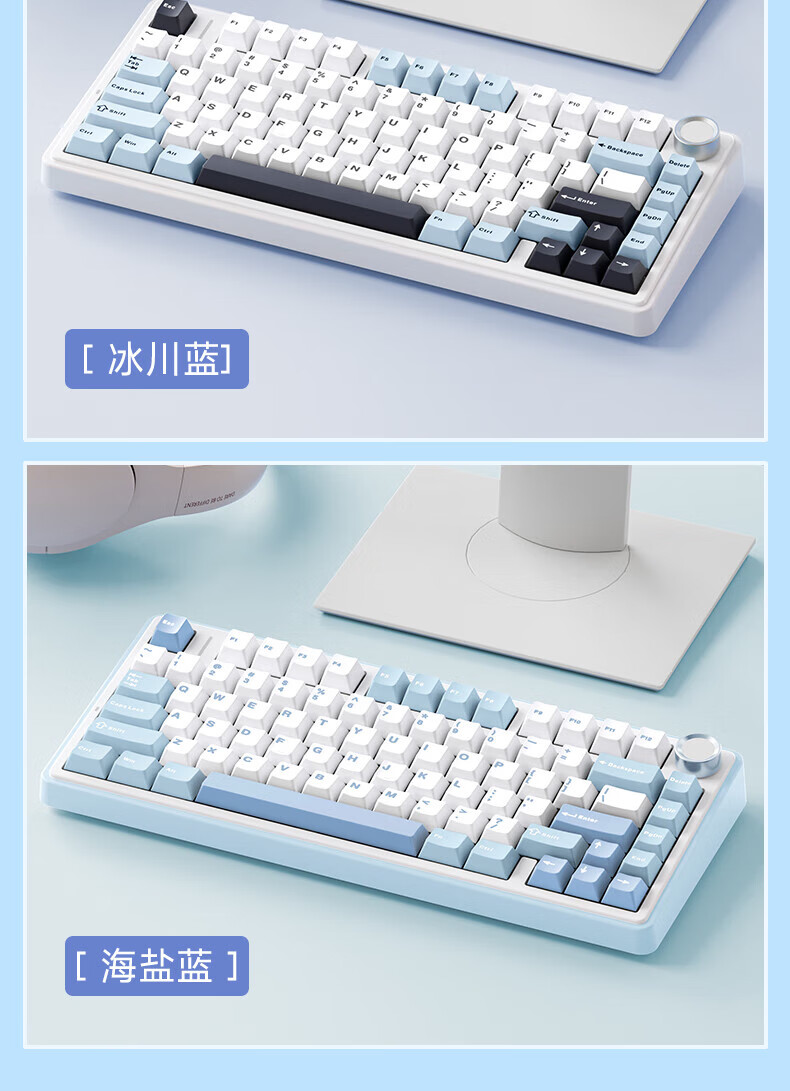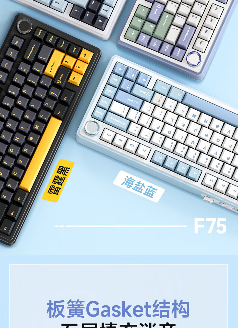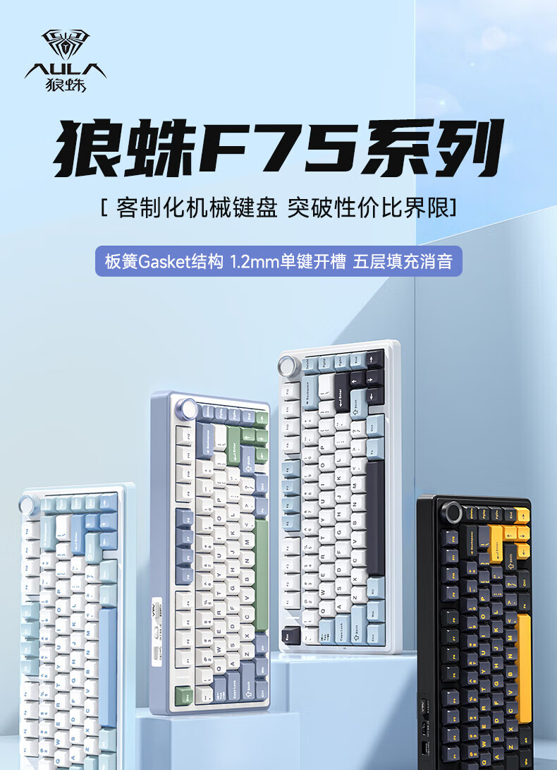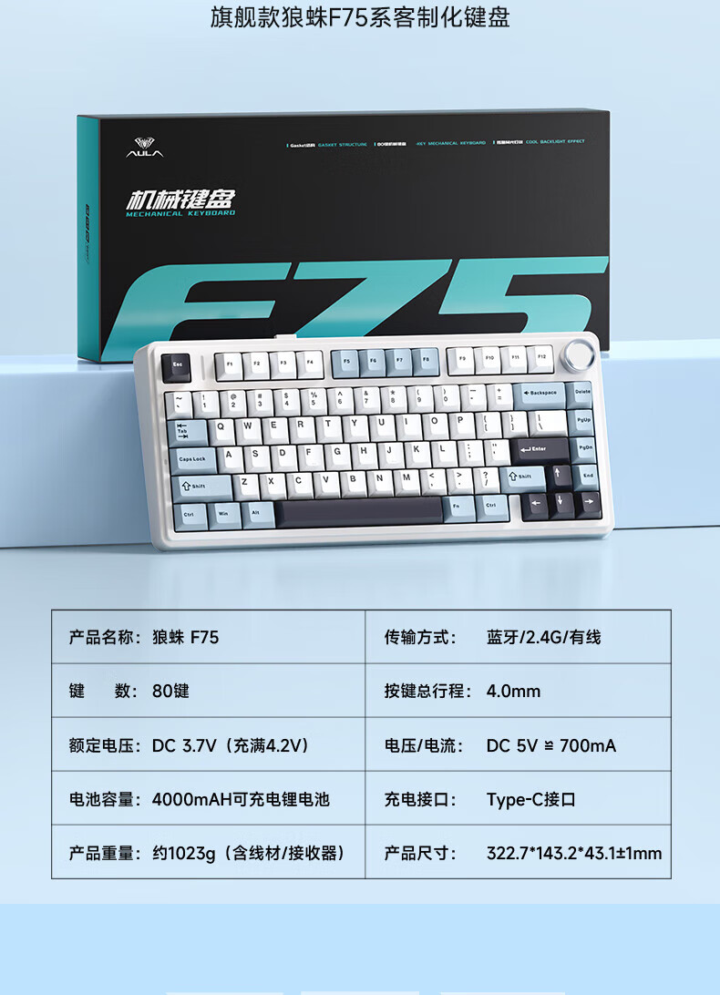 狼蛛(AULA)F75无线客制化机械键盘 无线蓝牙三模有线gasket全键热插拔75配列电竞游戏办公 海盐蓝 新月轴