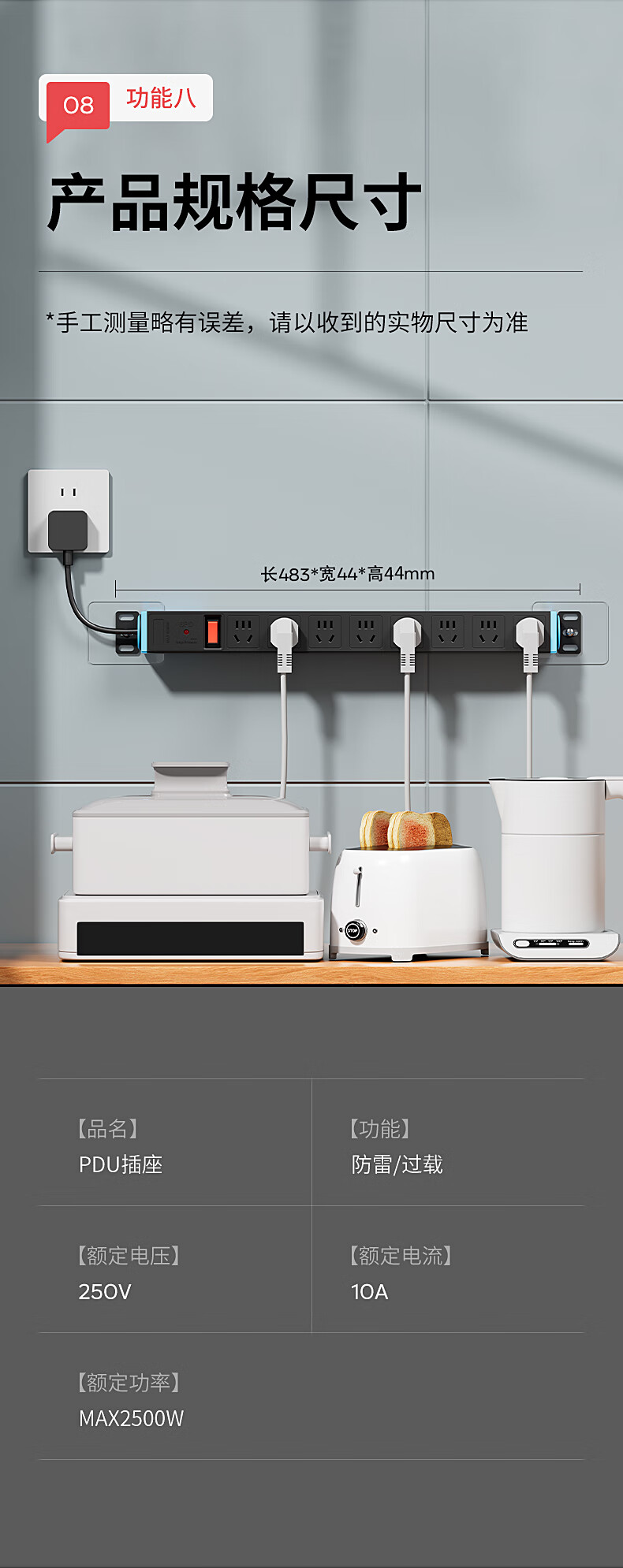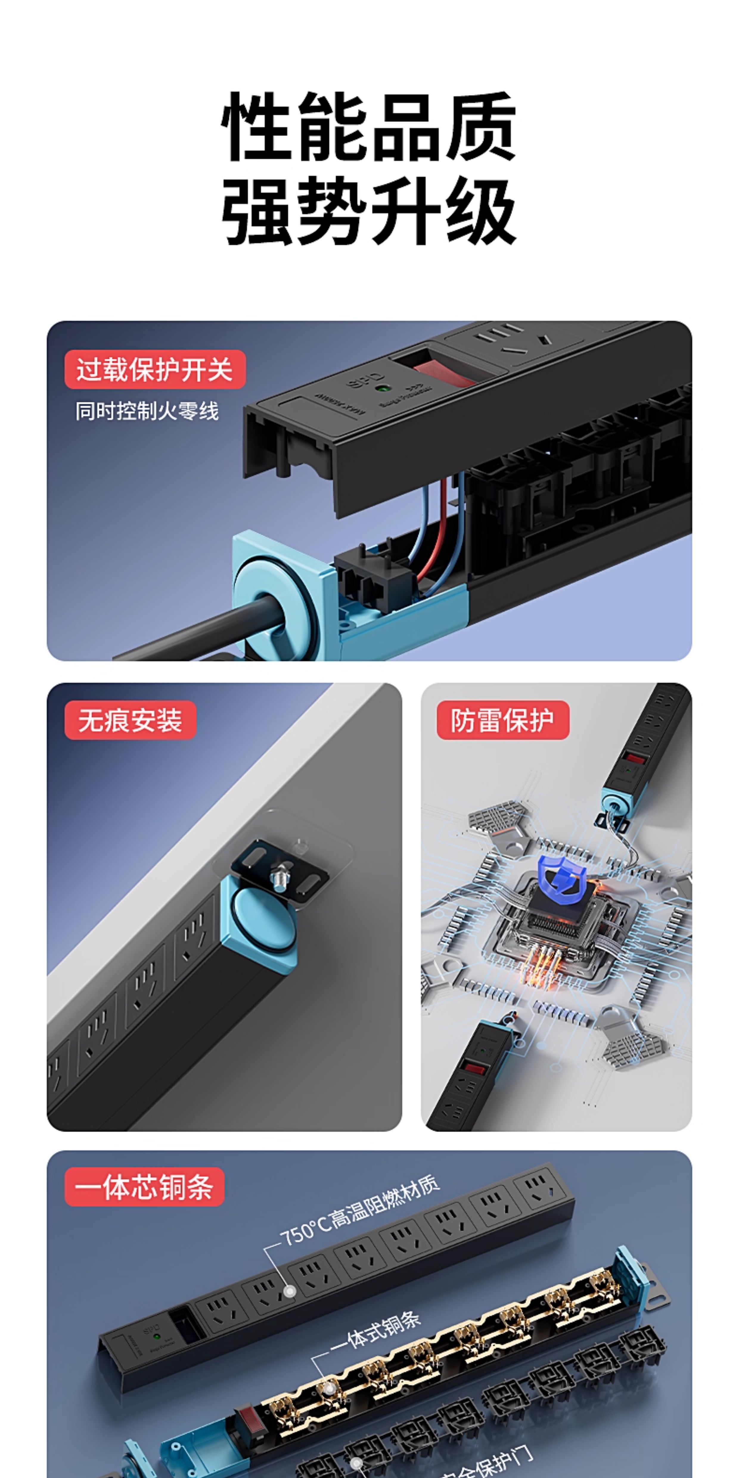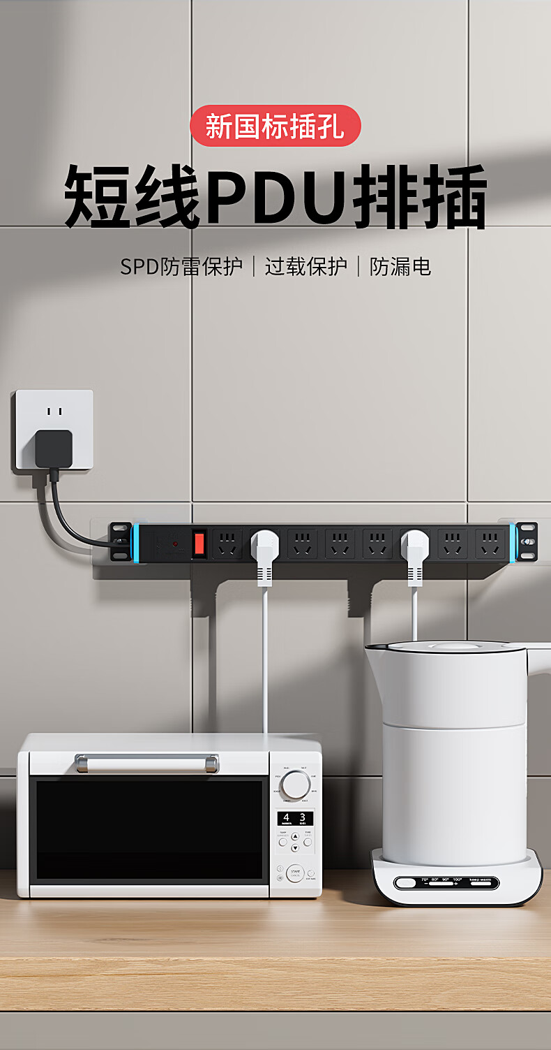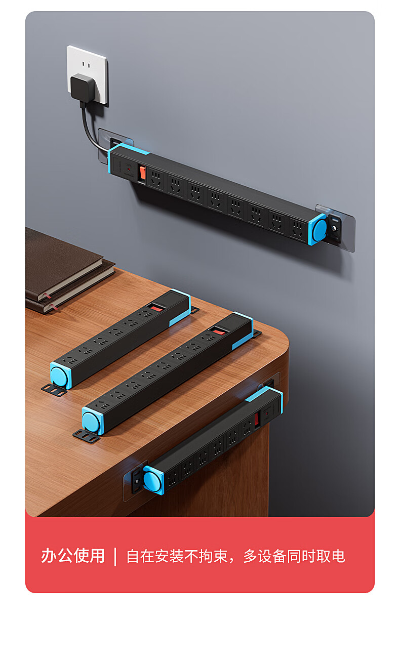 国际电工多孔扩展插座转换器短线PDU排插厨房墙壁拓展超薄固定插线板防过载防雷电竞插排 【黑色】八位无线(过载保护)