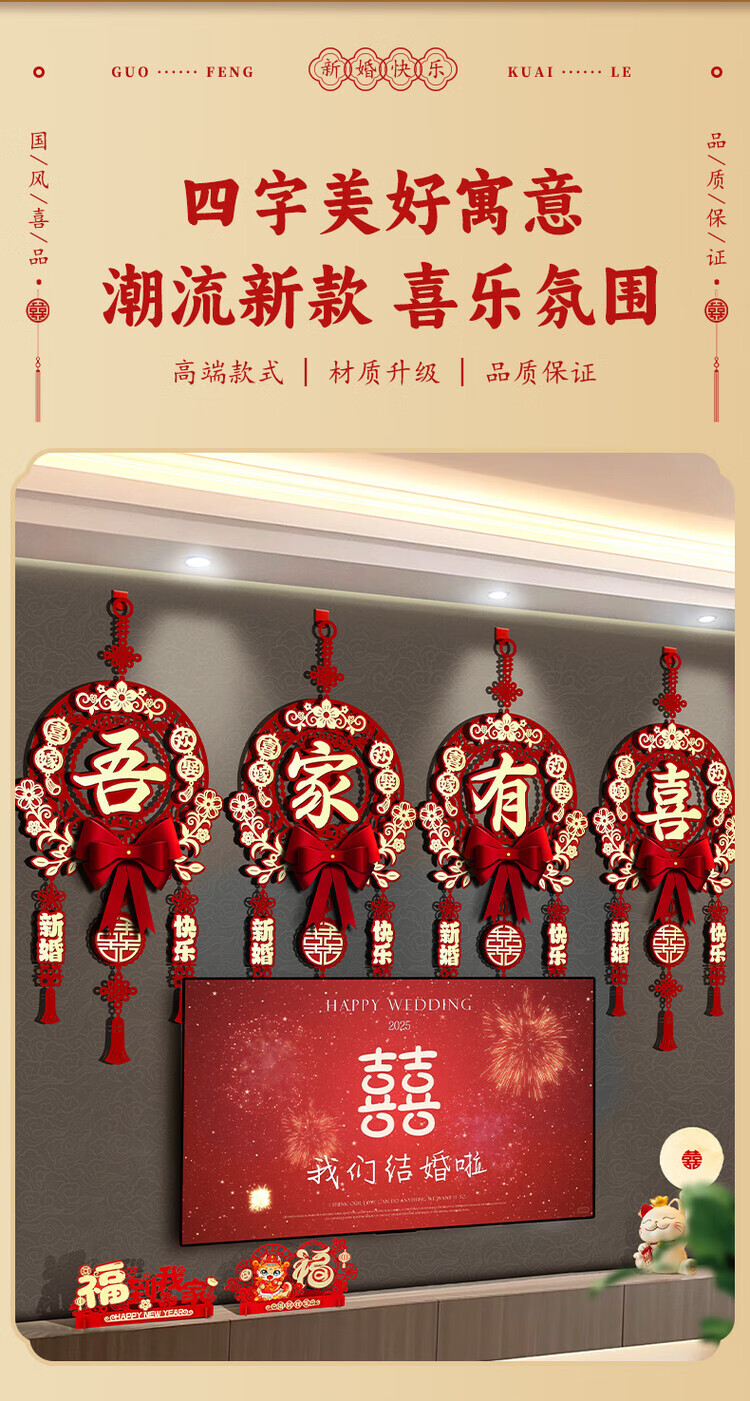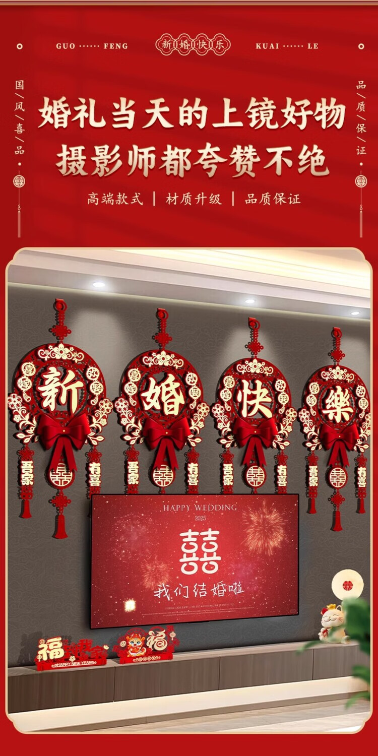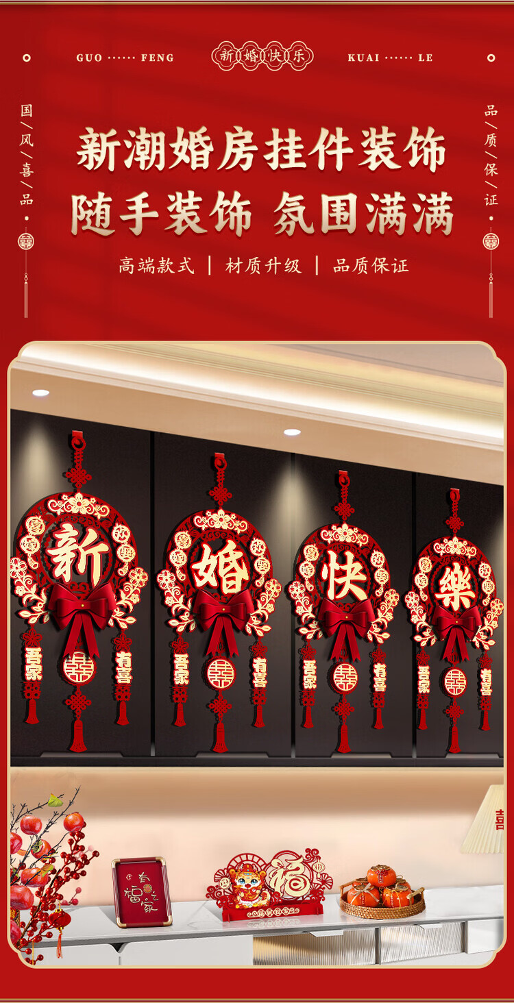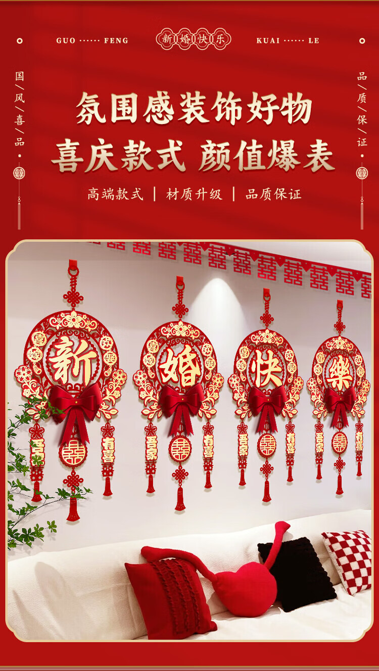 OYKTN结婚布置喜字挂件男女方新房卧室客厅挂饰电视背景墙婚房装饰套装 【新婚快乐】结婚挂件1套