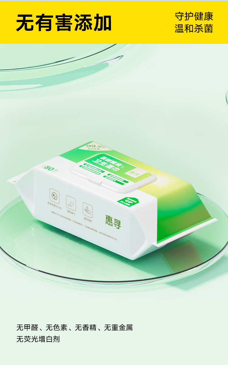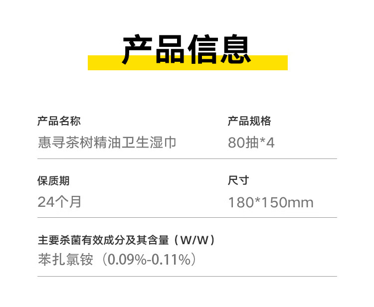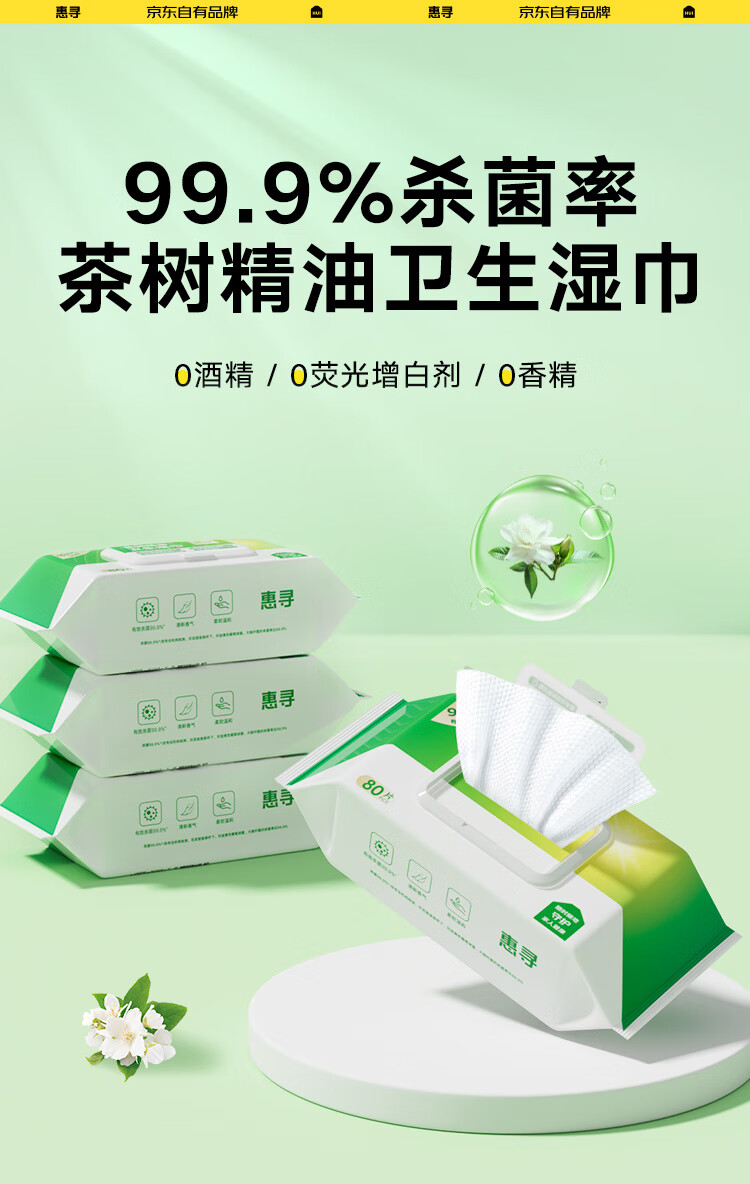 惠寻茶树精油杀菌湿巾80抽*4包 杀菌率99.9% 卫生湿纸巾全新升级
