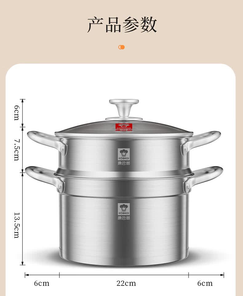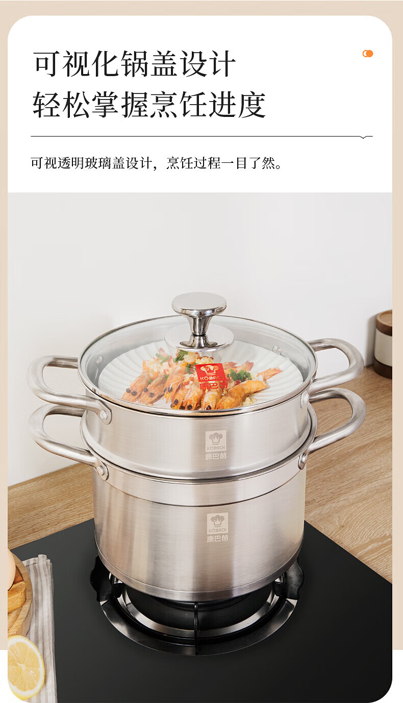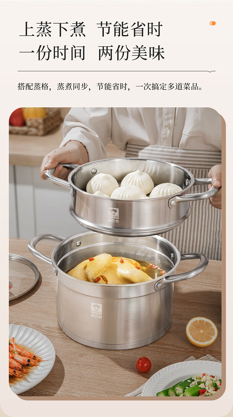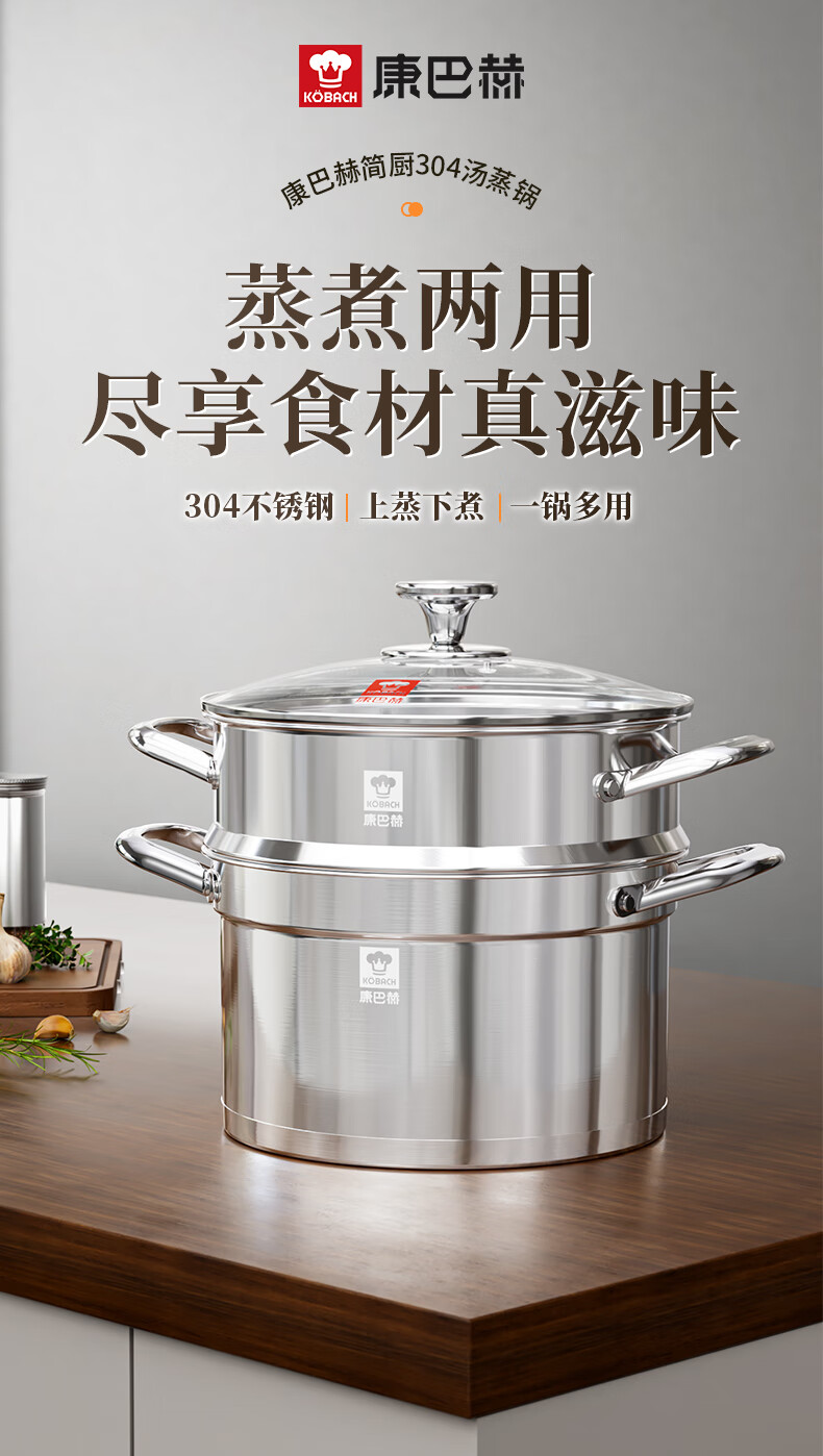康巴赫蒸锅304不锈钢大容量汤锅多功能蒸煮锅具22cm复底燃气电磁炉通用