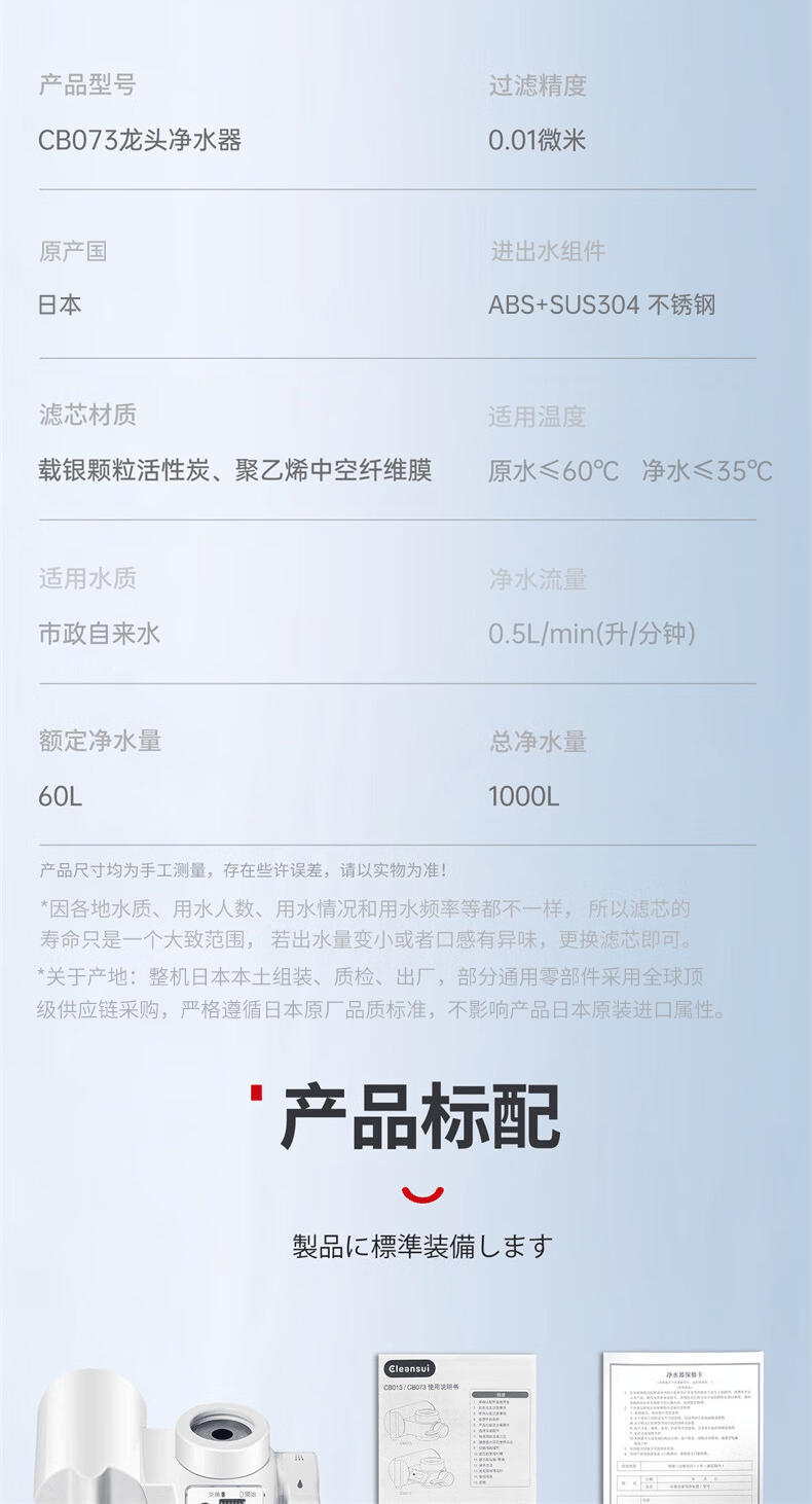 可菱水 【日本制】水龙头净水器直饮 家用自来水过滤器滤水器智能换芯提醒前置过滤器CB073 日本原装进口 【日本制】五芯装-液晶屏显