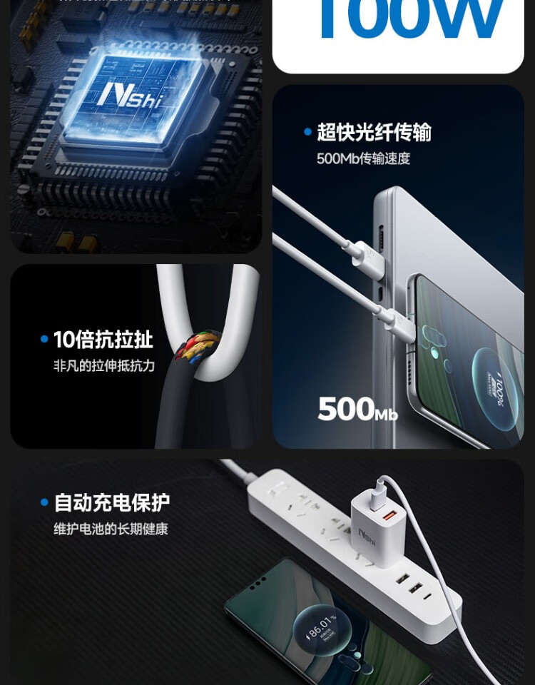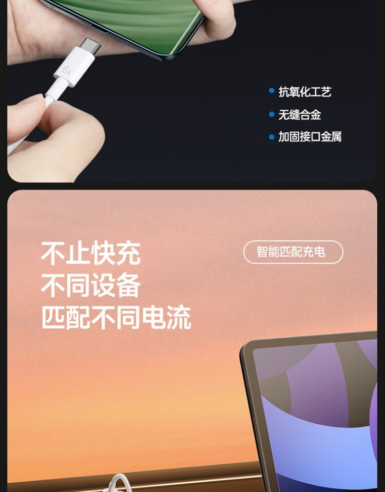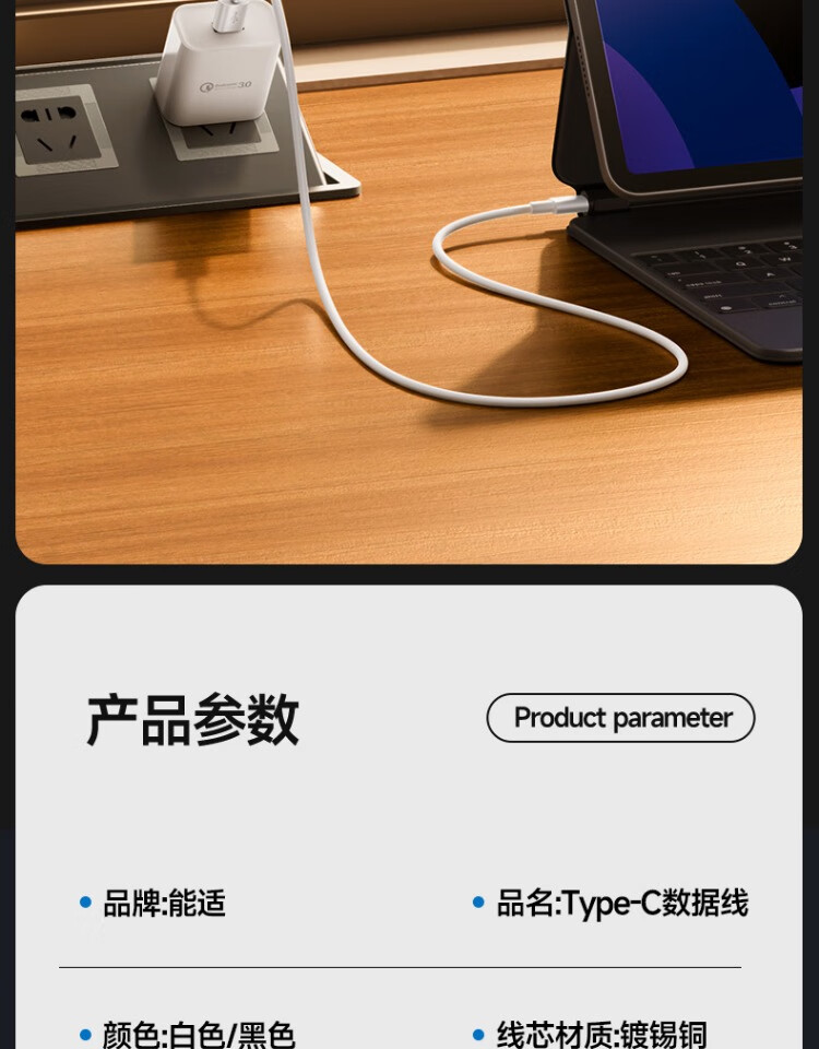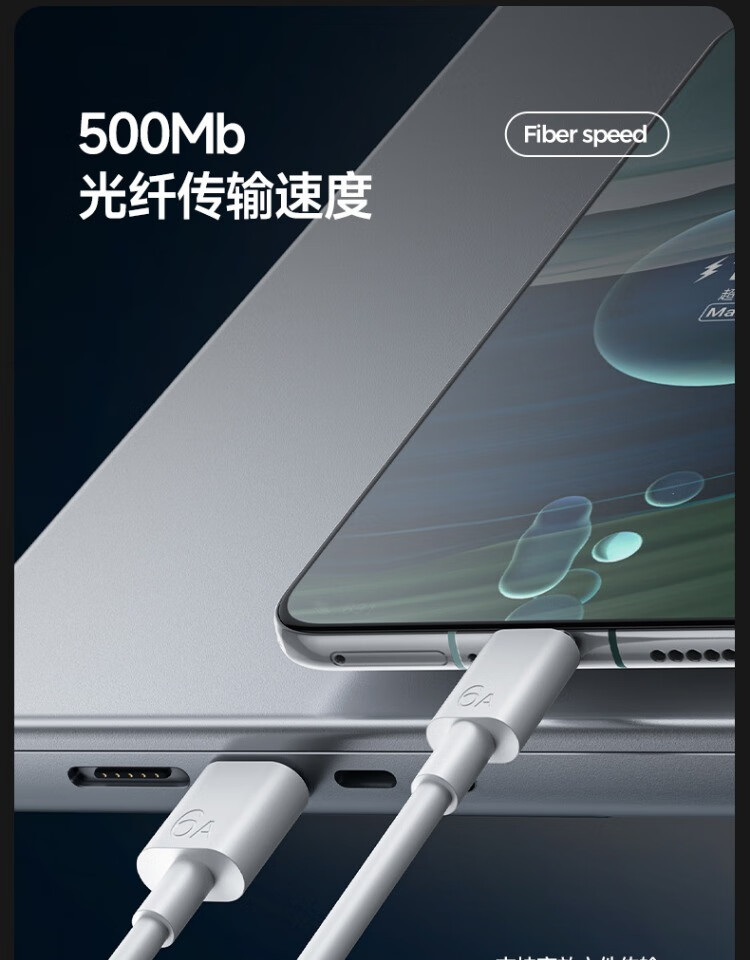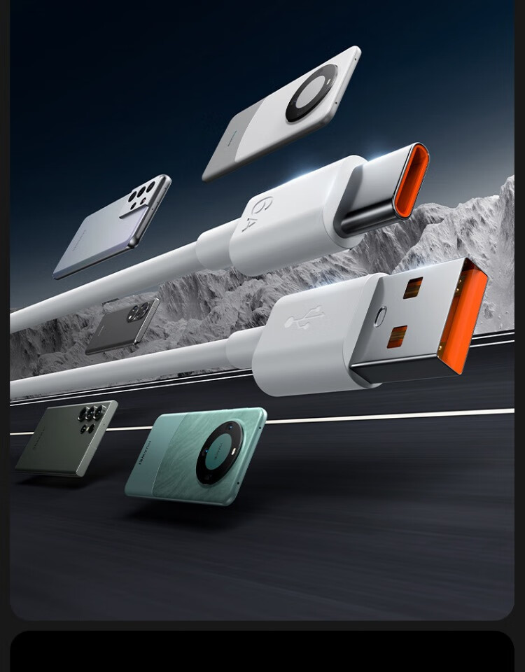 能适Type-C数据线6A充电线100W超级快充适用华为荣耀OPPO小米66W安卓手机USB-C快充线1.5米白