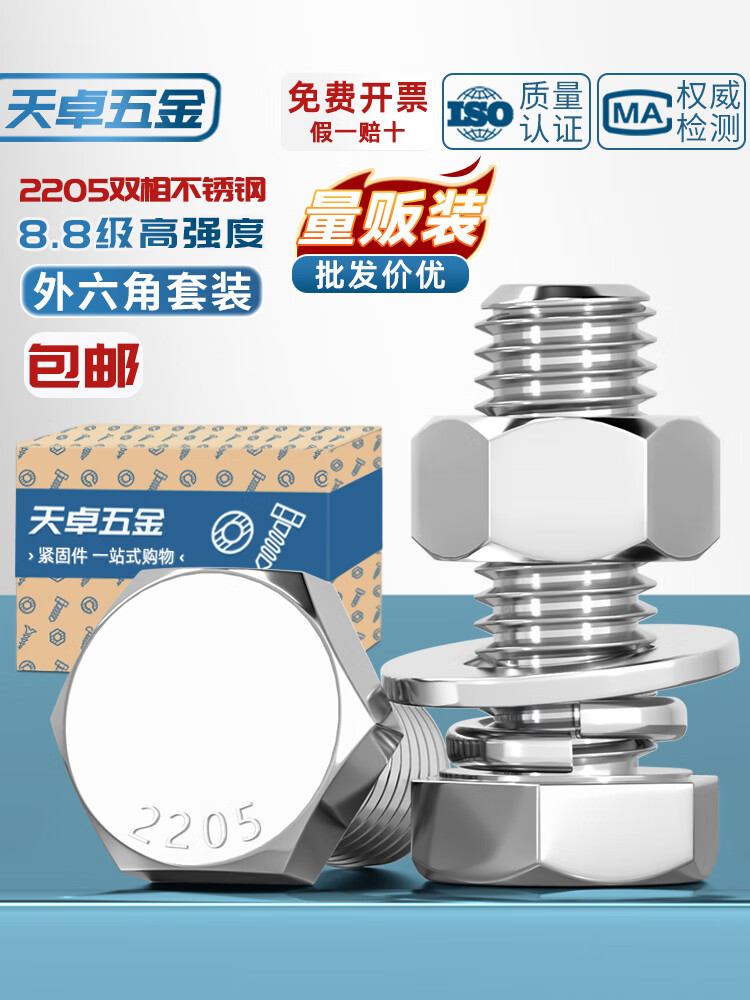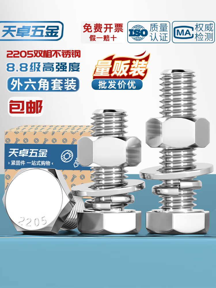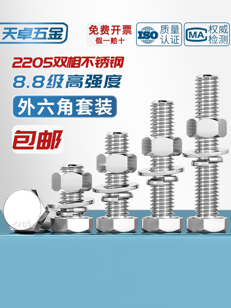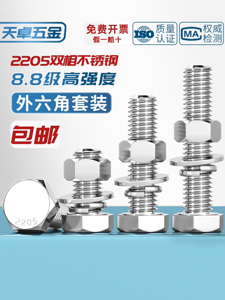 天卓五金2205双相不锈钢8.8级高强度外六角螺栓螺丝螺母套装螺杆MM6M8-M24 M6*12-15套