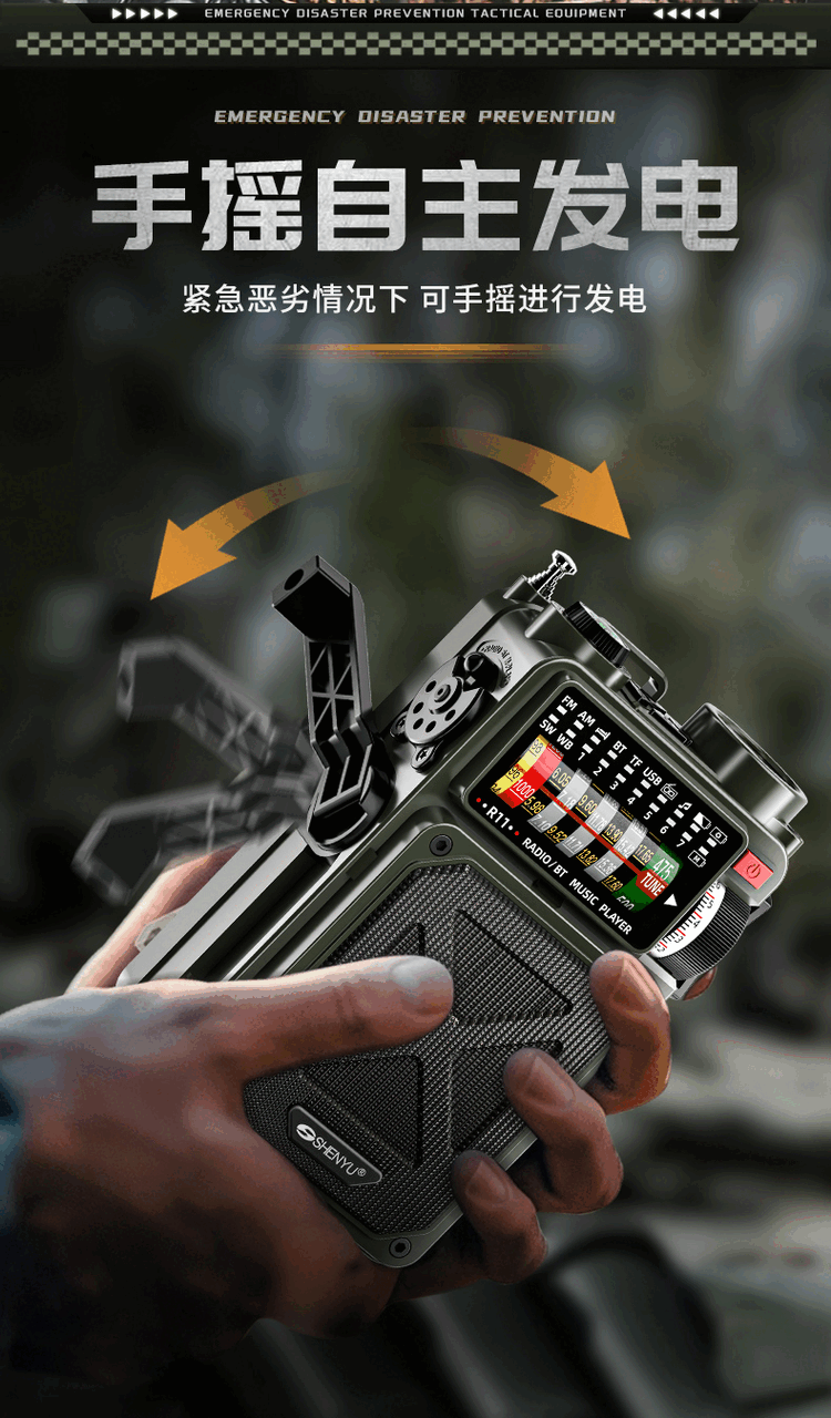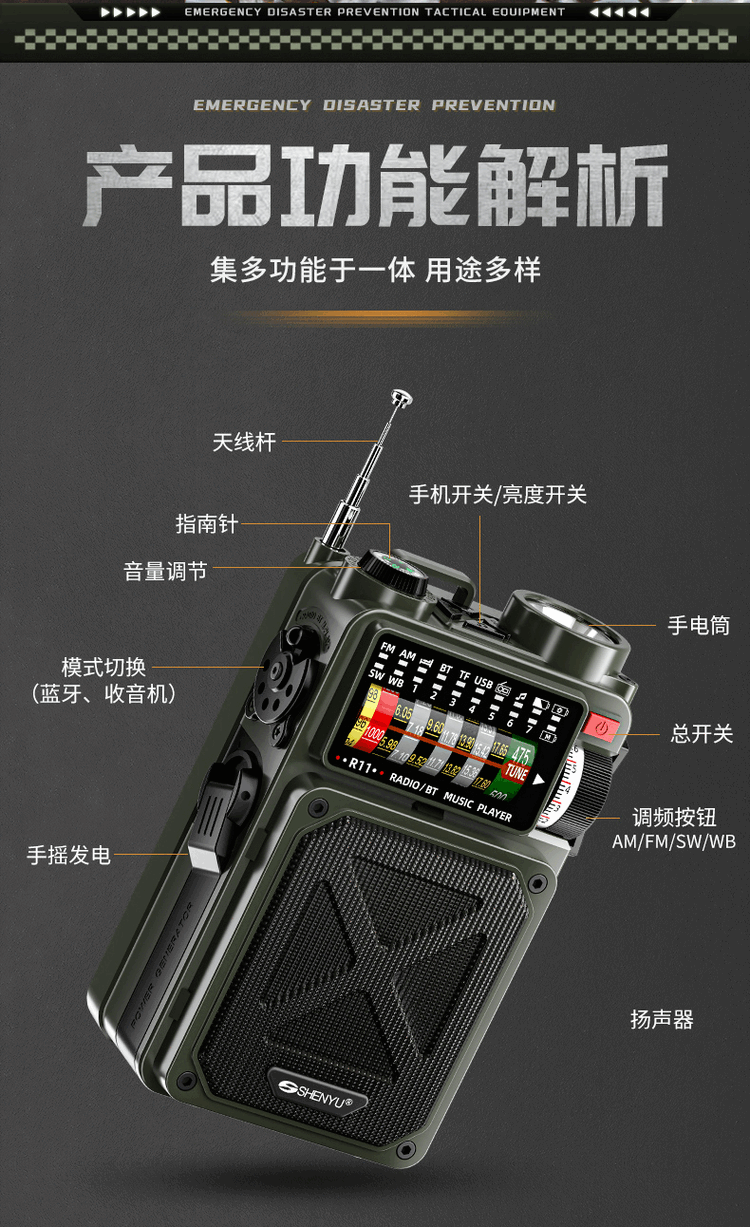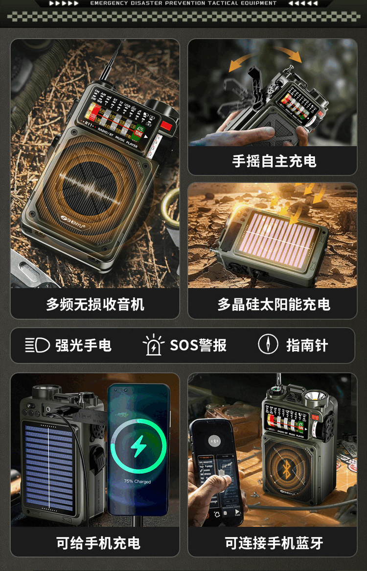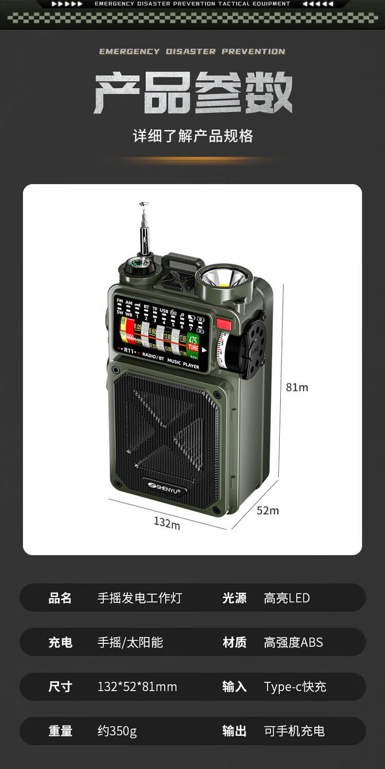 煦凛【德国】手摇发电收音机手电筒防震减灾应急多功能太阳能强光超亮 【顶配】蓝牙+指南针+SOS+可插U盘
