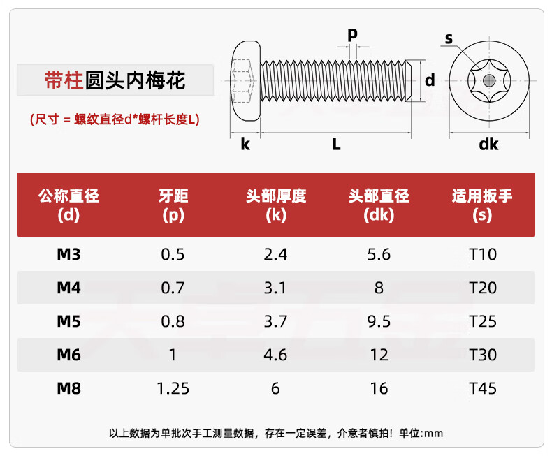 天卓五金304/316不锈钢圆头内梅花螺丝盘头带柱防盗螺钉M3M4M5M6M8 GB2672 M3配套扳手T10(8个)