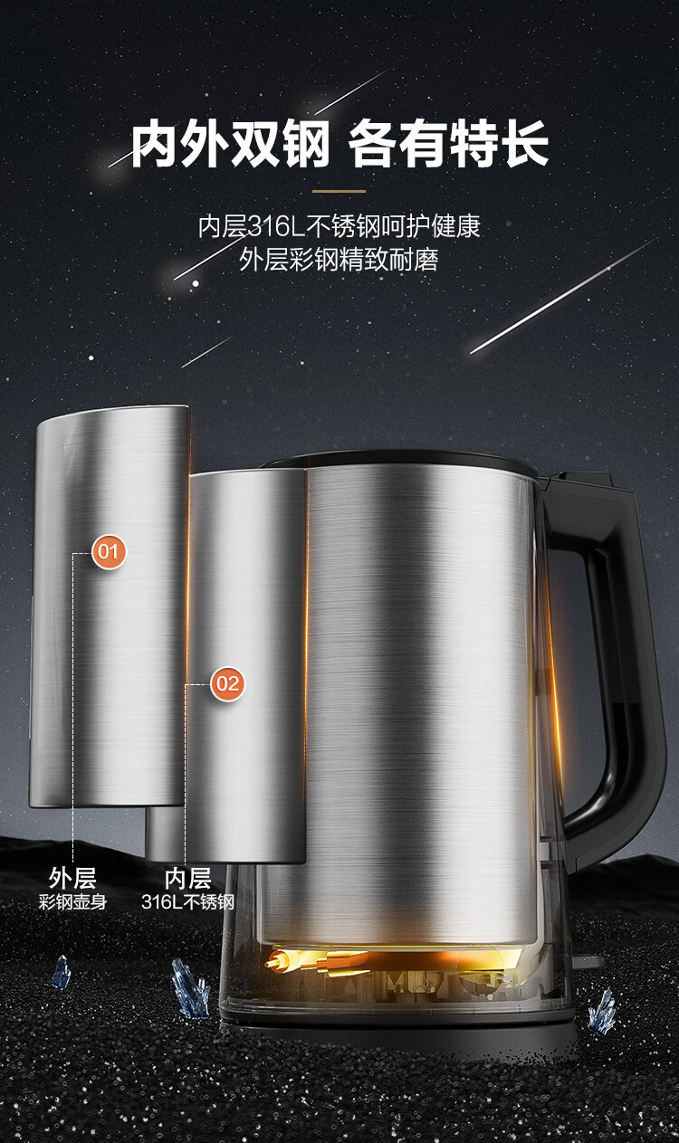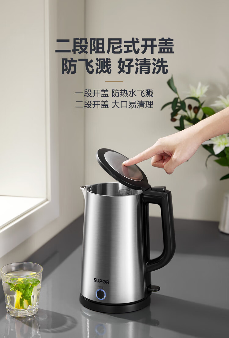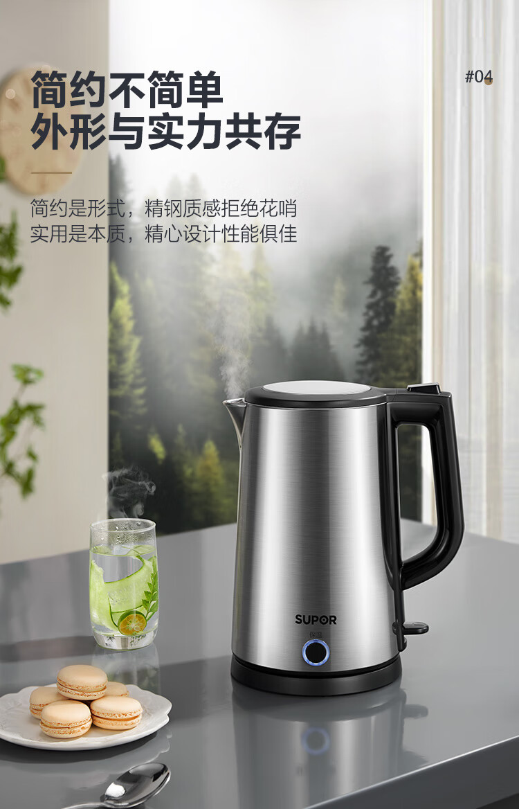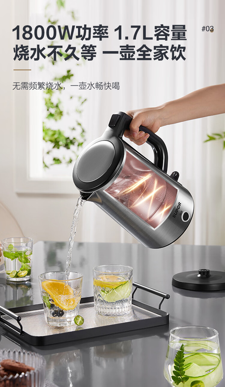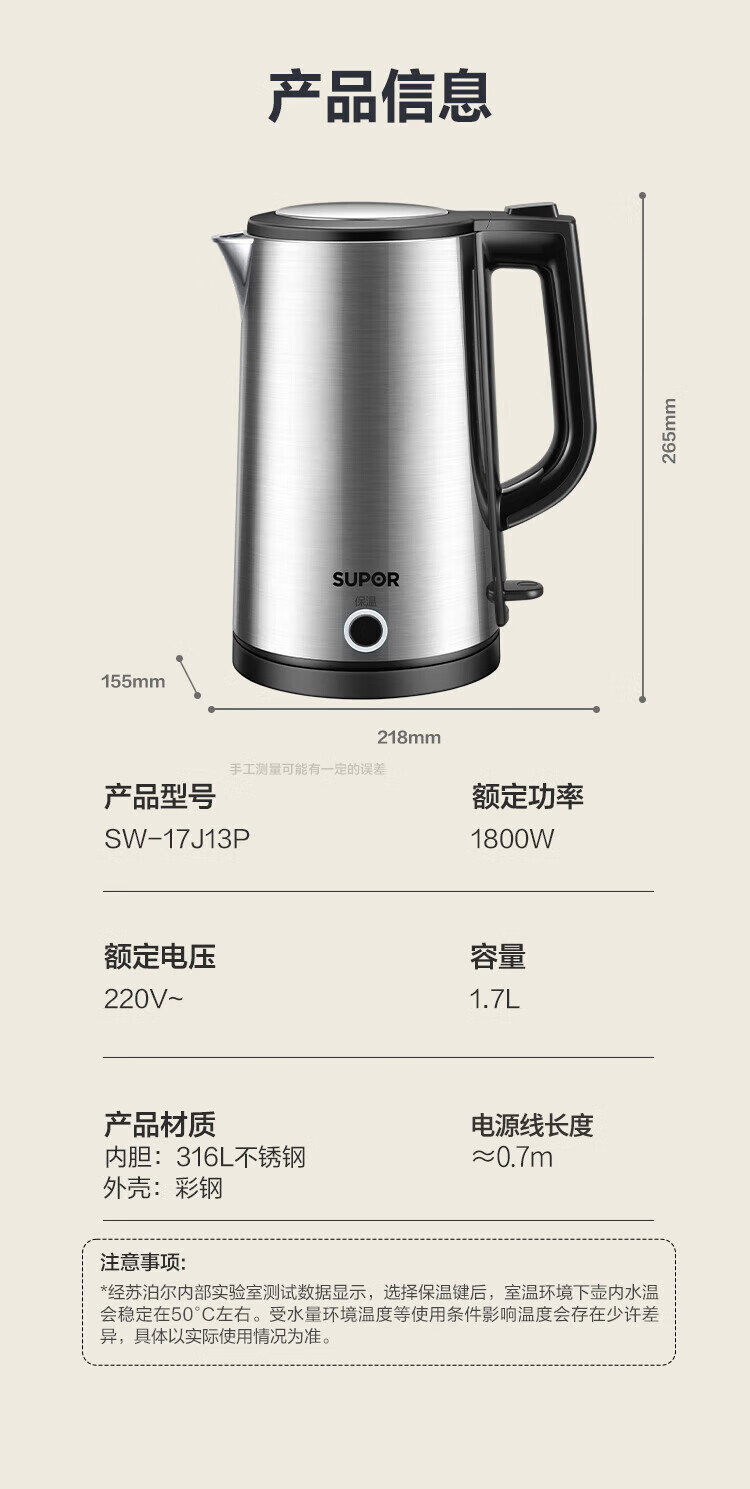 苏泊尔(SUPOR)电水壶热水壶 1.7L大容量 全钢无缝双层防烫电热水壶 316L不锈钢烧水壶 一键保温 SW-17J13P