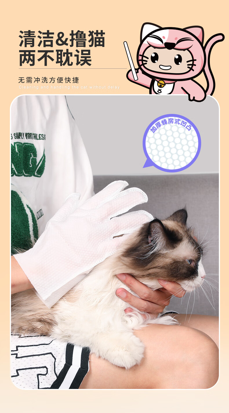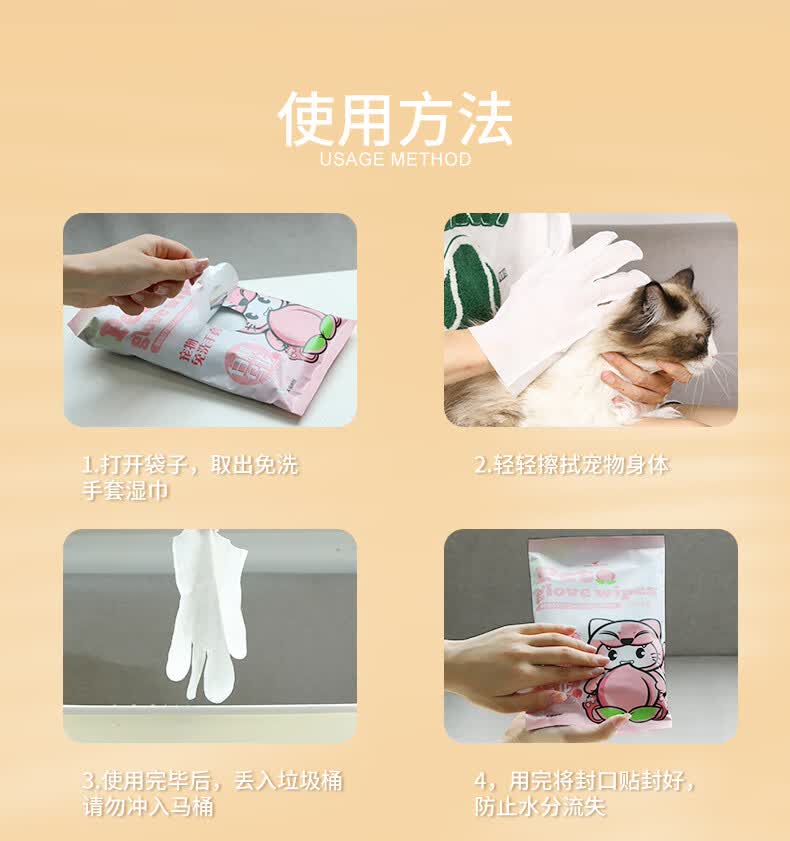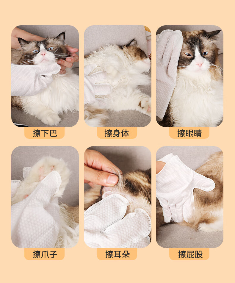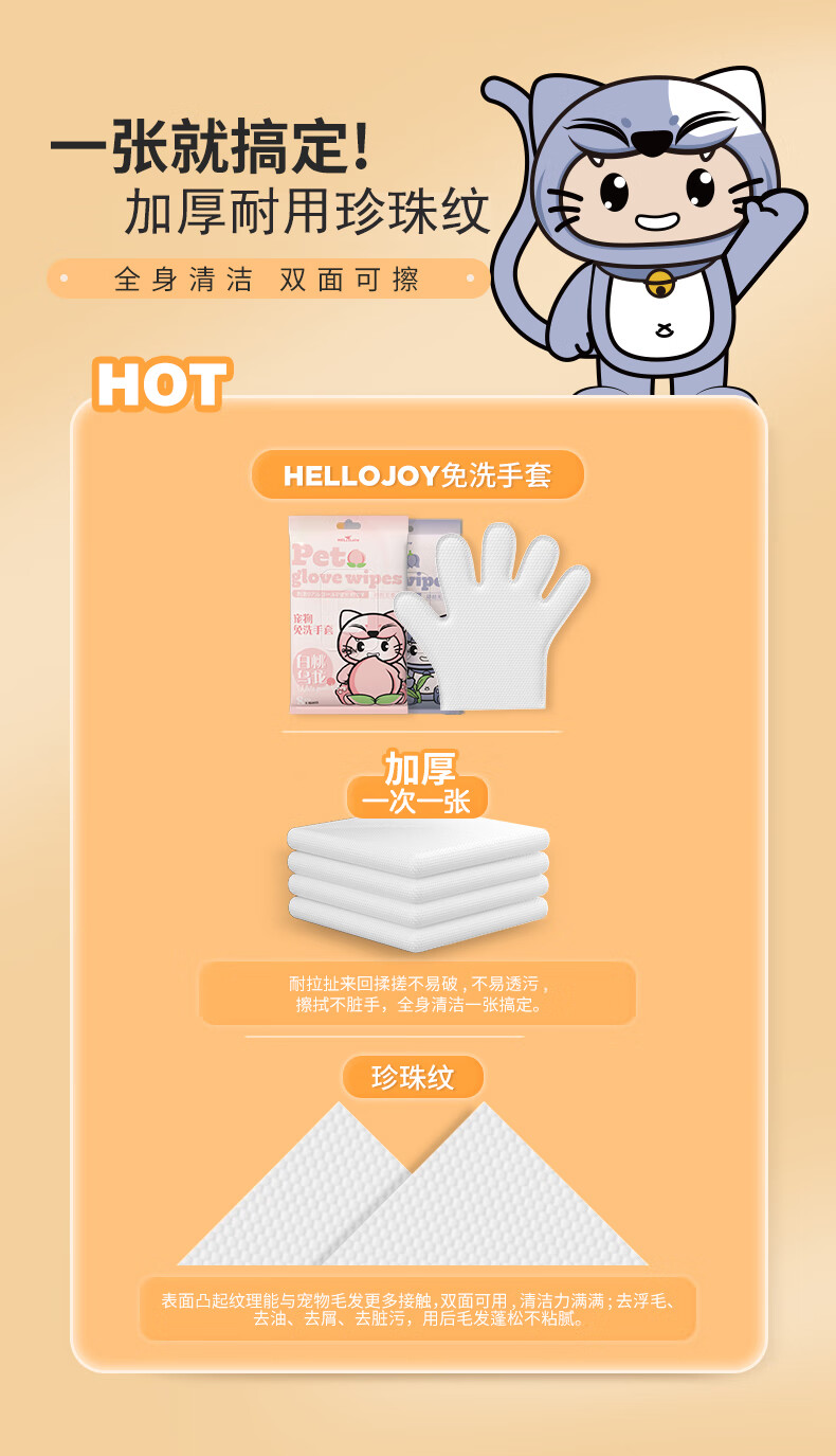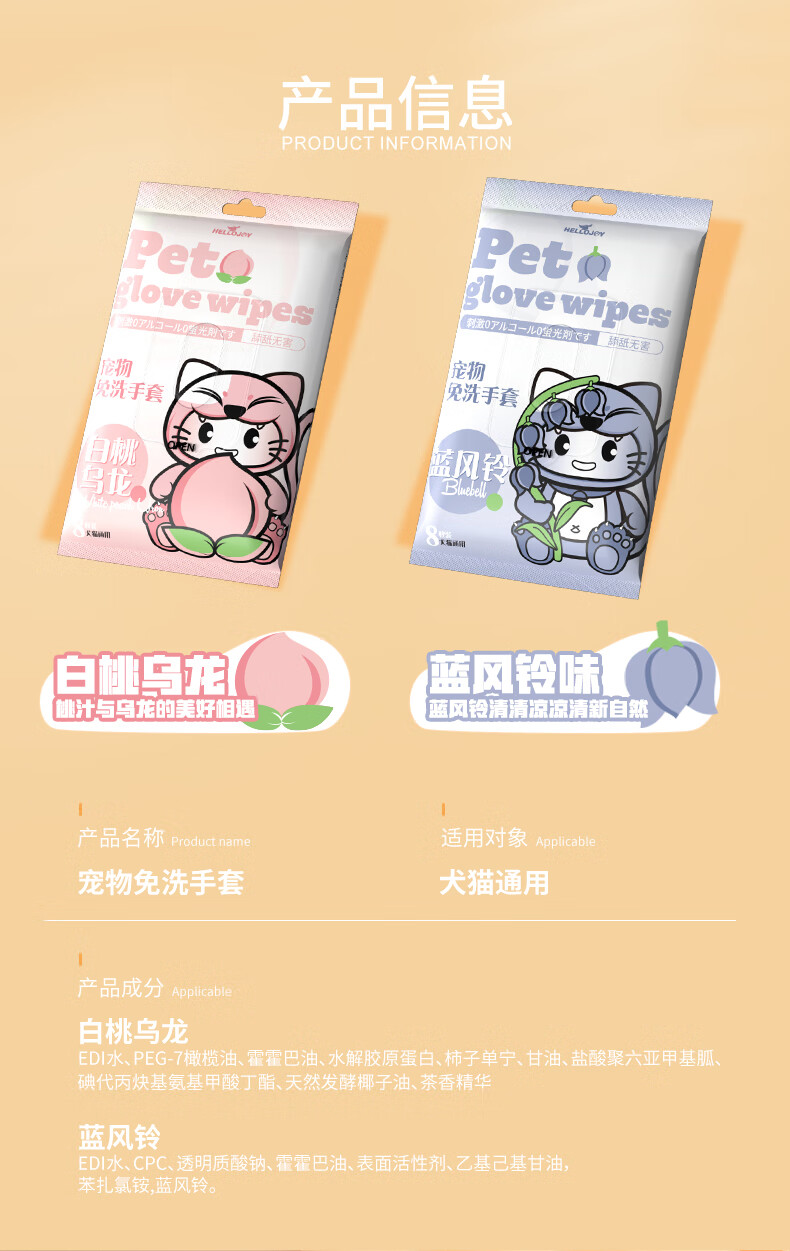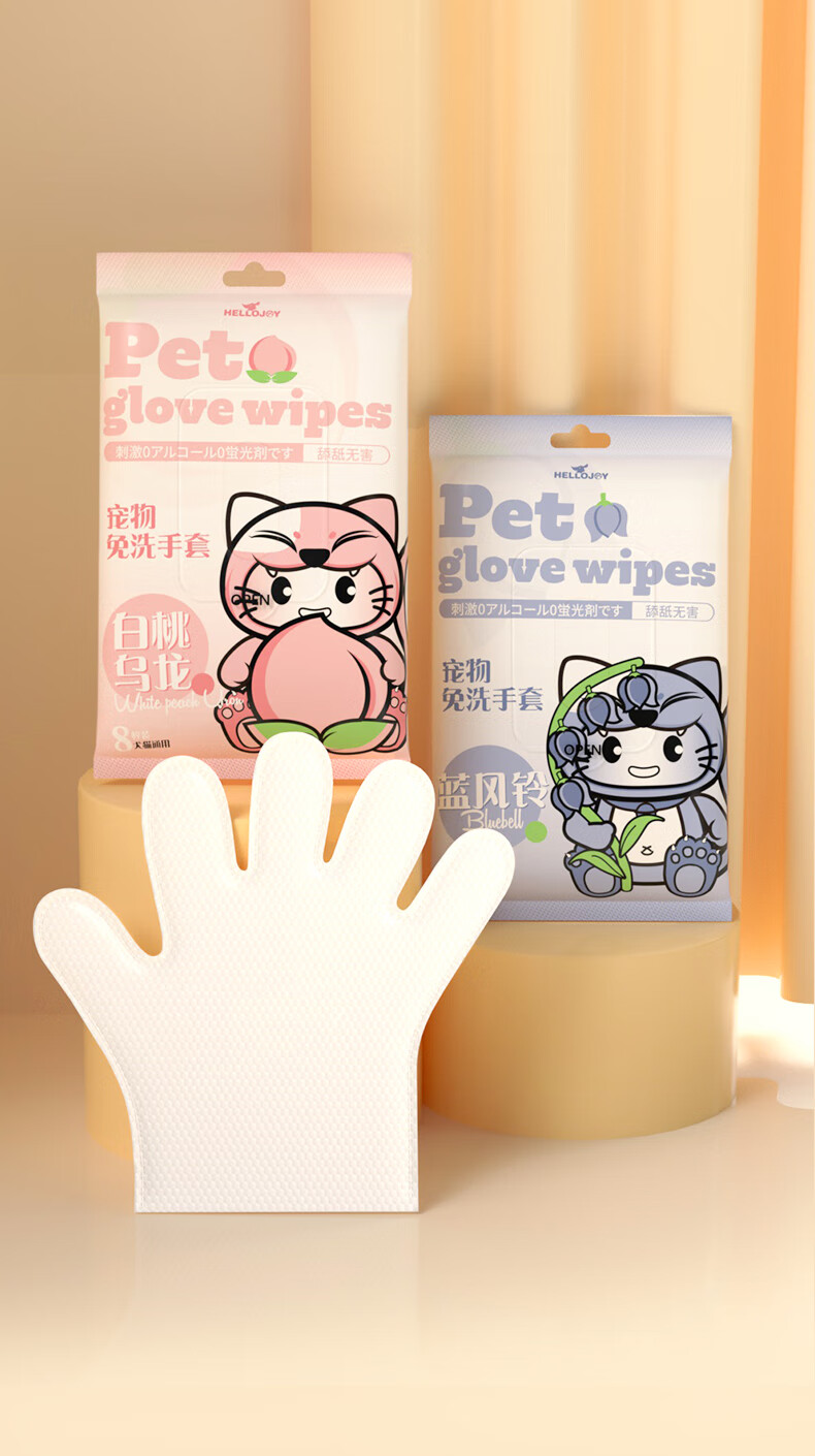 HELLOJOY宠物免洗手套幼猫去味洗澡猫咪全身清洁干洗湿巾8片装 白桃乌龙